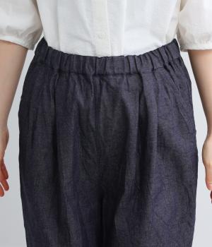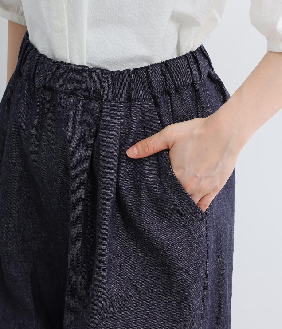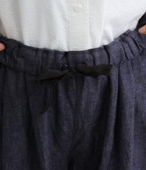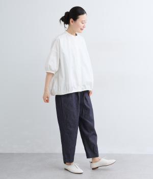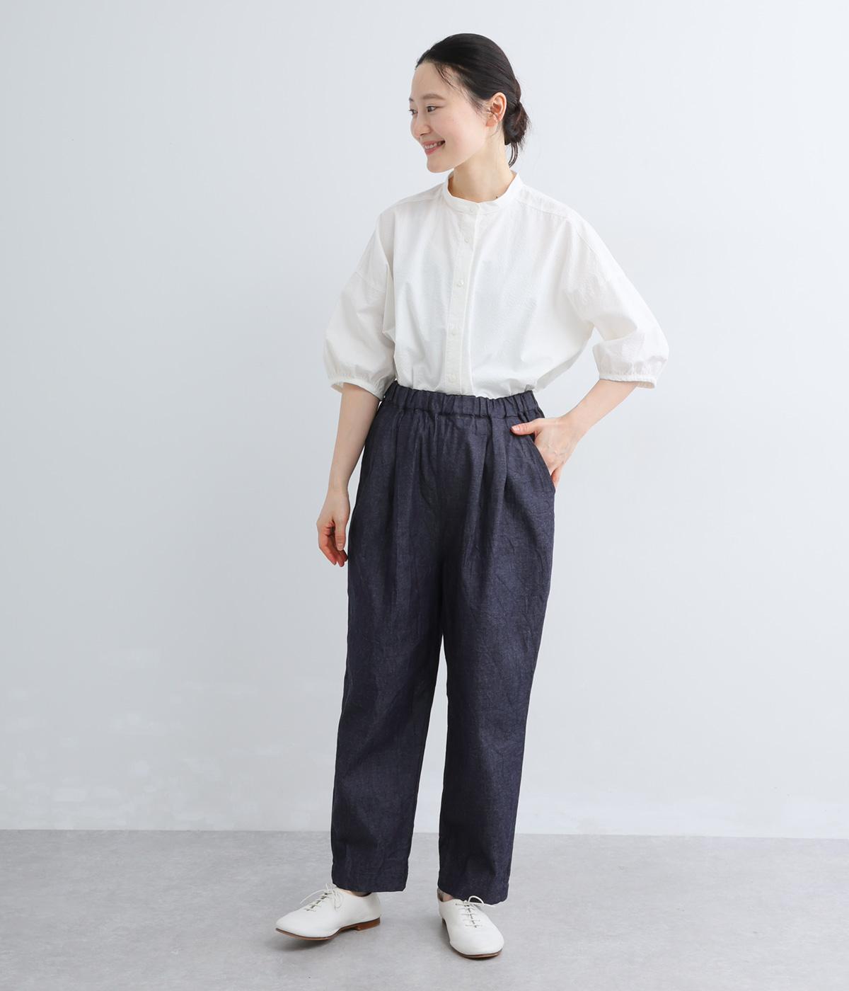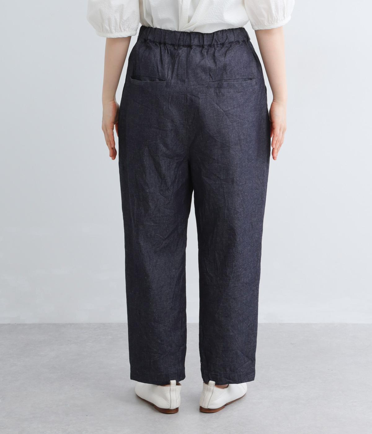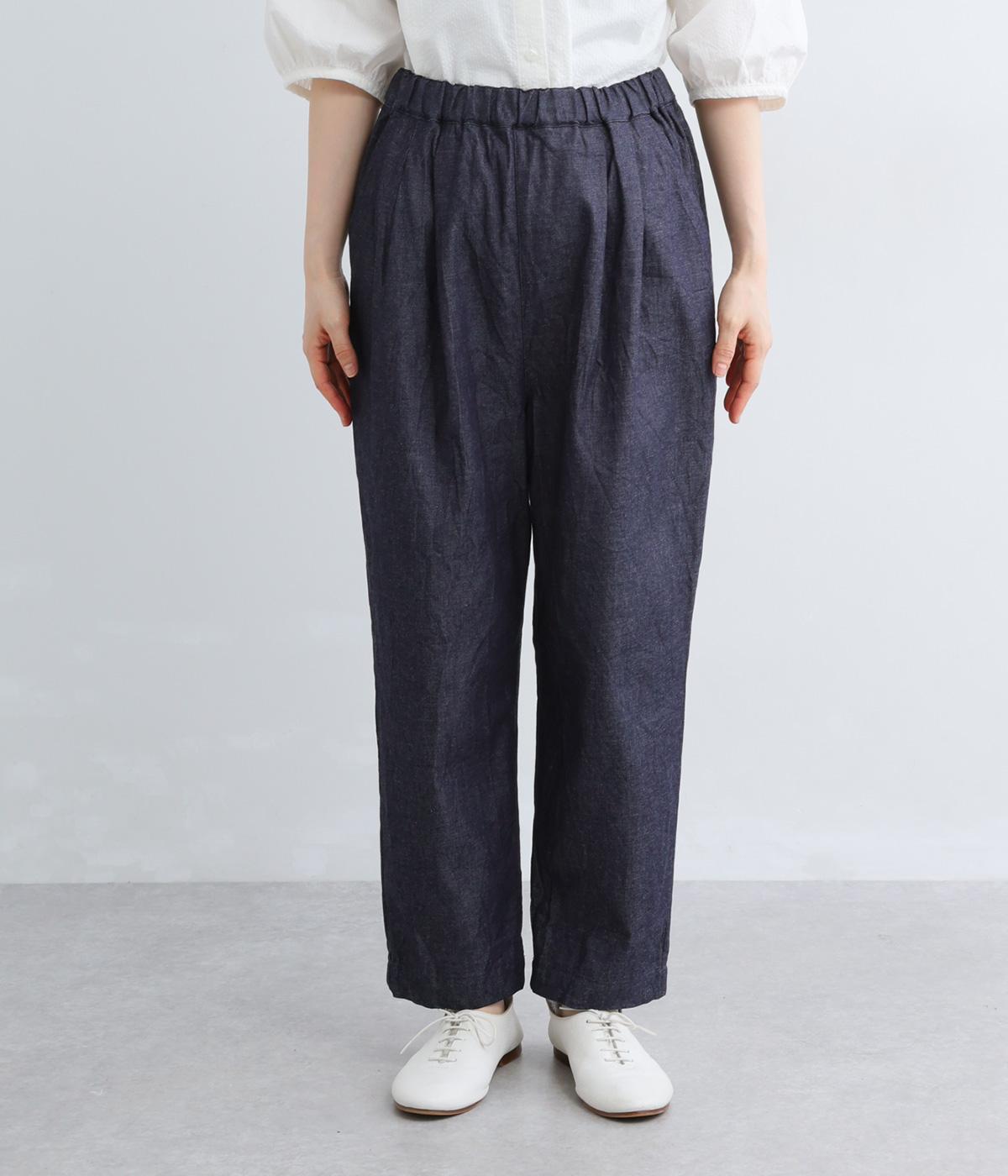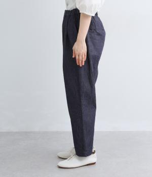 ウエストにタックを入れて腰まわりは自然な立体感をつけ、裾に向かってすっきりとまとめたテーパードパンツ。シューズ合わせがたのしめる気持ちのいい丈感も◎。ウエストはぐるりとゴムを入れたイージー仕様。調整紐つきでフィット感も抜群です。