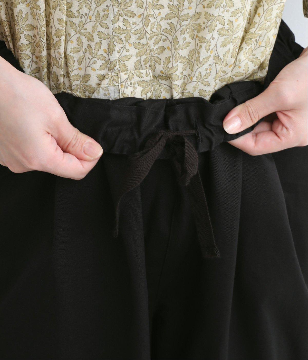 切り替えを利用した後ろポケットが特徴的なデザイン。前はタックを入れて腰まわりはゆったりと、裾はすっきりとしたテーパードシルエットに仕立てました。ウエストは総ゴムでストレスを軽減し、内紐入りでフィット感の微調整も可能です。