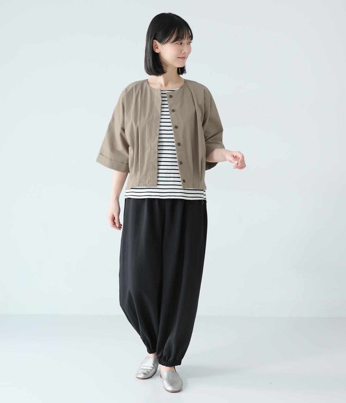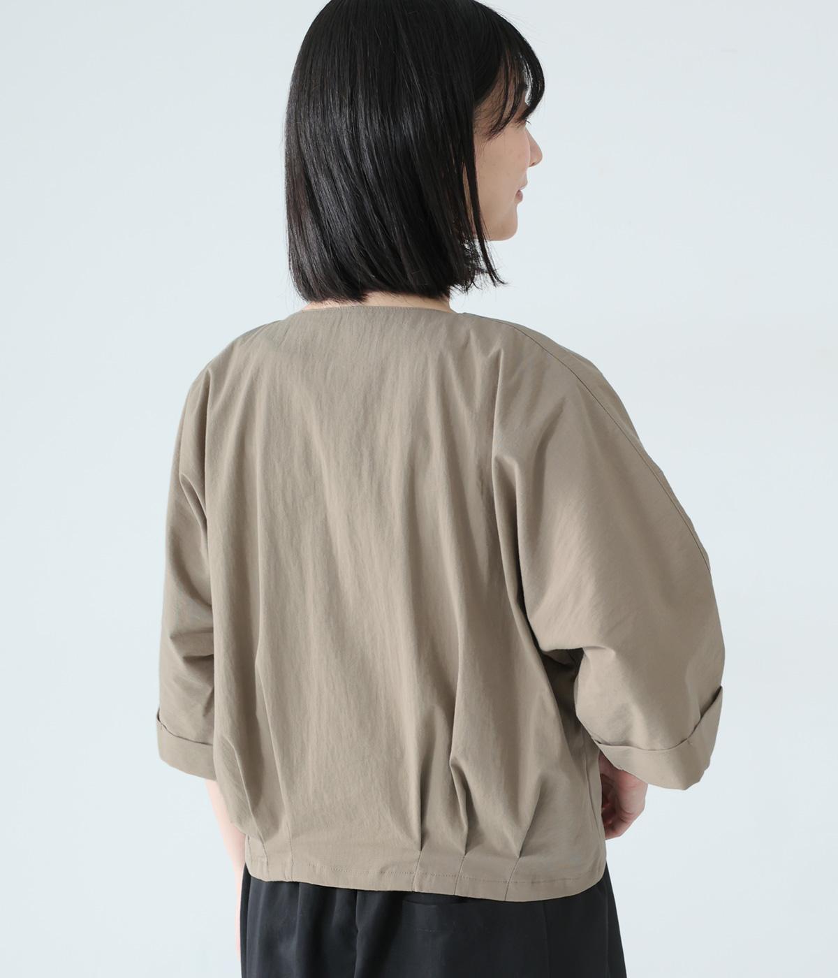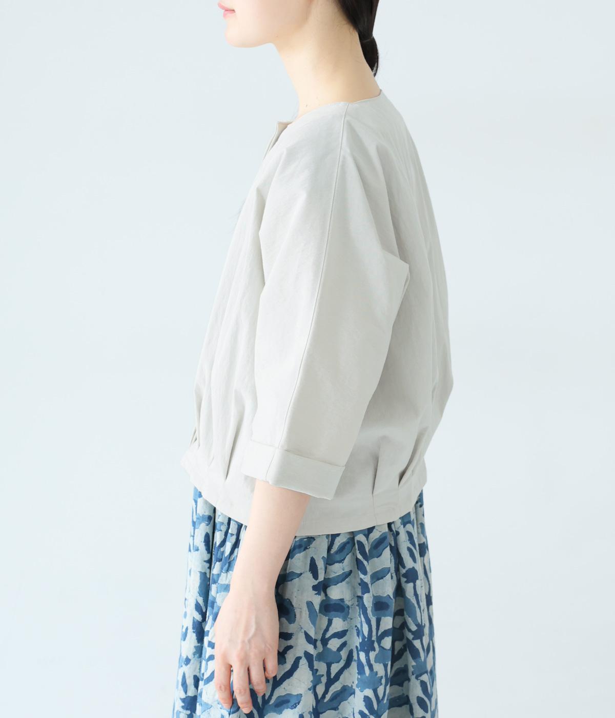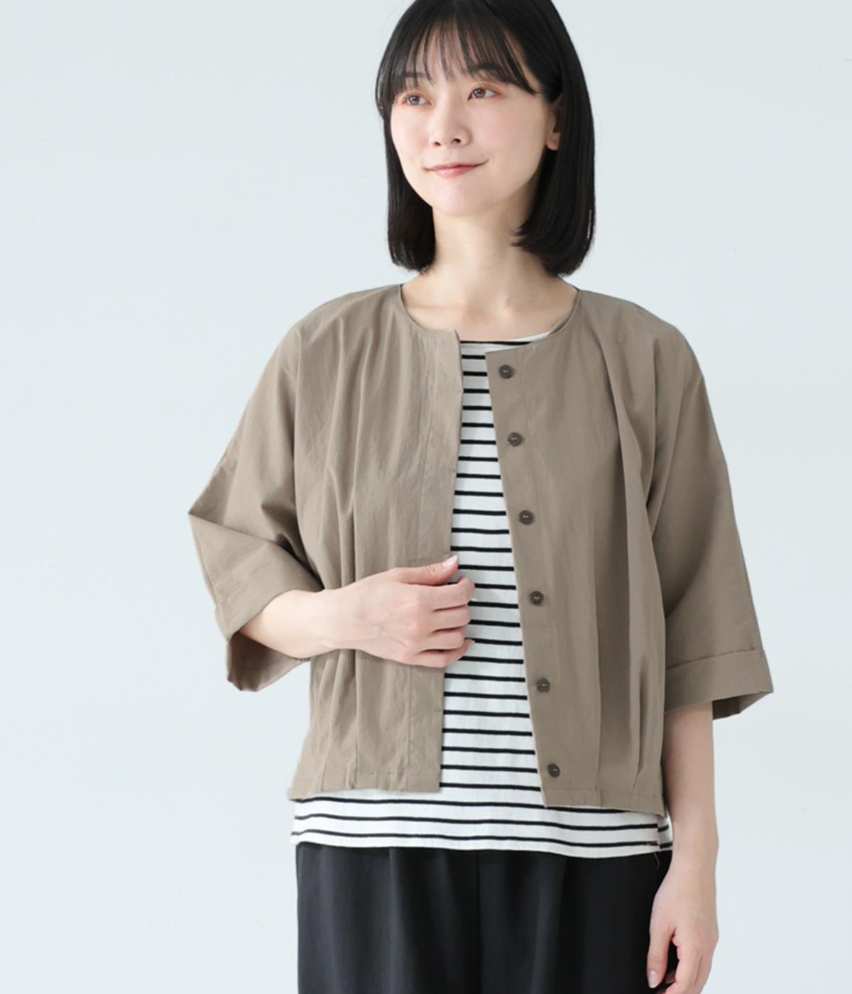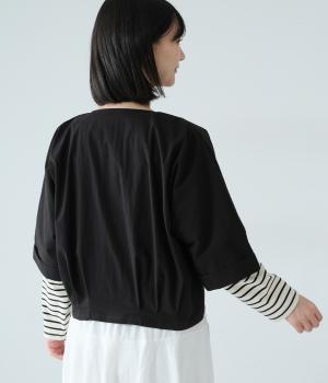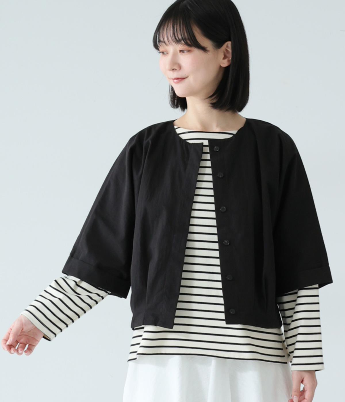 ゆったりとしたドルマンスリーブの七分袖ジャケット。比翼仕立てのフロントがすっきりとした印象を添え、裾にほどこしたタックがやわらかな立体感を生み出します。ほどよいゆとりで、軽やかに羽織れます。