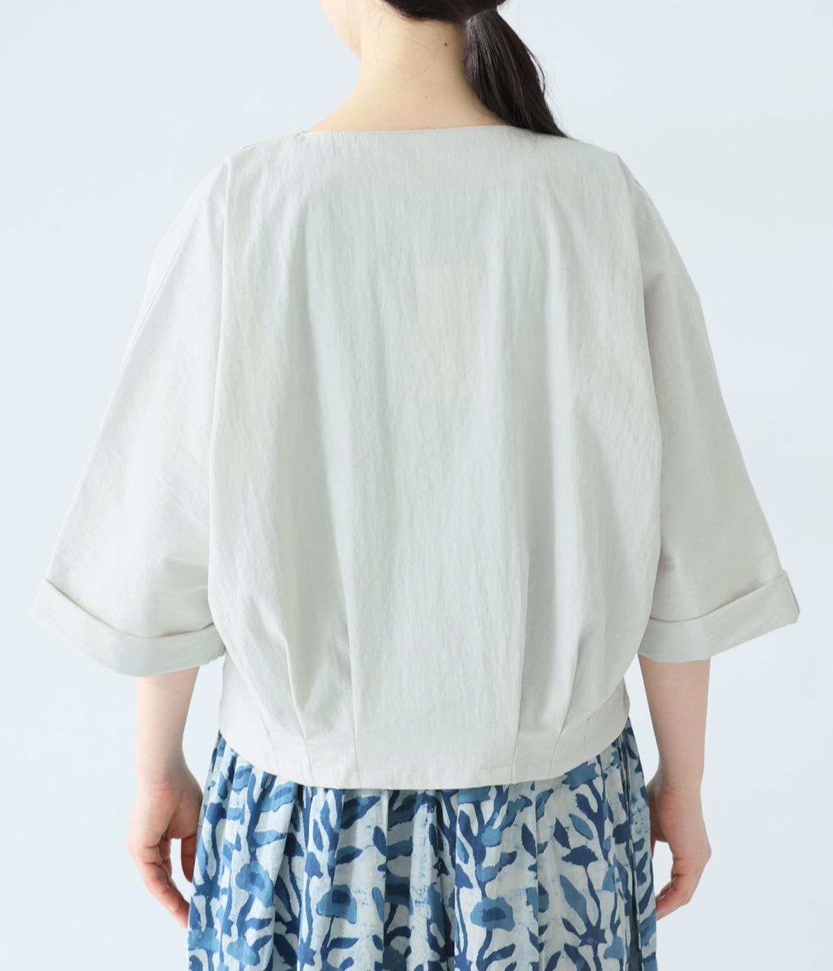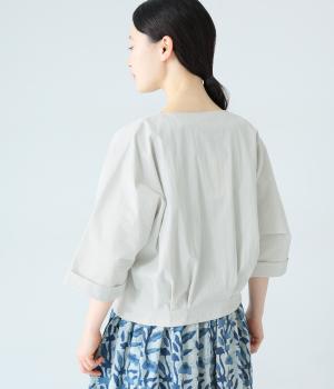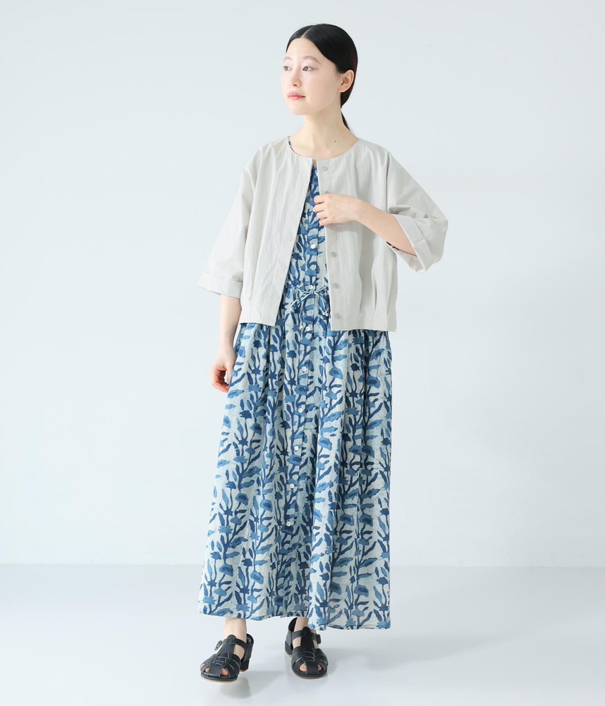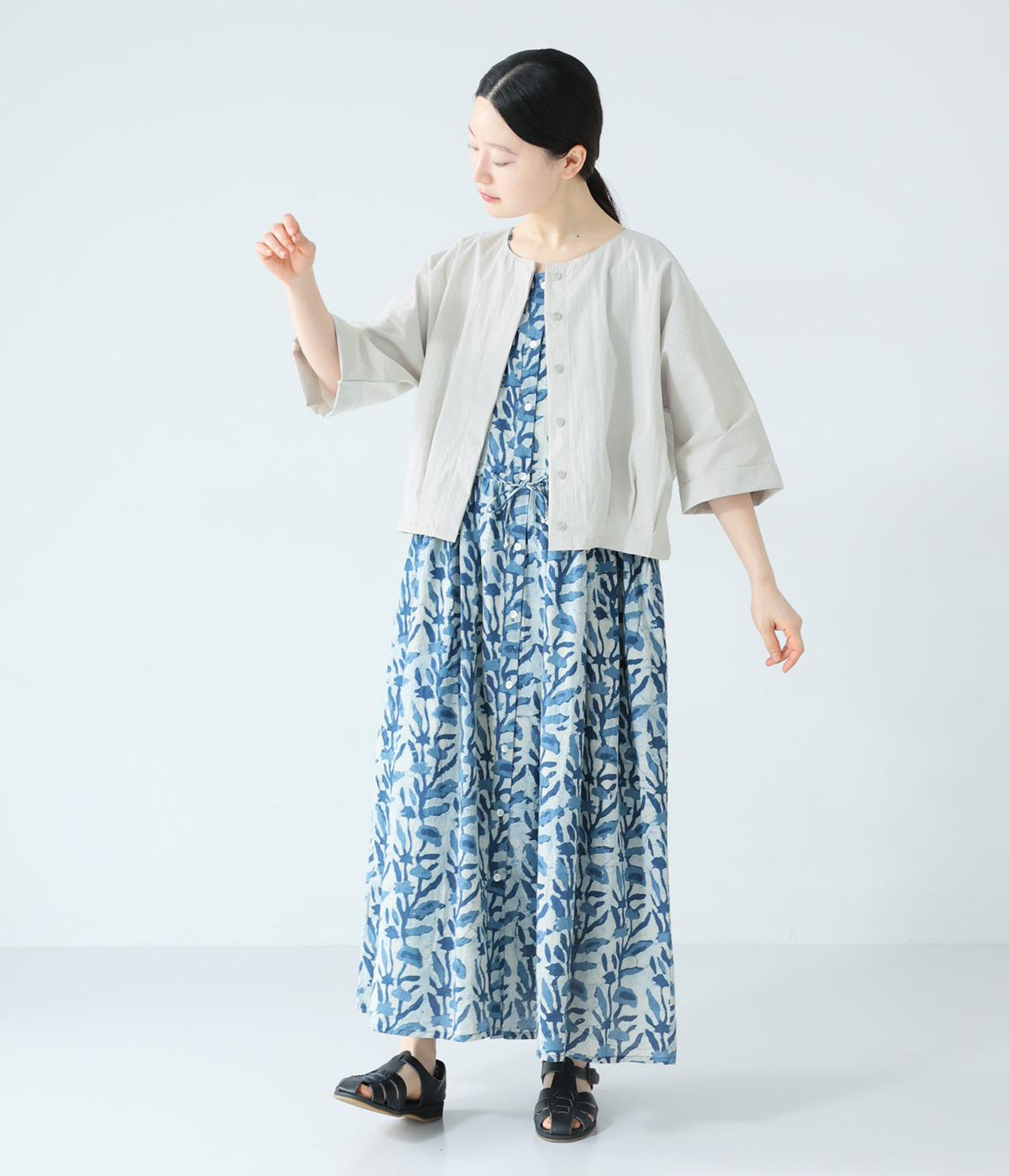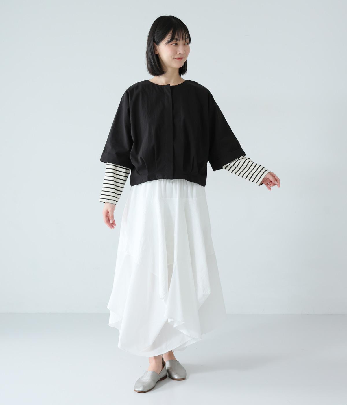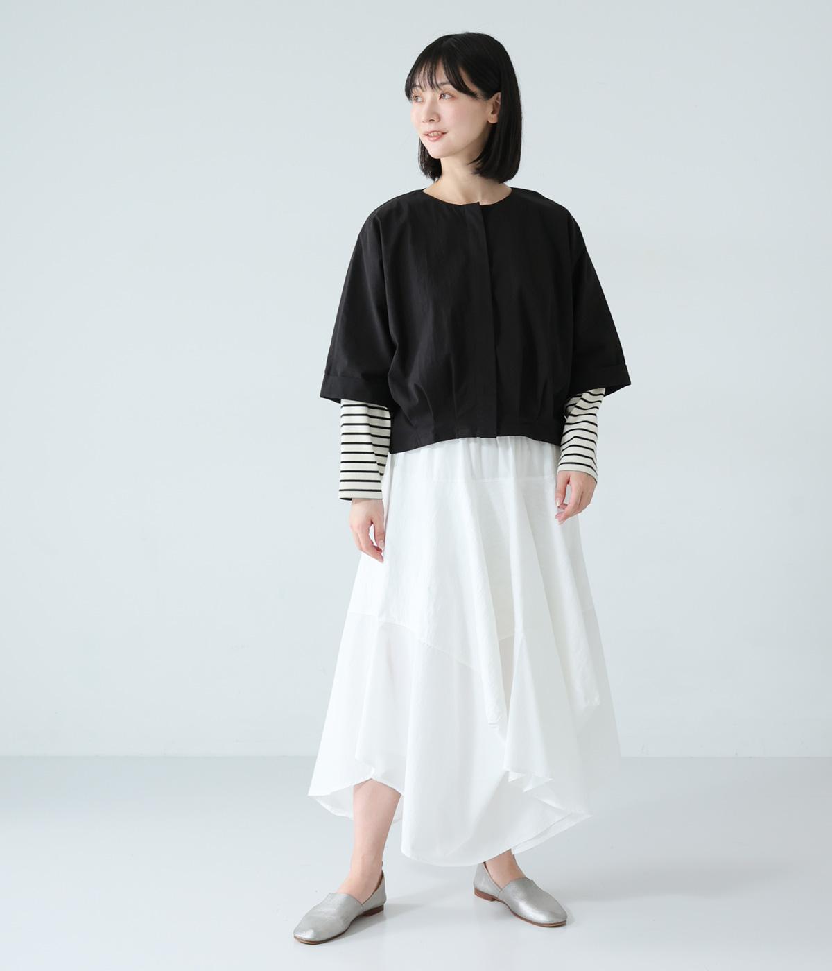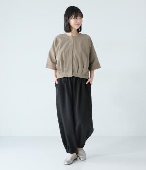 ゆったりとしたドルマンスリーブの七分袖ジャケット。比翼仕立てのフロントがすっきりとした印象を添え、裾にほどこしたタックがやわらかな立体感を生み出します。ほどよいゆとりで、軽やかに羽織れます。