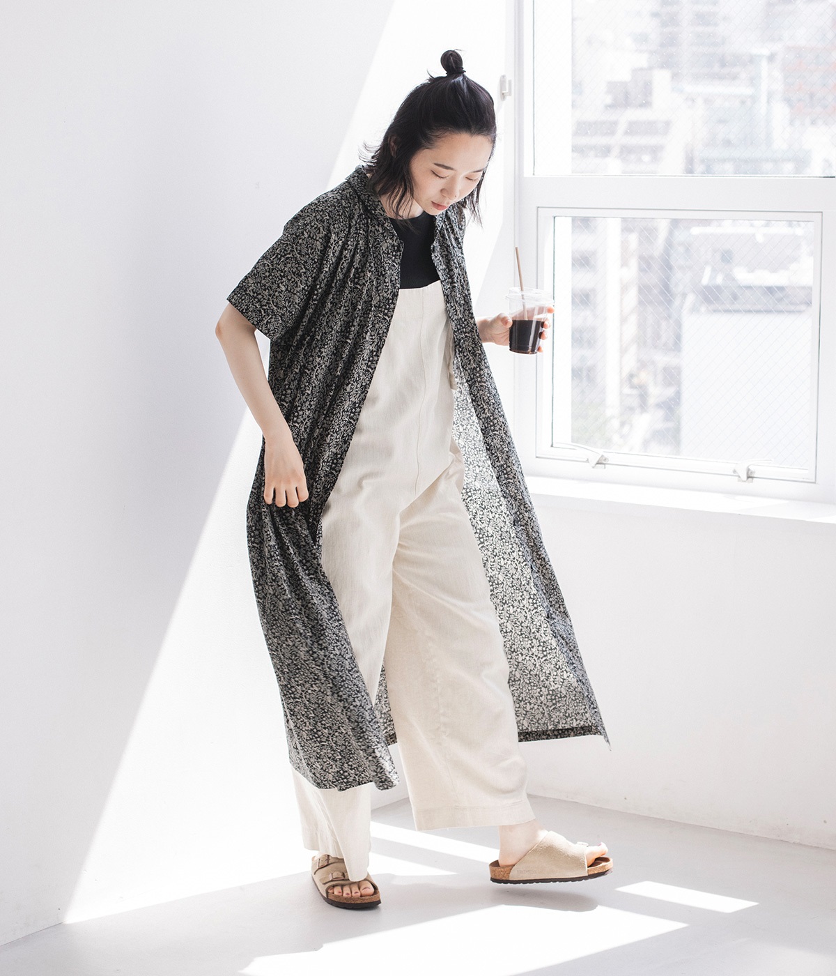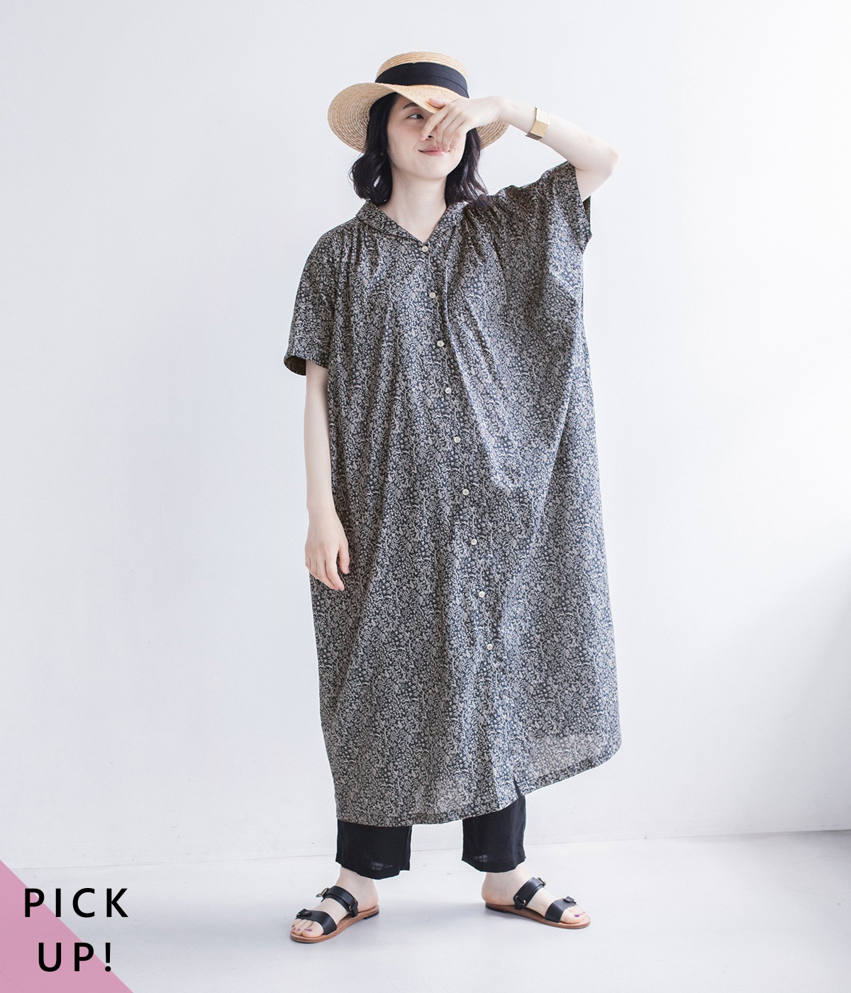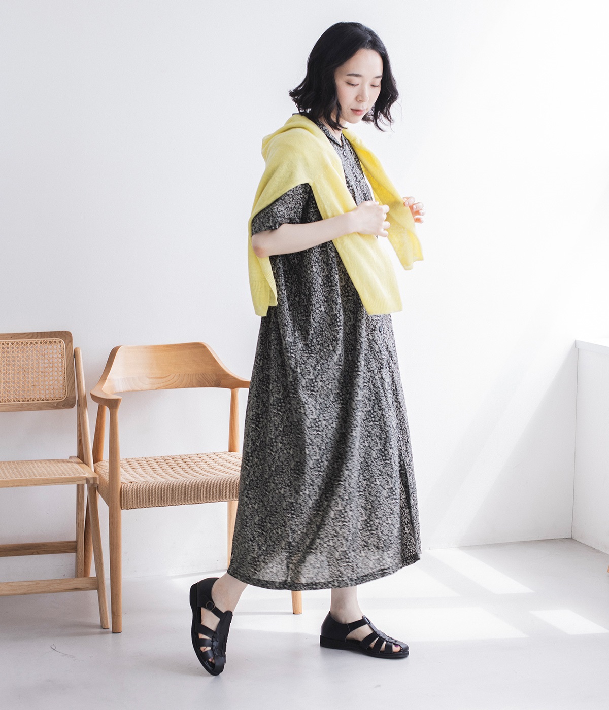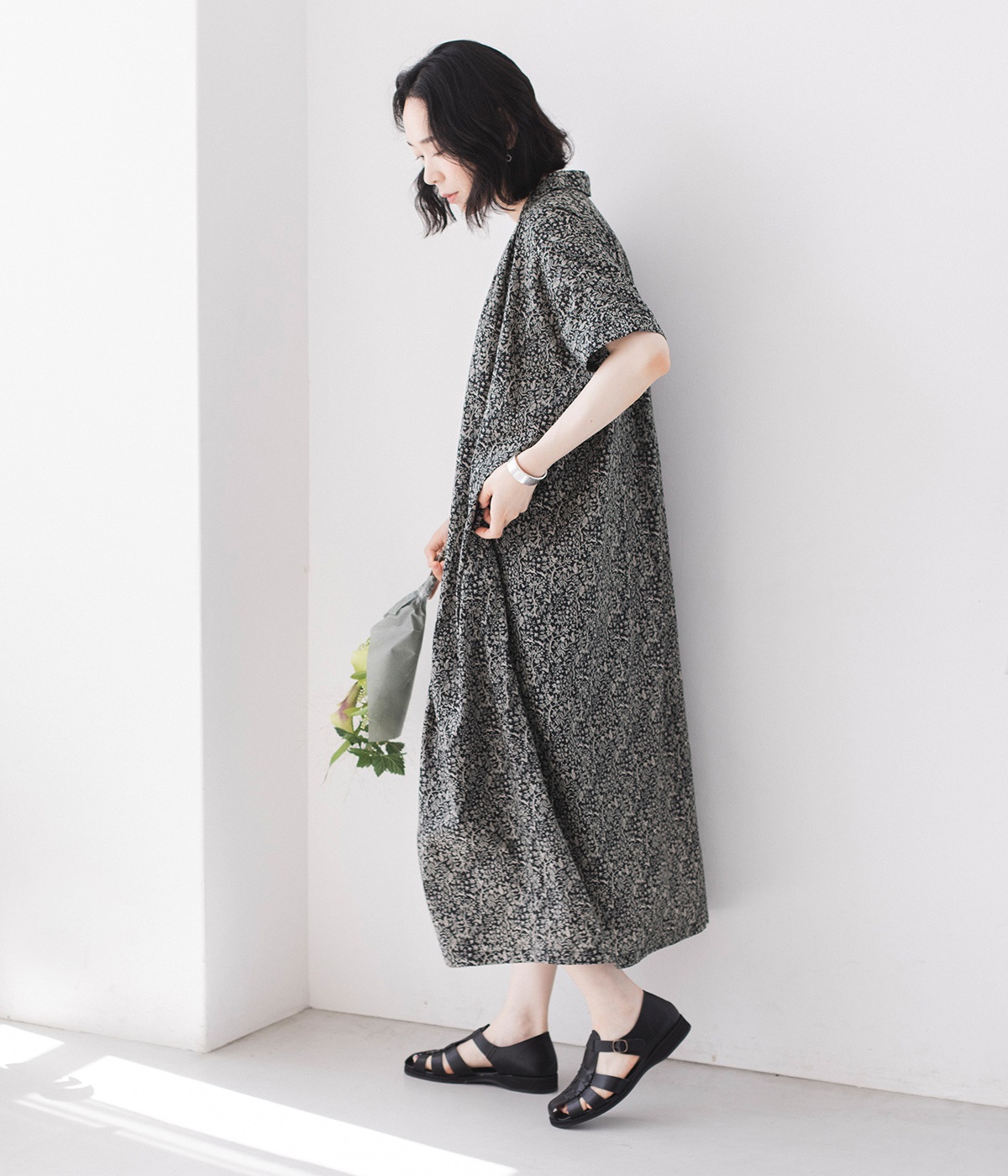洗練された印象の<ブラック>をシンプルに一枚で着こなしました。主張しすぎないすっと馴染む柄に、レザーサンダルを合わせた上品な装い。透け感を気にせず着られるところもうれしいポイントです。