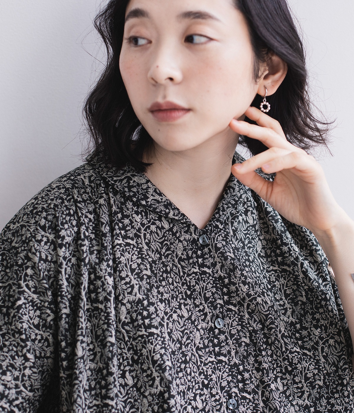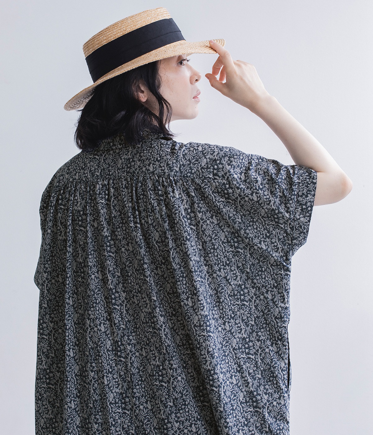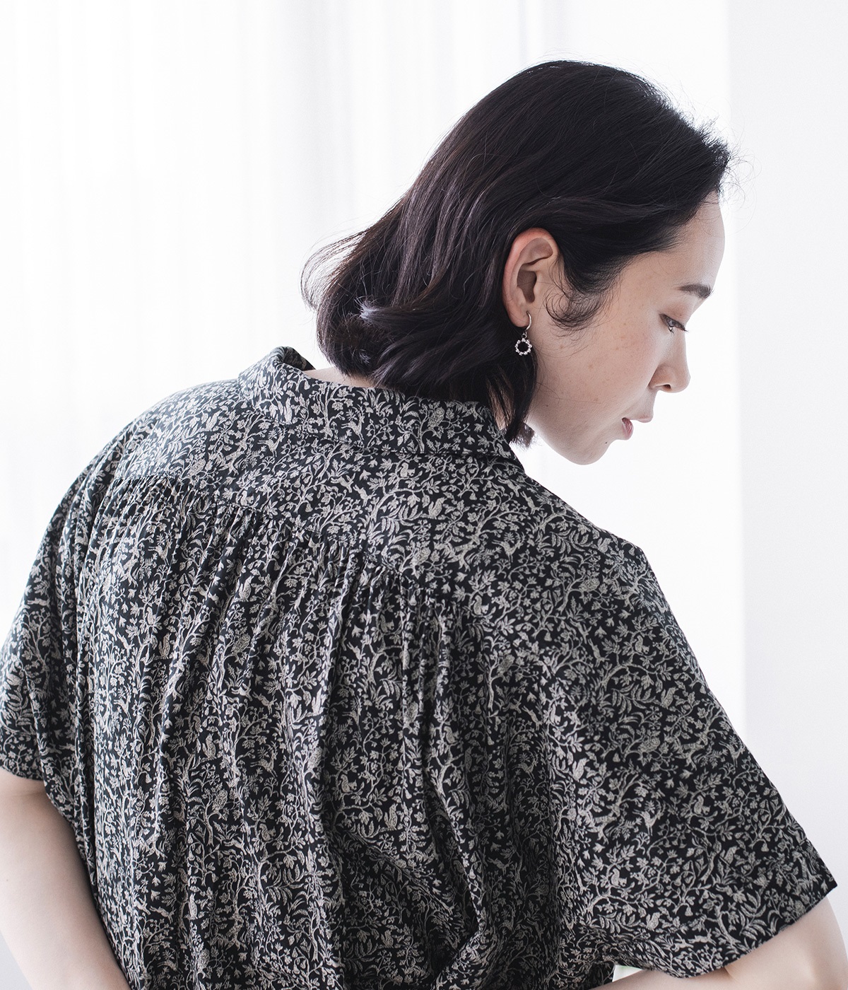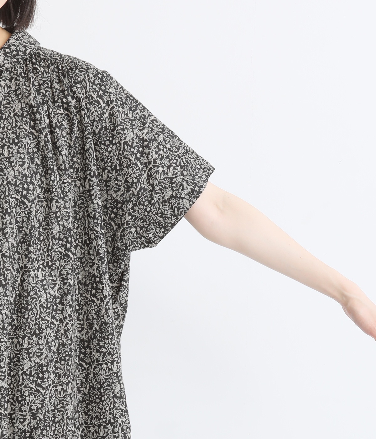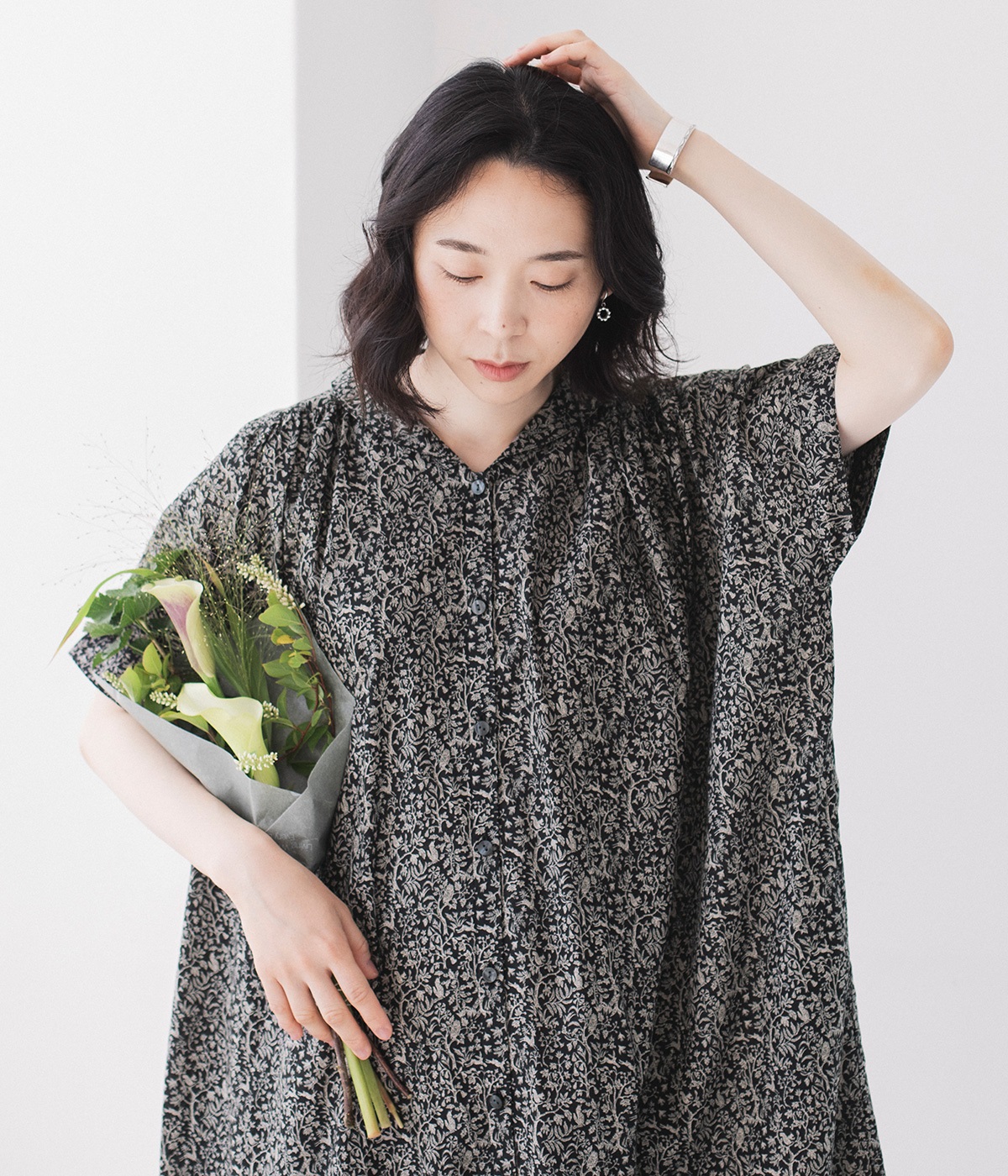 洗練された印象の<ブラック>をシンプルに一枚で着こなしました。主張しすぎないすっと馴染む柄に、レザーサンダルを合わせた上品な装い。透け感を気にせず着られるところもうれしいポイントです。