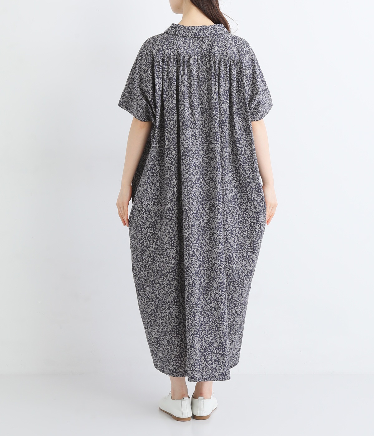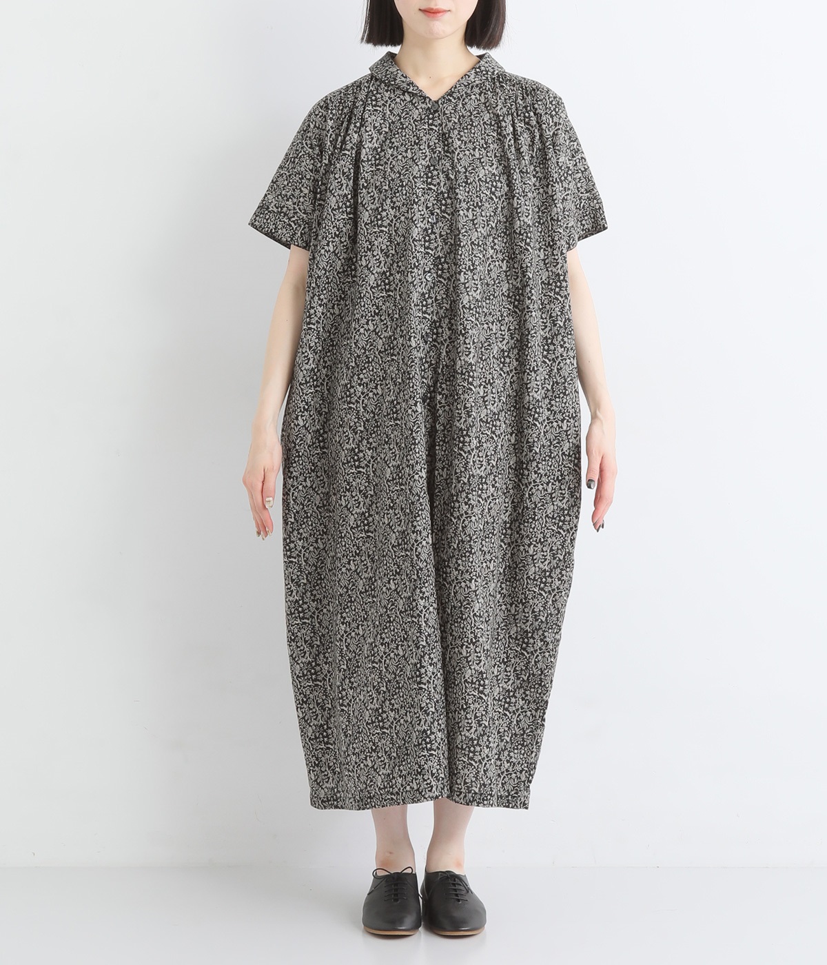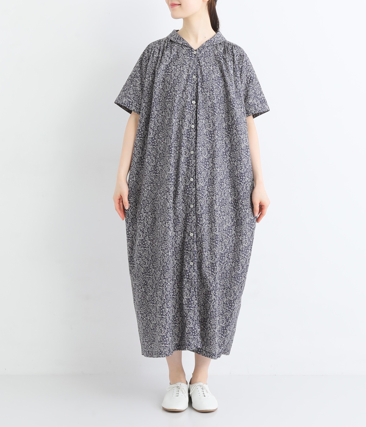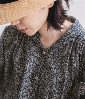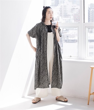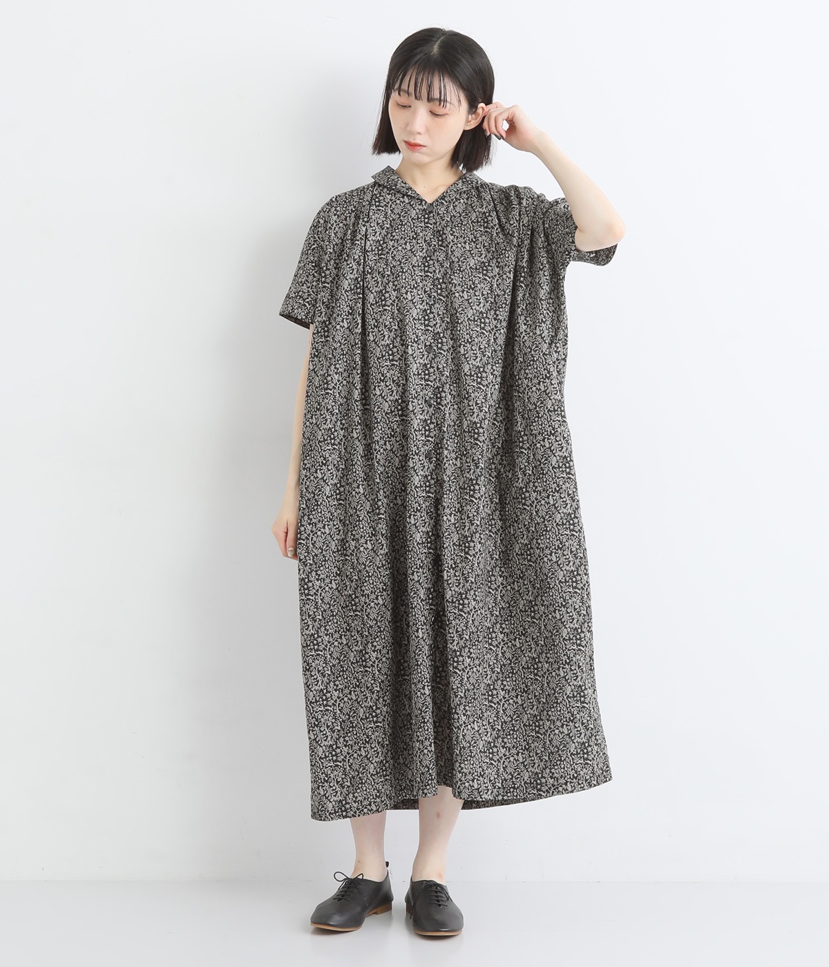 柄物が苦手な方も手に取りやすい控えめな配色が、大人の装いにすっと馴染みます。さらりと軽い肌触りで、真夏に活躍するワンピースです。