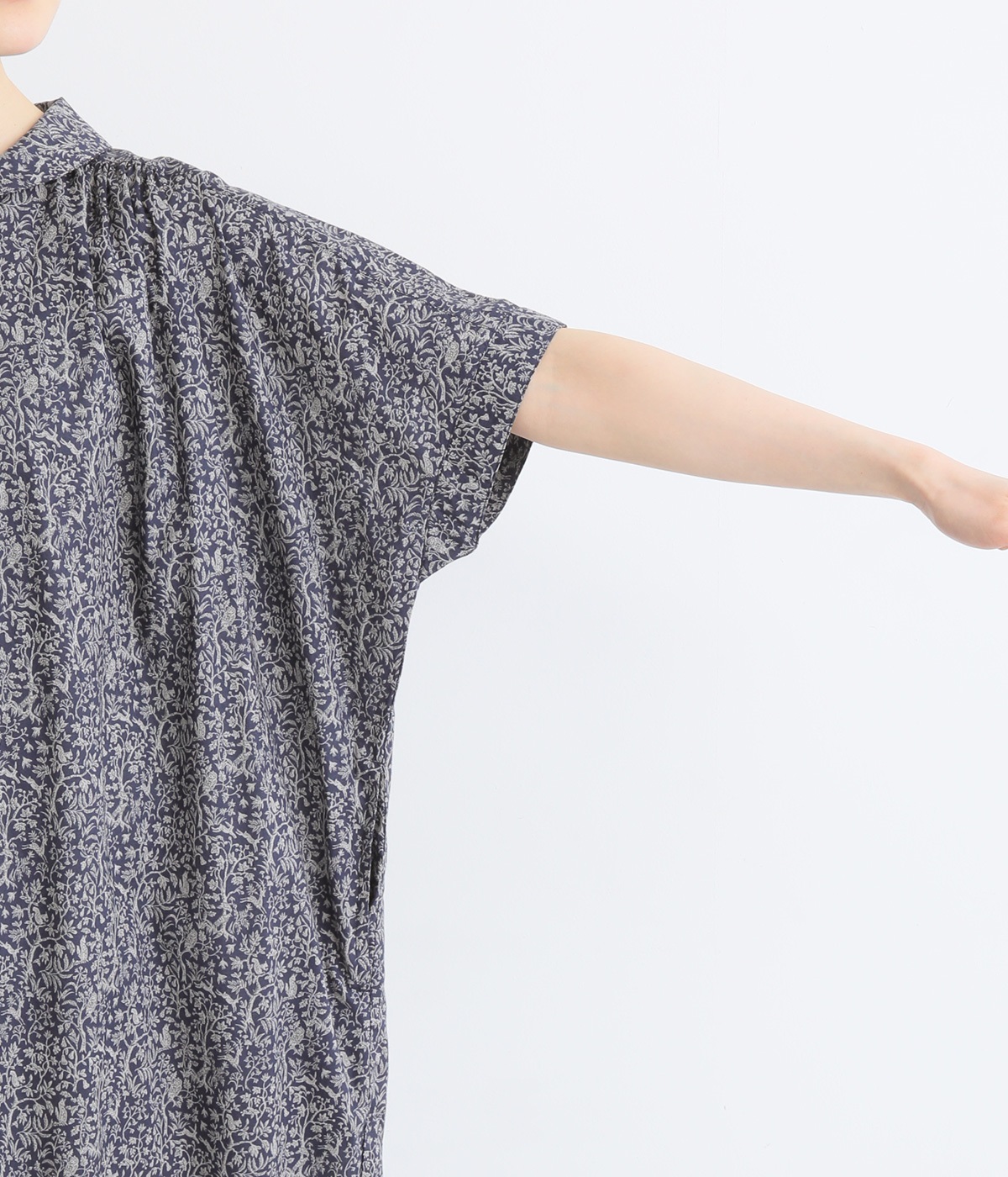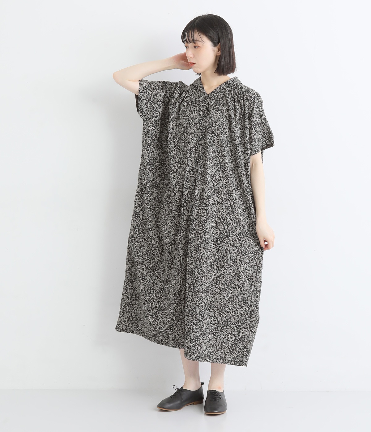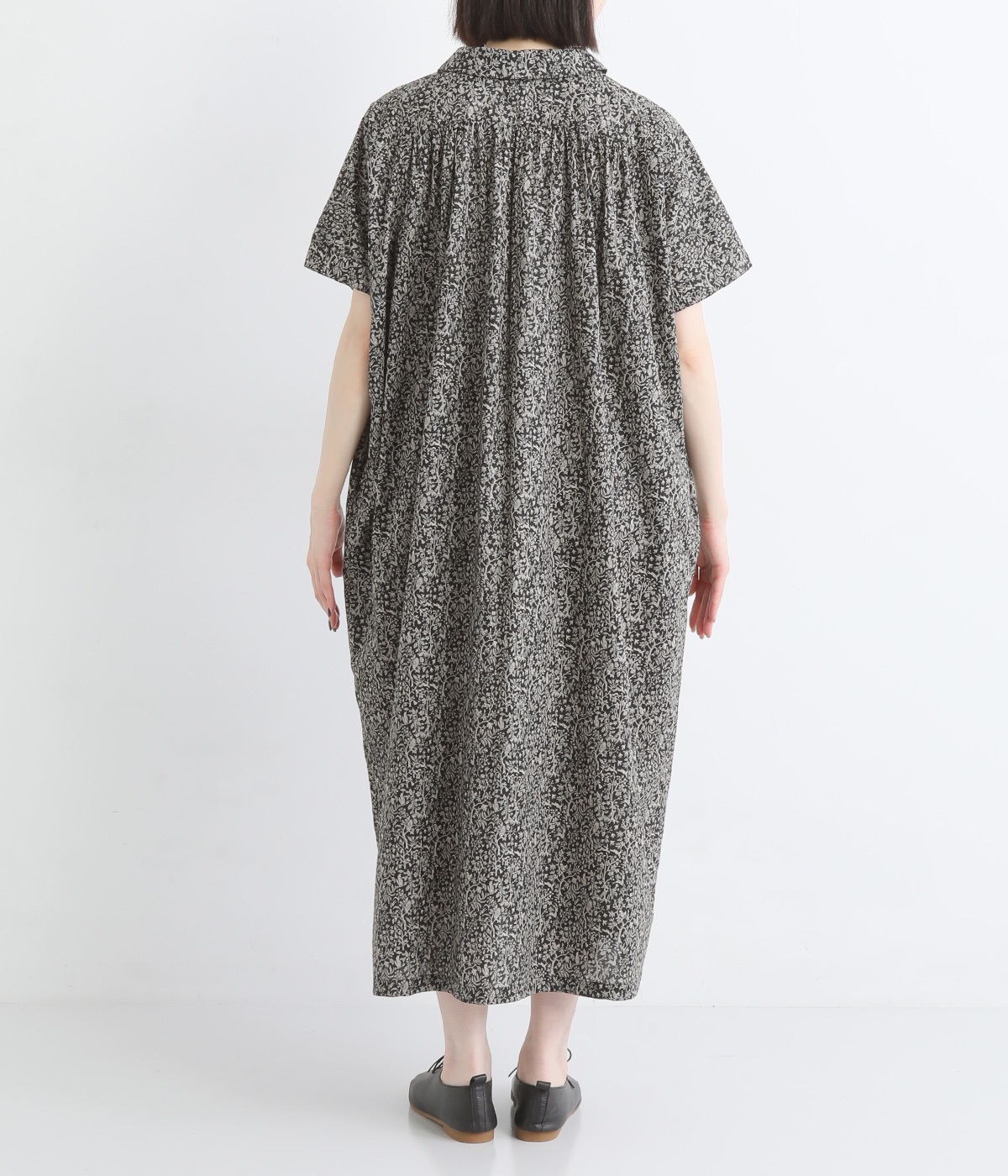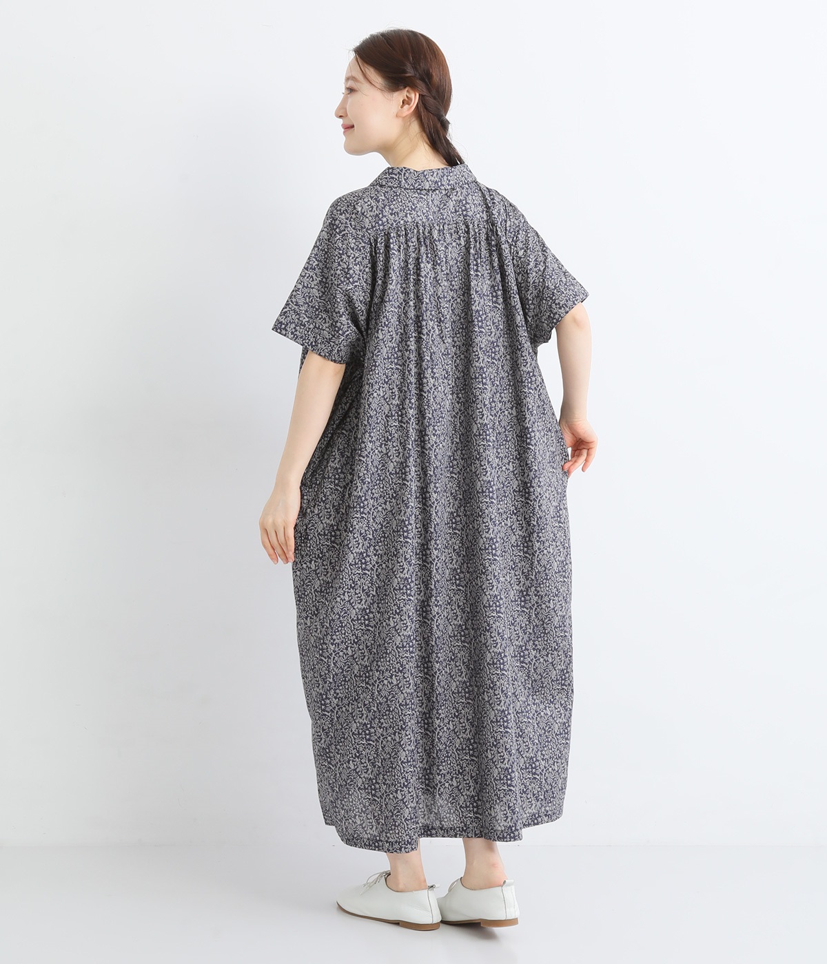 柄物が苦手な方も手に取りやすい控えめな配色が、大人の装いにすっと馴染みます。さらりと軽い肌触りで、真夏に活躍するワンピースです。
