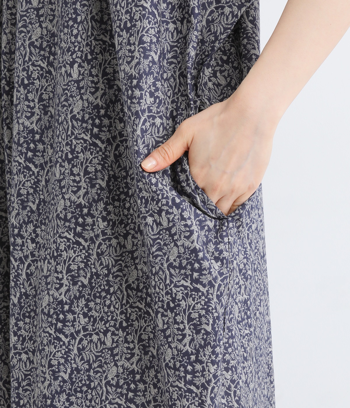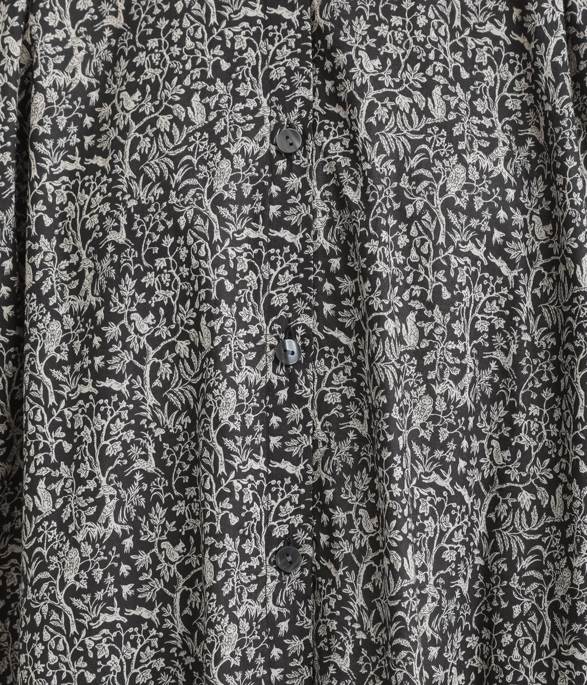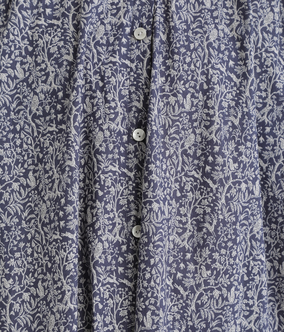 落ち着いた雰囲気ながらも、木や花の間をよく見るとたくさんの動物たちが描かれた、遊び心のあるデザイン。可愛らしく穏やかな柄は、着るだけで心地良さをもたらします。