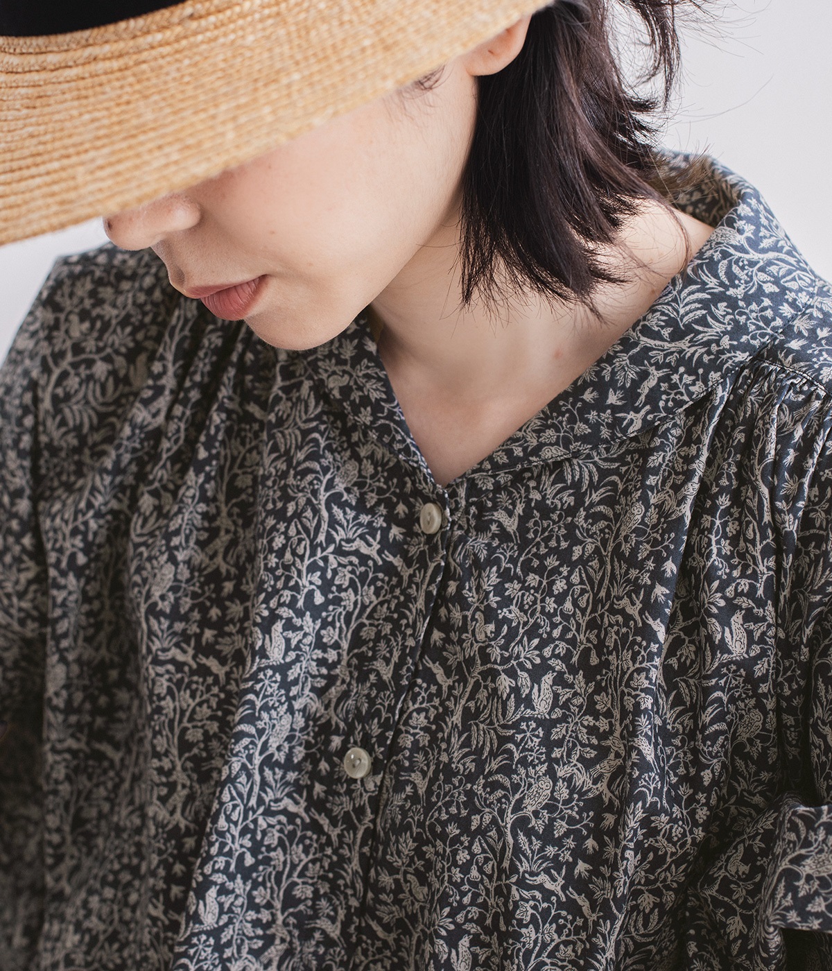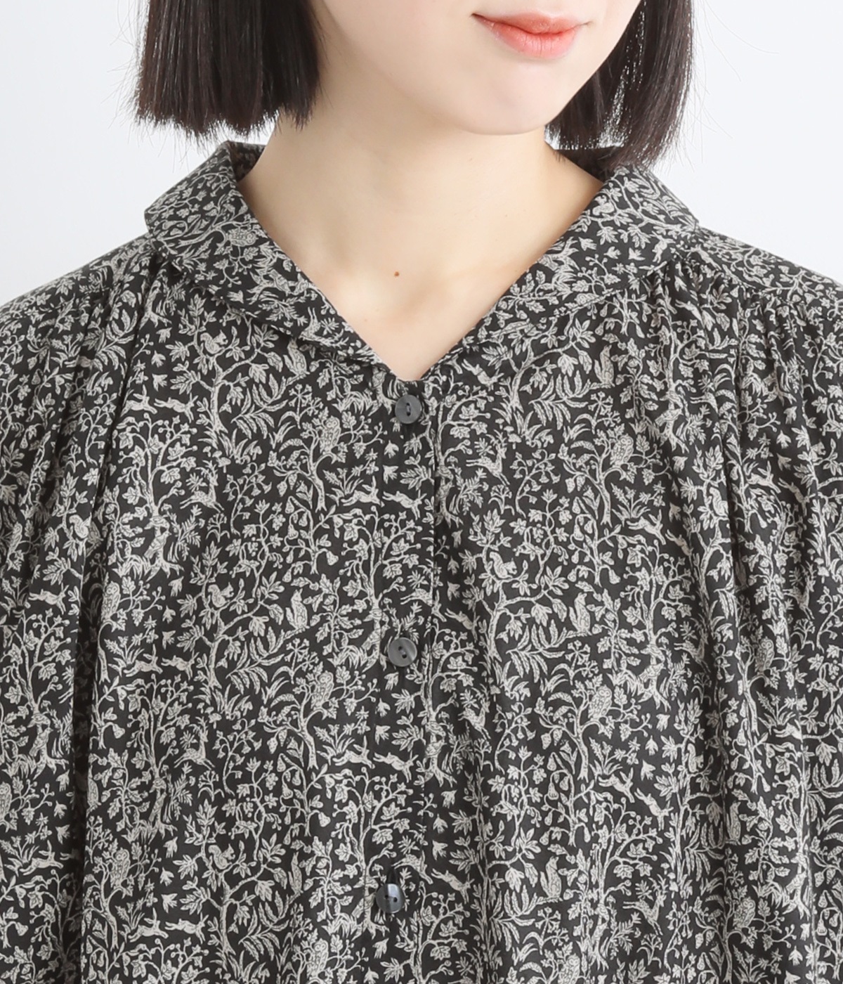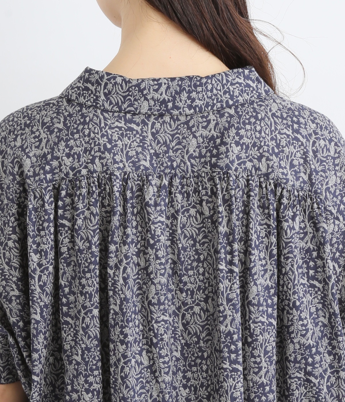 落ち着いた雰囲気ながらも、木や花の間をよく見るとたくさんの動物たちが描かれた、遊び心のあるデザイン。可愛らしく穏やかな柄は、着るだけで心地良さをもたらします。