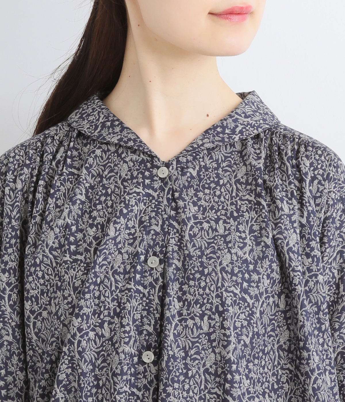 シックなネイビー×グレーの組み合わせ。肩に施したギャザーが立体的なシルエットや、美しい落ち感を際立たせます。