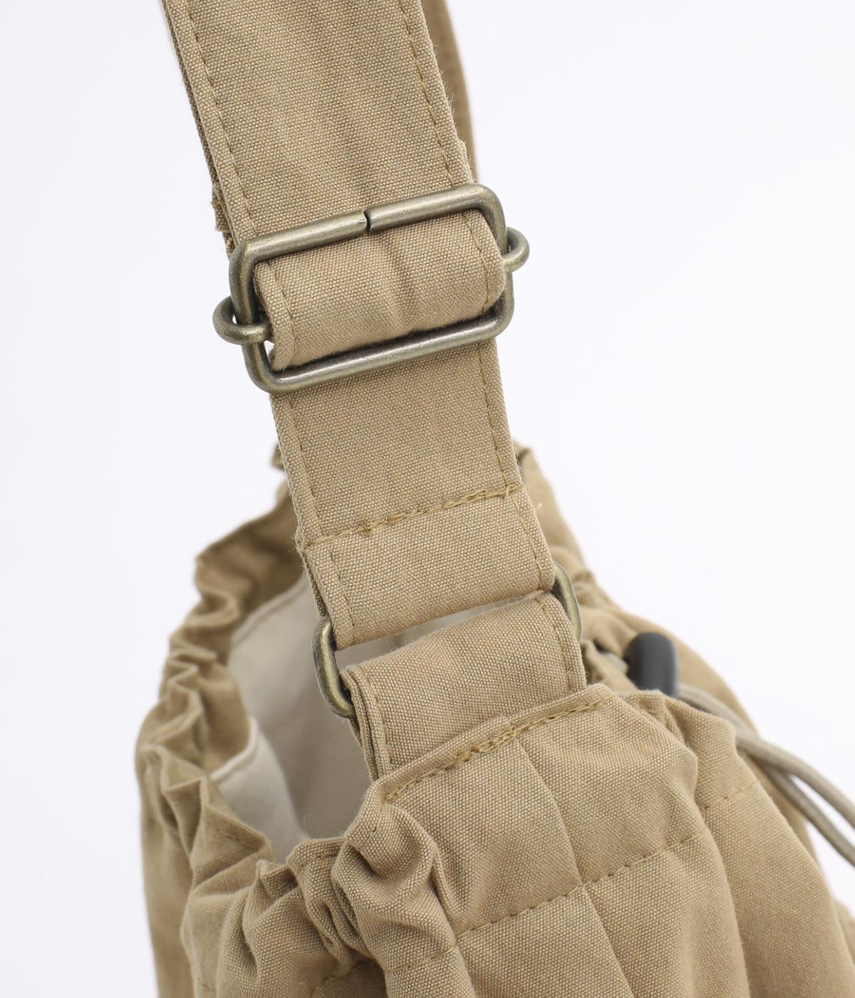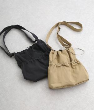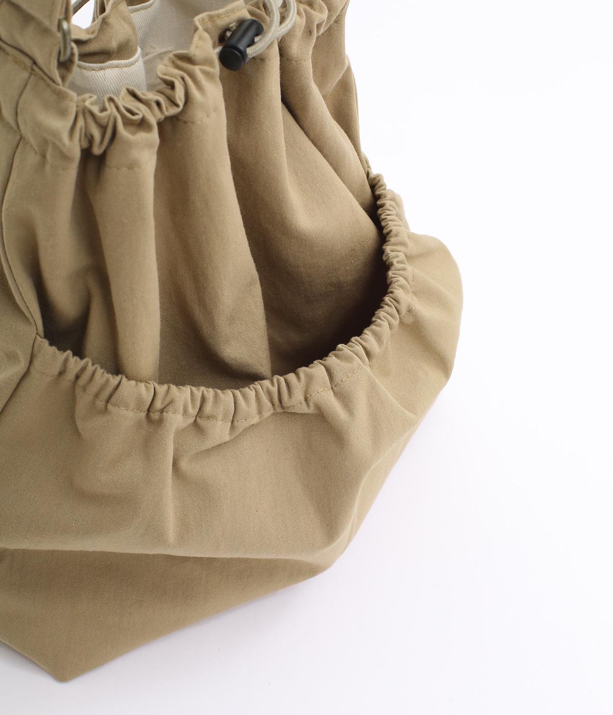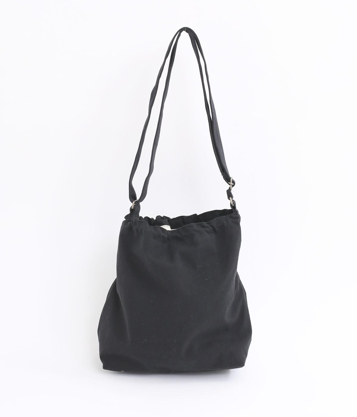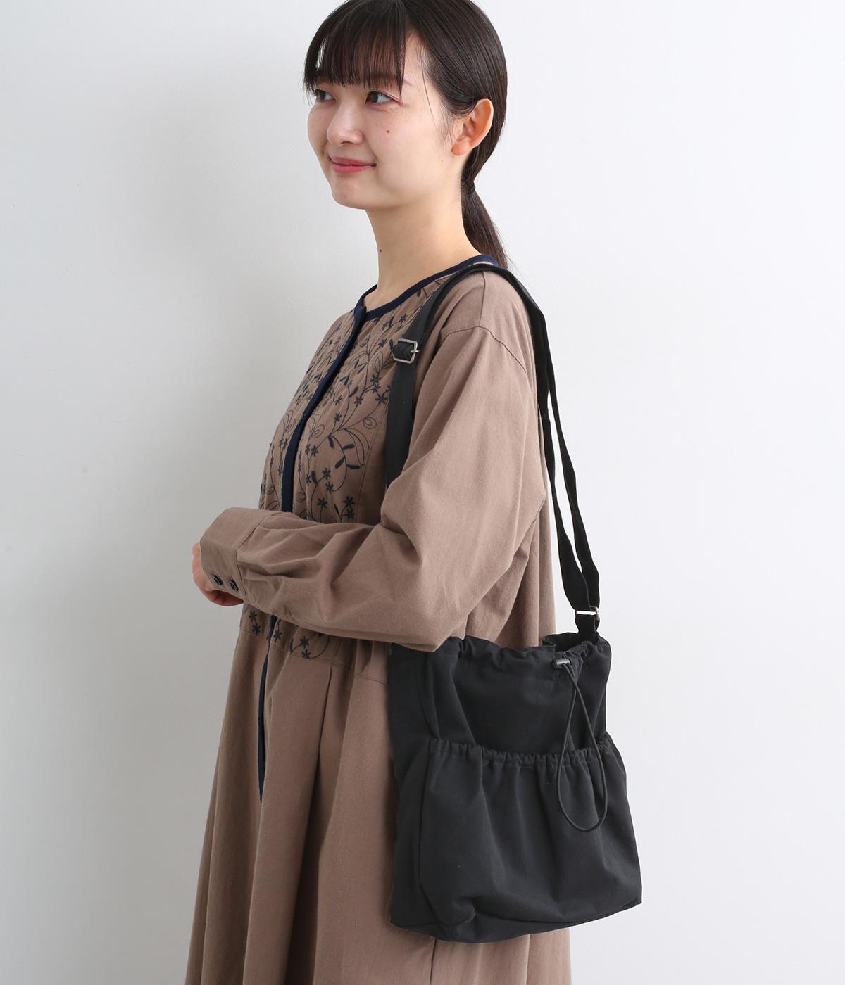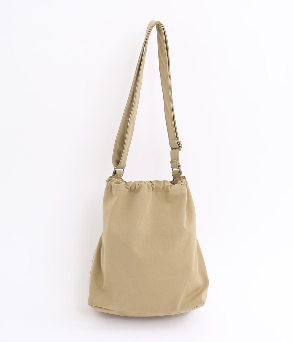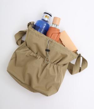 入れ口を絞ってもそのままでも使える巾着型バッグ。コンパクトながらマチがしっかりあるため、ペットボトルや折り畳み傘などお出かけに必要なものを収納できます。ショルダー部分は調整できるため、肩掛けから斜めがけにも対応。