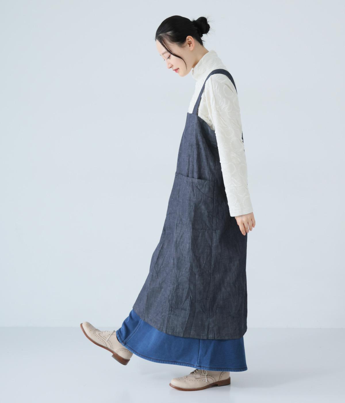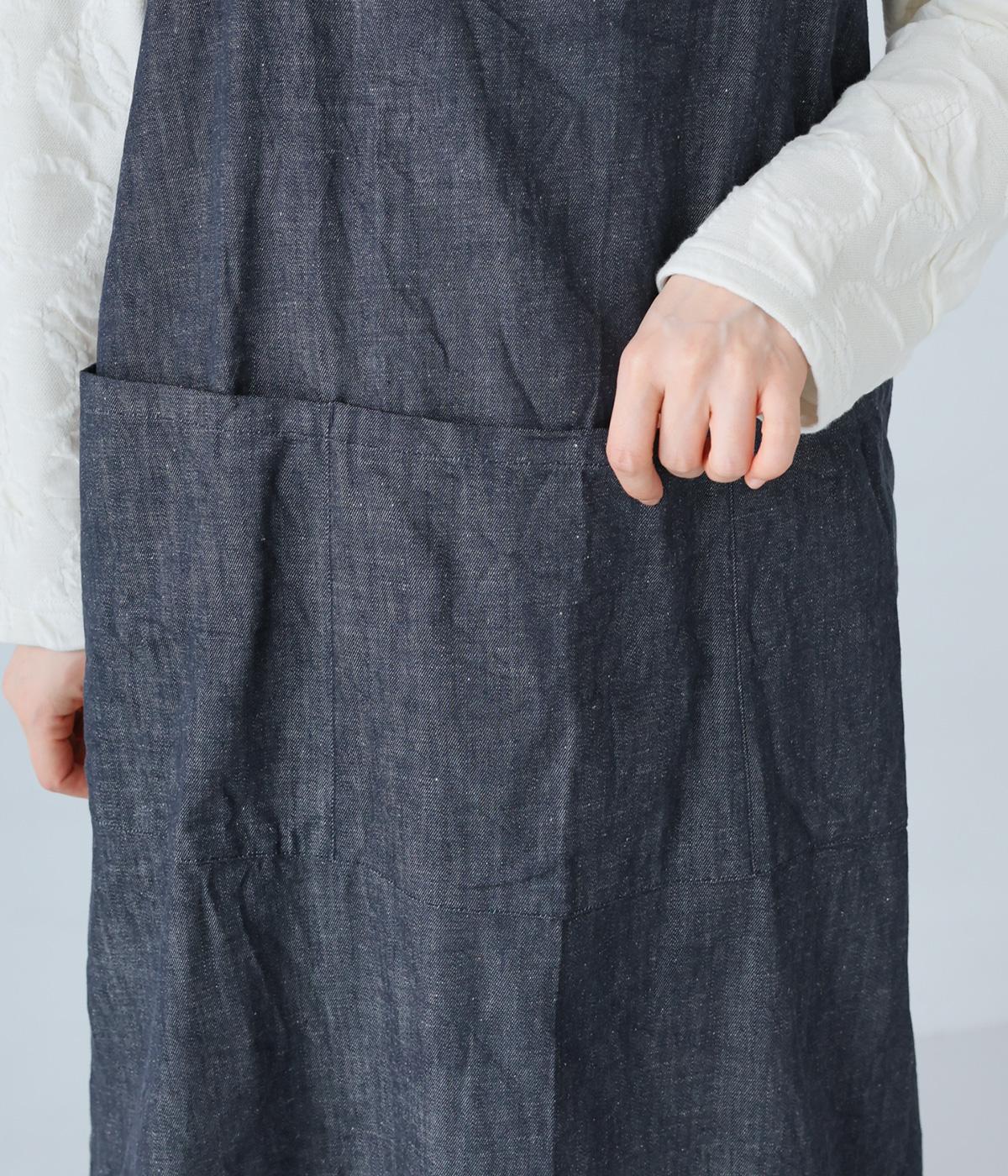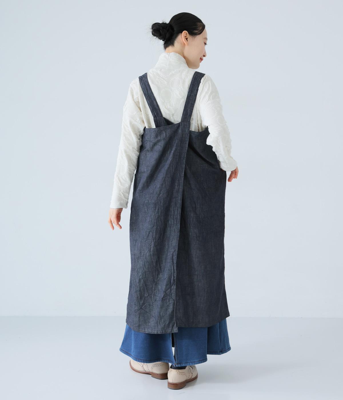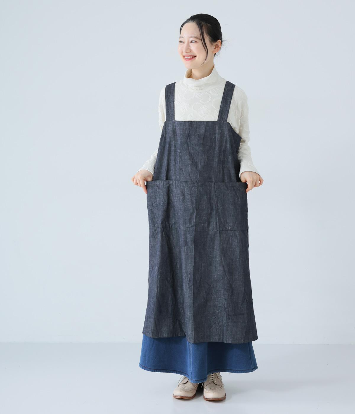 ワンピースとしてお出かけにも着用できるデニム素材のエプロンです。ボタンレスで後ろをクロスする仕様になっており着脱も簡単。ニットなど厚みのあるトップスにも難なく合わせられます。エプロンならではの実用性抜群のフロントポケットもポイントです。