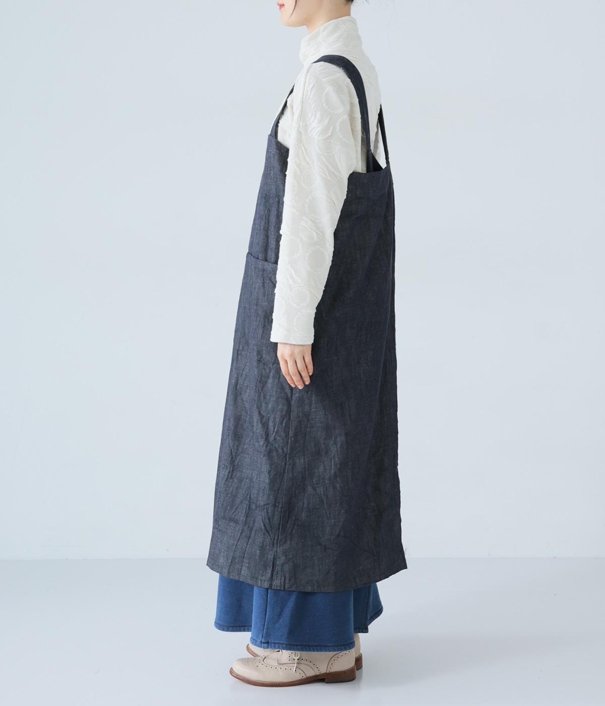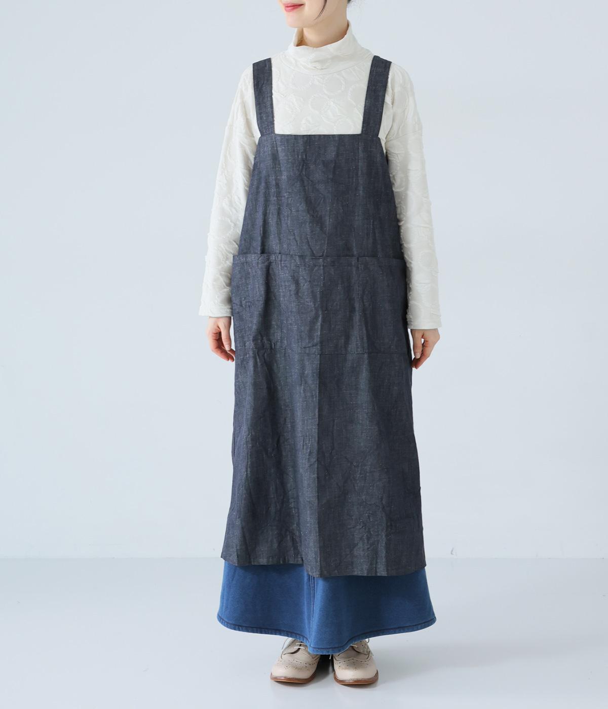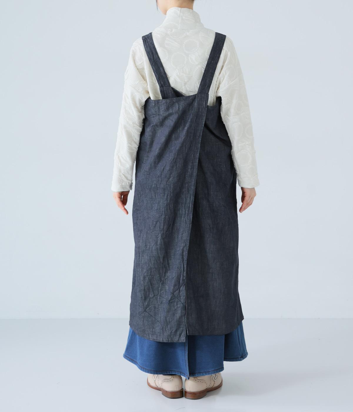 ワンピースとしてお出かけにも着用できるデニム素材のエプロンです。ボタンレスで後ろをクロスする仕様になっており着脱も簡単。ニットなど厚みのあるトップスにも難なく合わせられます。エプロンならではの実用性抜群のフロントポケットもポイントです。