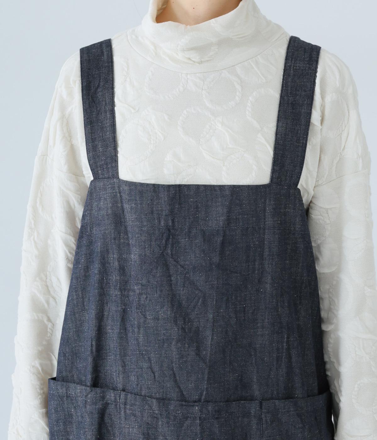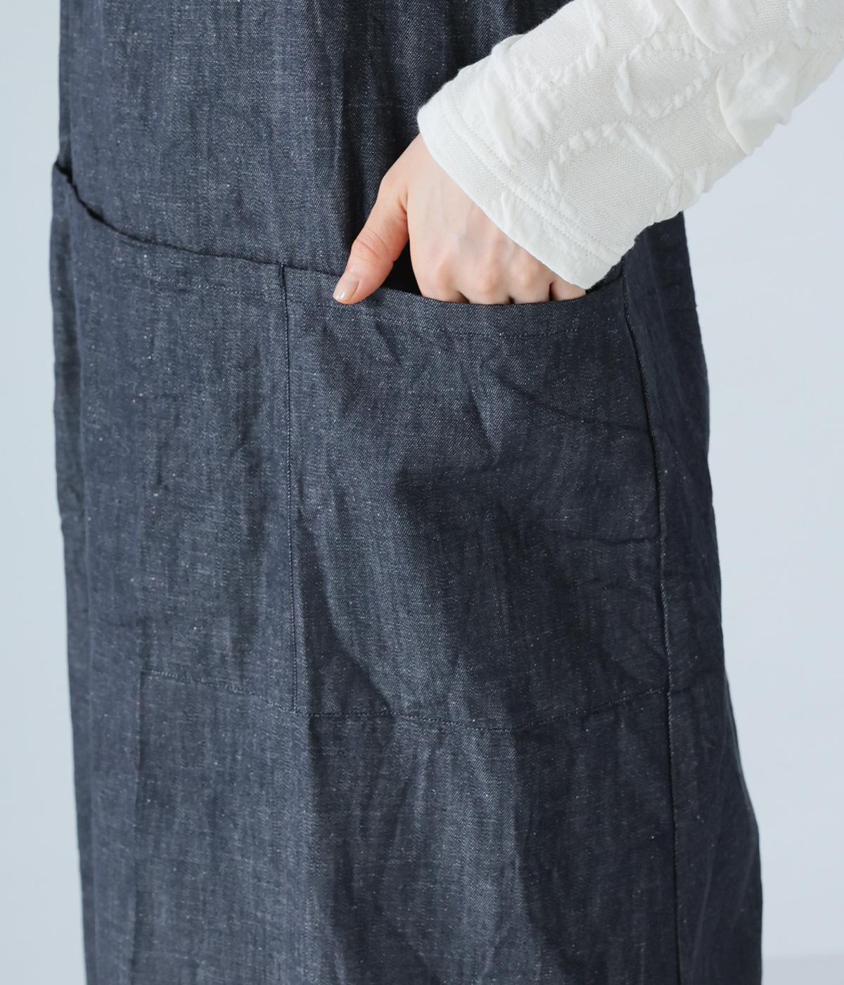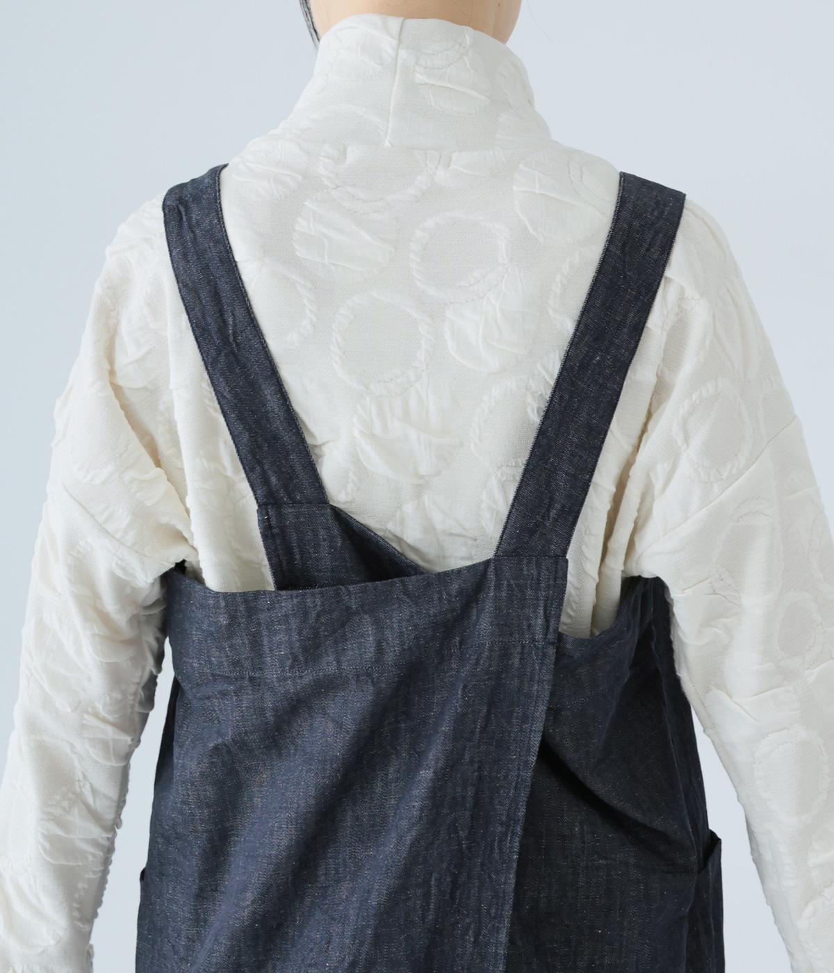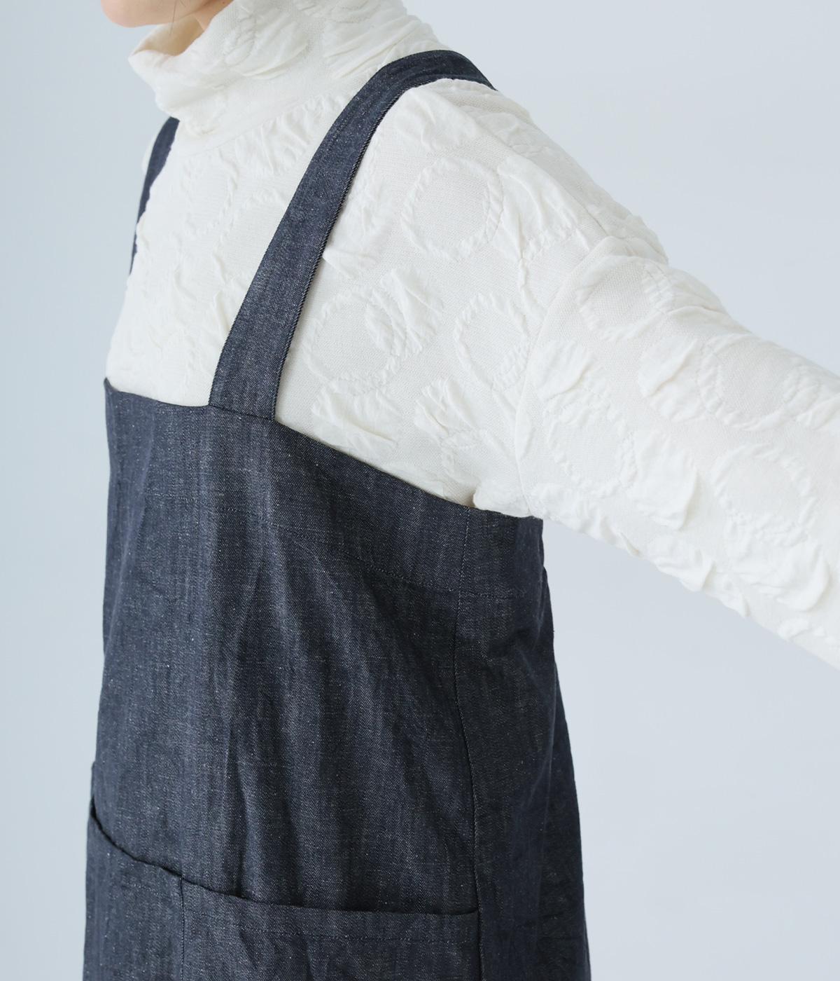 ワンピースとしてお出かけにも着用できるデニム素材のエプロンです。ボタンレスで後ろをクロスする仕様になっており着脱も簡単。ニットなど厚みのあるトップスにも難なく合わせられます。エプロンならではの実用性抜群のフロントポケットもポイントです。