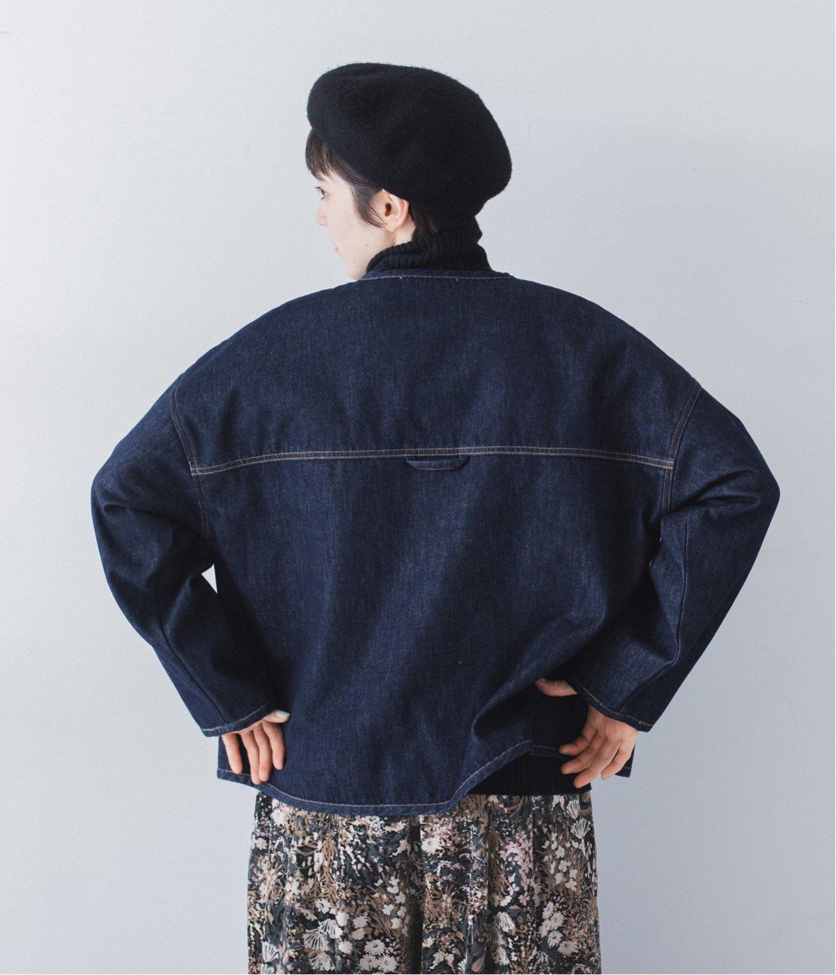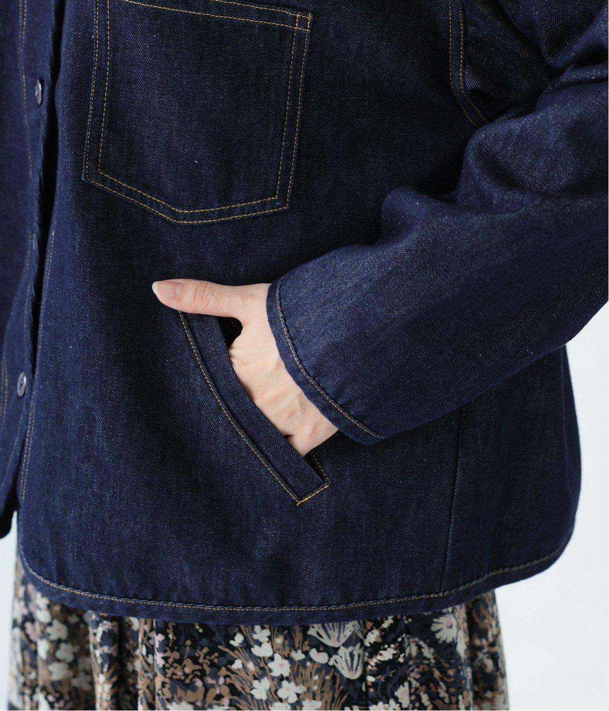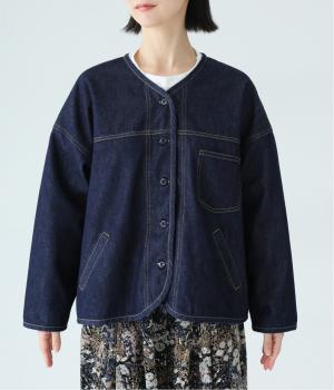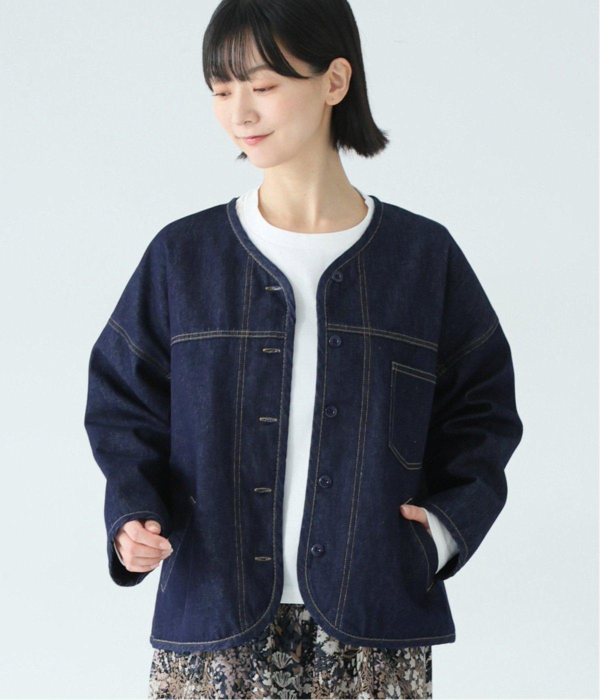 すっきりとしたデニム生地の見た目で、あたたかな着用感をたのしめる裏ボア素材のジャケット。首元に抜け感を添えるノーカラー仕様で大人らしく仕上げました。随所のステッチや左胸のパッチポケットがアクセントになっています。