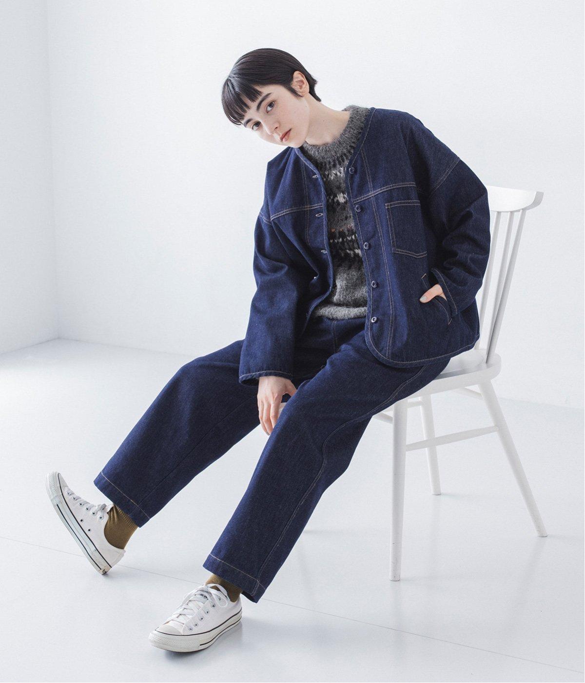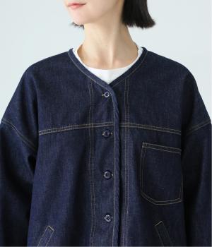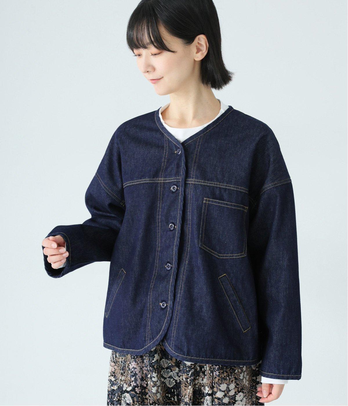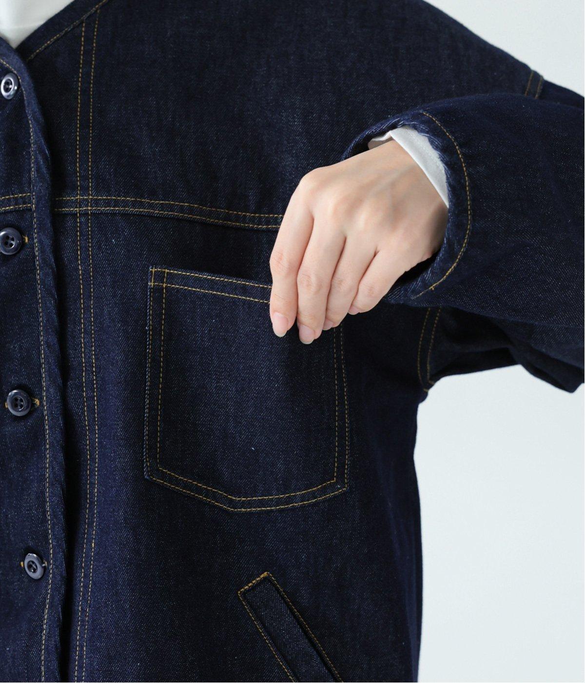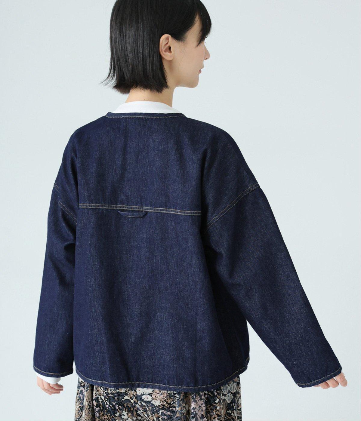 すっきりとしたデニム生地の見た目で、あたたかな着用感をたのしめる裏ボア素材のジャケット。首元に抜け感を添えるノーカラー仕様で大人らしく仕上げました。随所のステッチや左胸のパッチポケットがアクセントになっています。