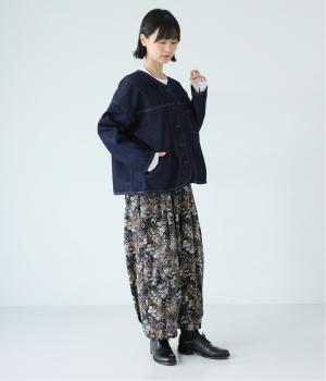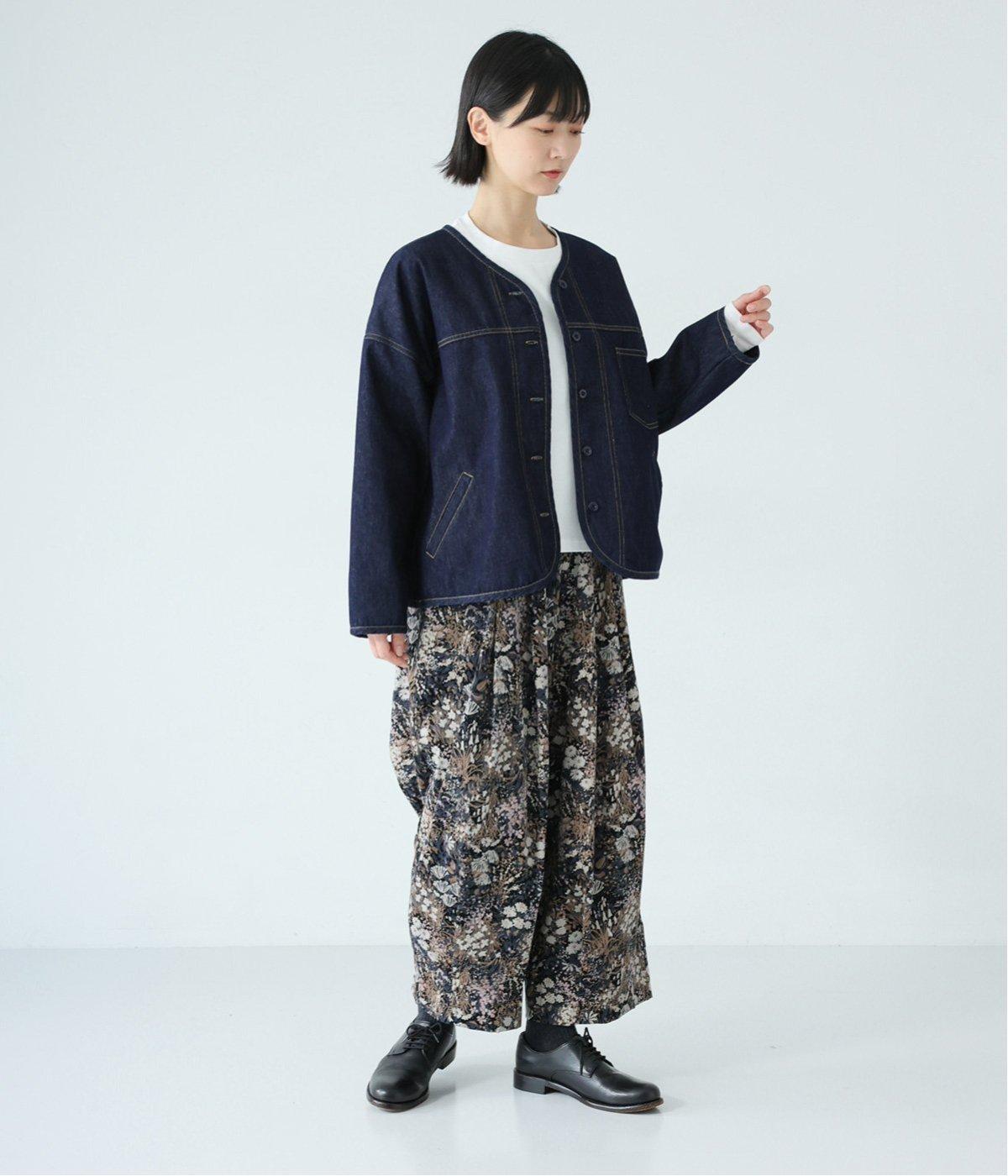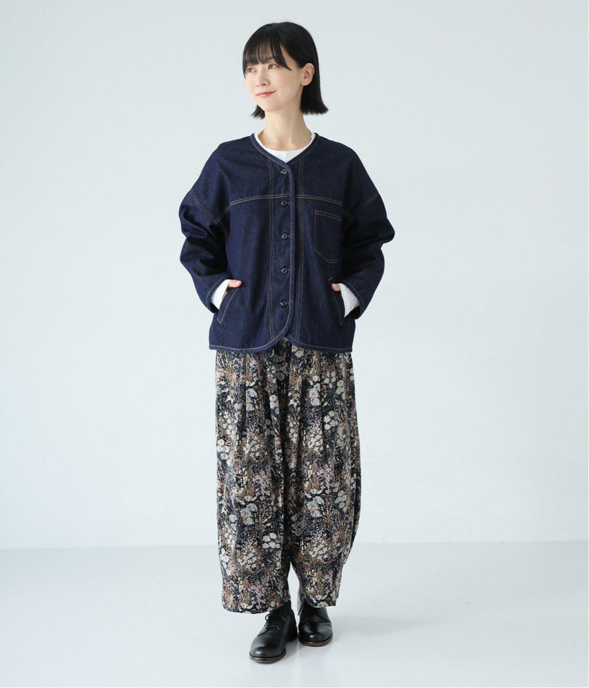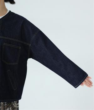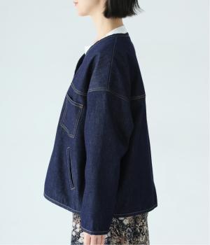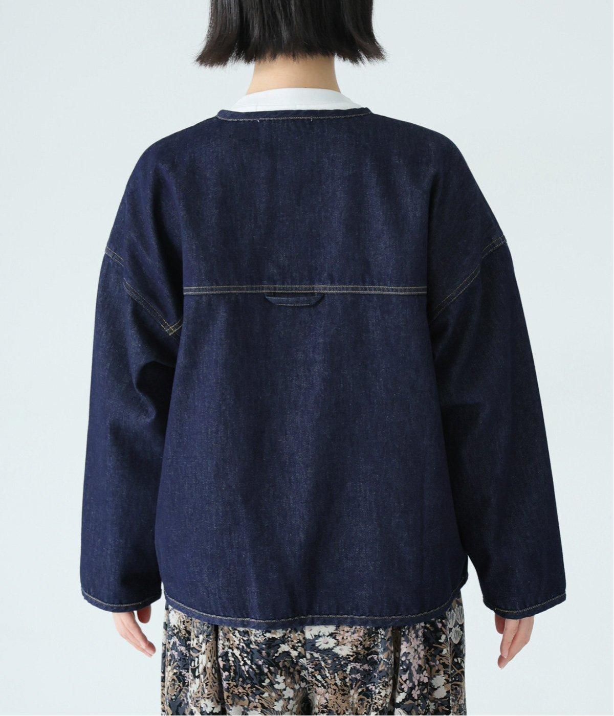 すっきりとしたデニム生地の見た目で、あたたかな着用感をたのしめる裏ボア素材のジャケット。首元に抜け感を添えるノーカラー仕様で大人らしく仕上げました。随所のステッチや左胸のパッチポケットがアクセントになっています。