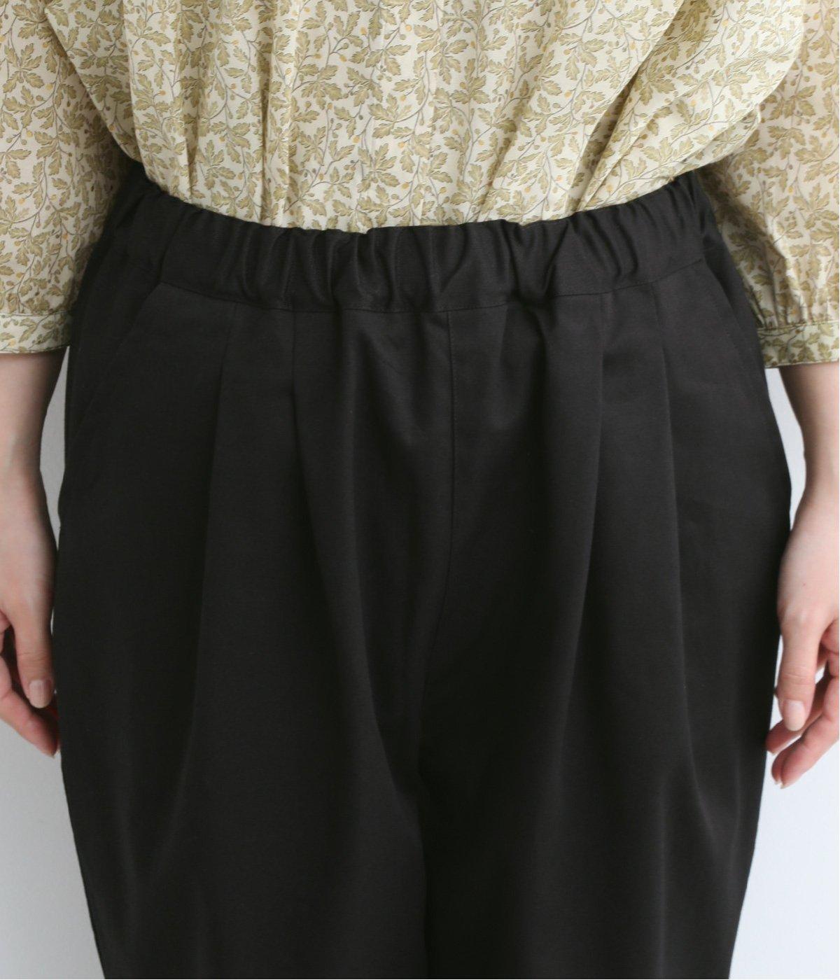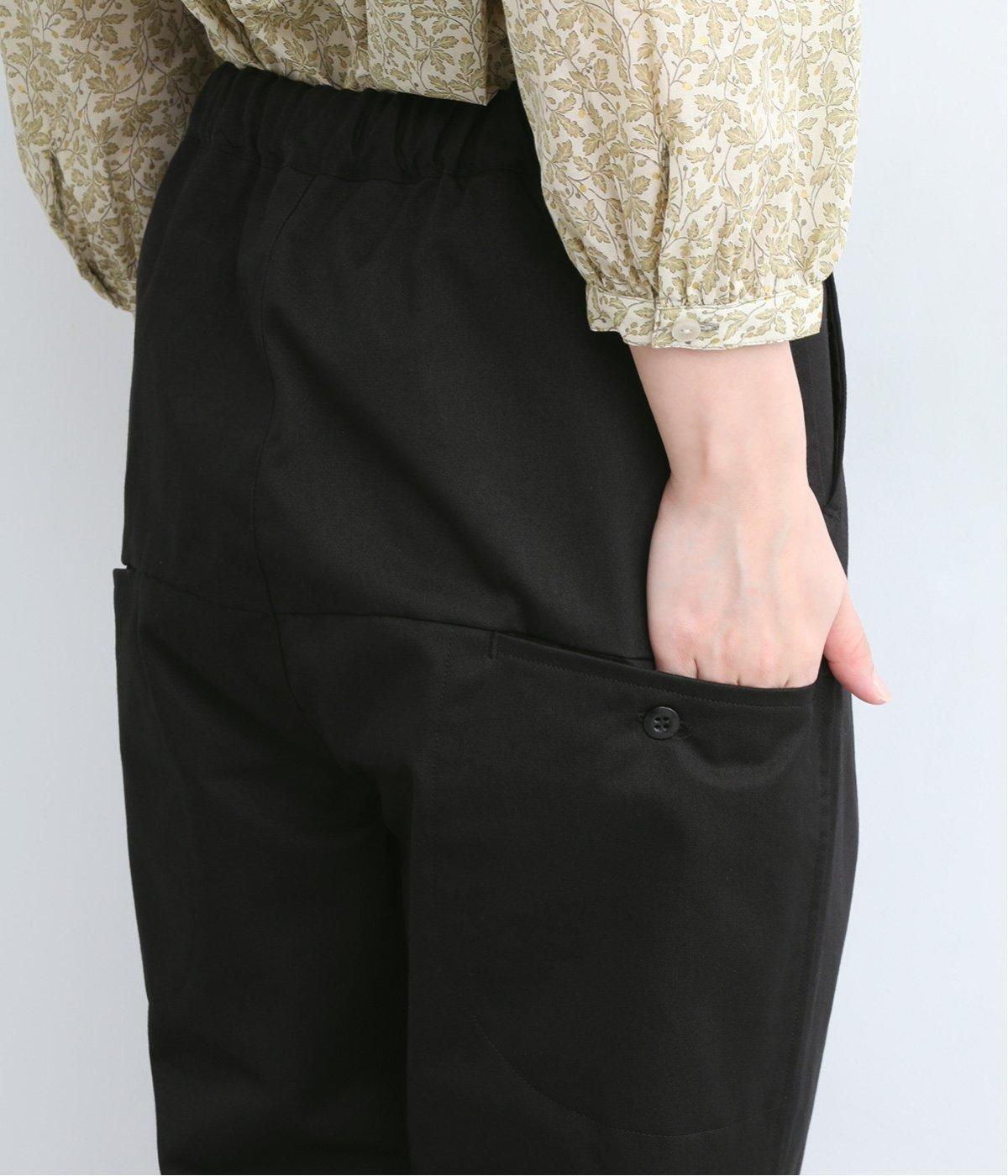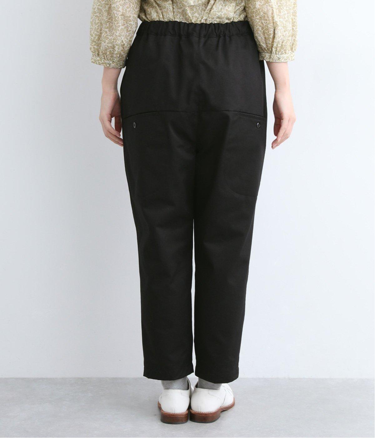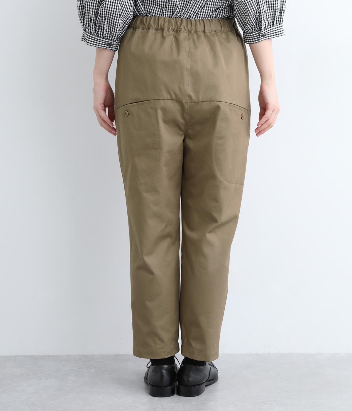 切り替えを利用した後ろポケットが特徴的なデザイン。前はタックを入れて腰まわりはゆったりと、裾はすっきりとしたテーパードシルエットに仕立てました。ウエストは総ゴムでストレスを軽減し、内紐入りでフィット感の微調整も可能です。