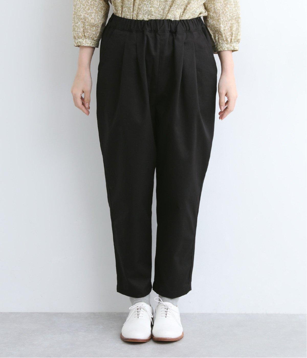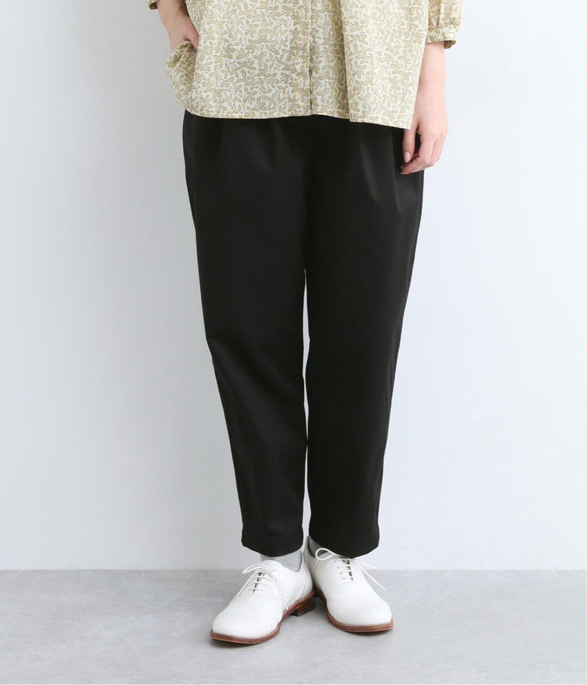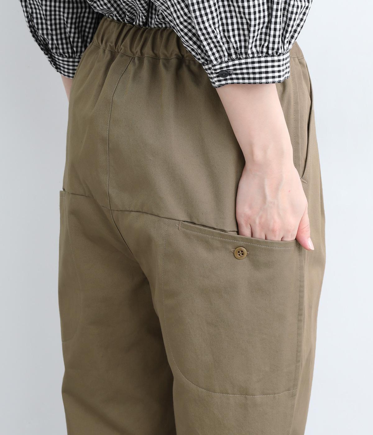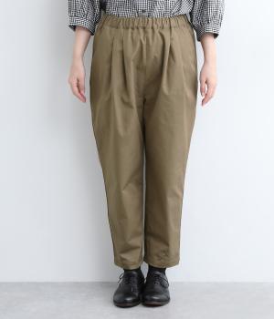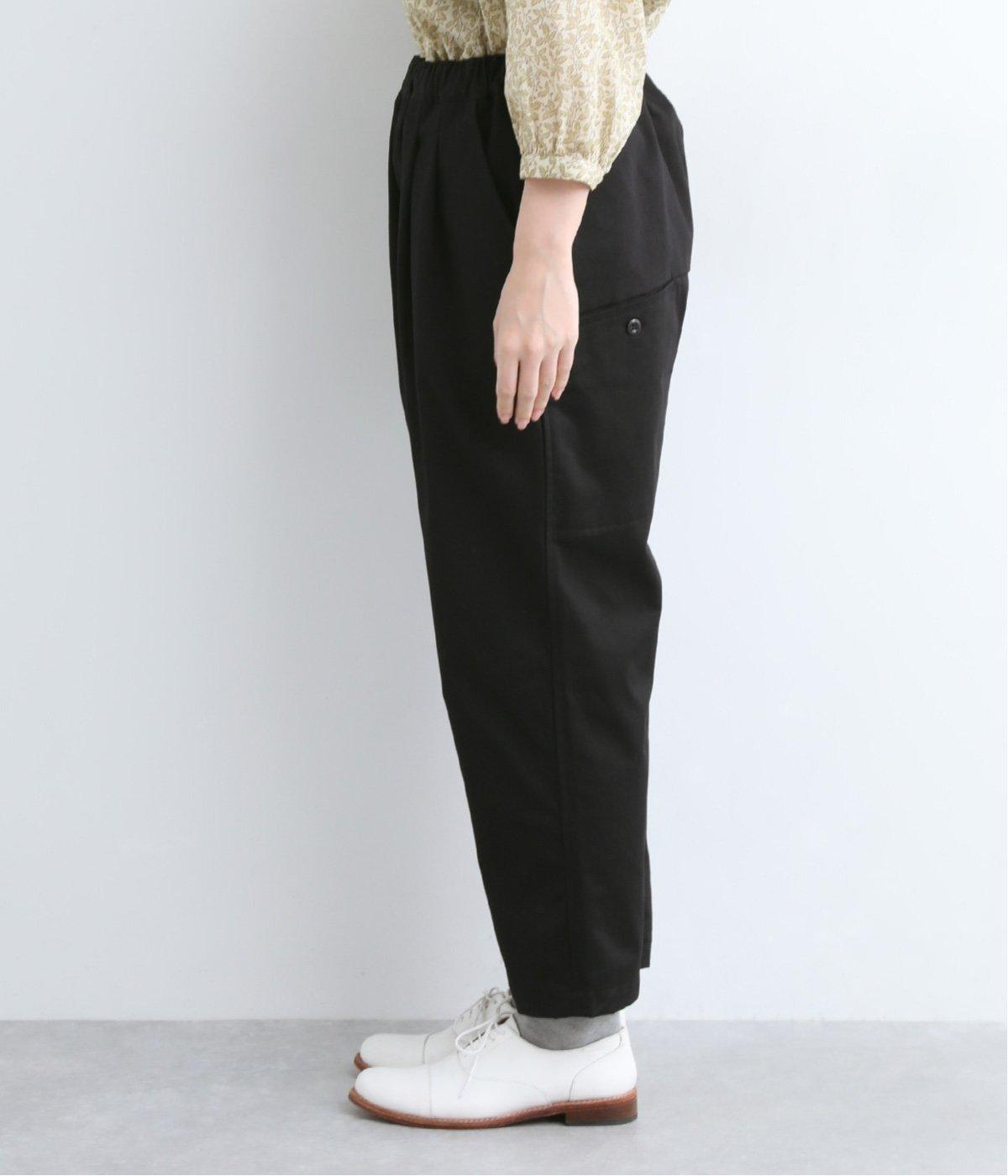 切り替えを利用した後ろポケットが特徴的なデザイン。前はタックを入れて腰まわりはゆったりと、裾はすっきりとしたテーパードシルエットに仕立てました。ウエストは総ゴムでストレスを軽減し、内紐入りでフィット感の微調整も可能です。