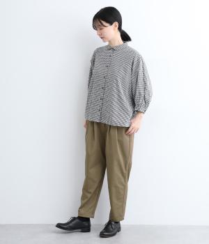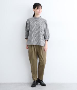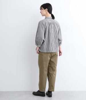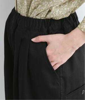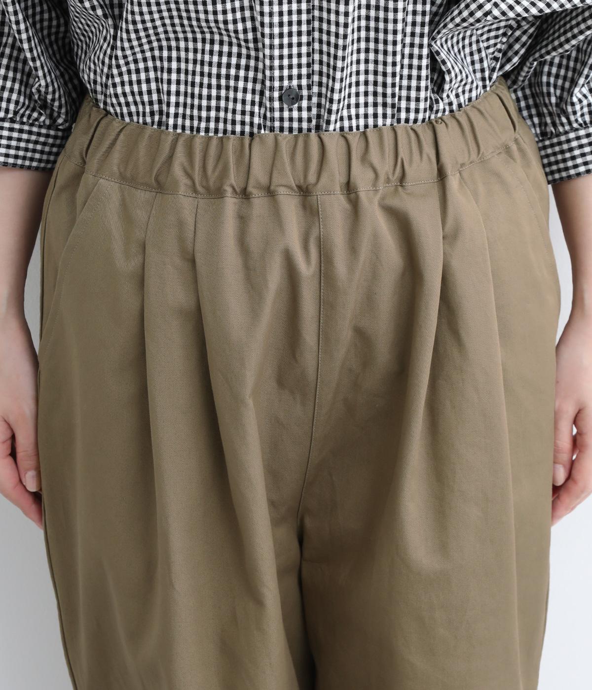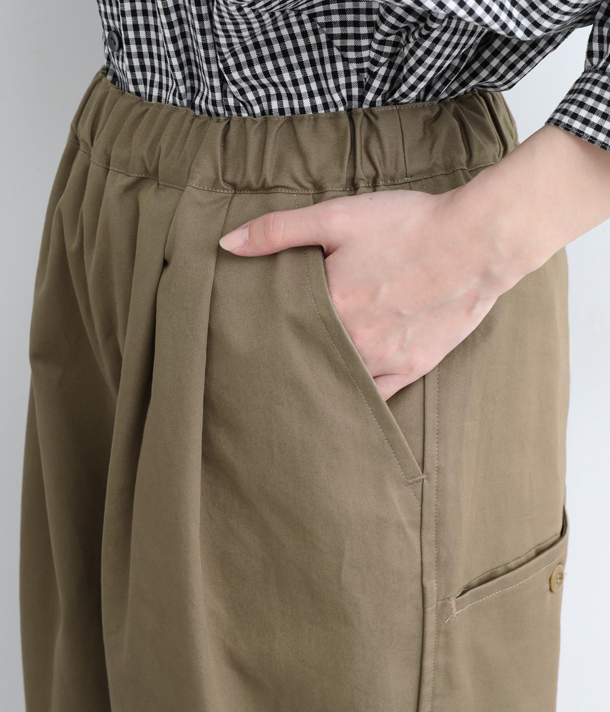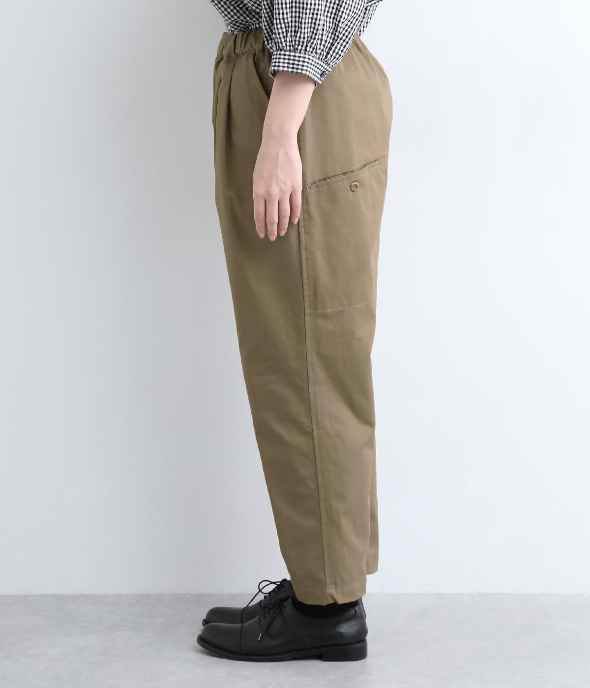 切り替えを利用した後ろポケットが特徴的なデザイン。前はタックを入れて腰まわりはゆったりと、裾はすっきりとしたテーパードシルエットに仕立てました。ウエストは総ゴムでストレスを軽減し、内紐入りでフィット感の微調整も可能です。