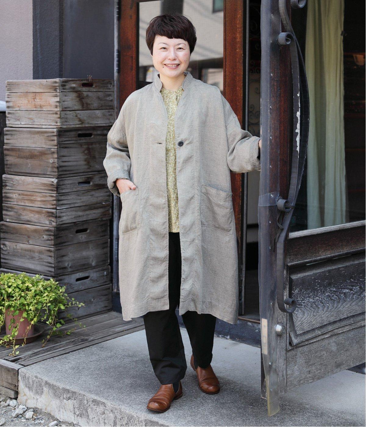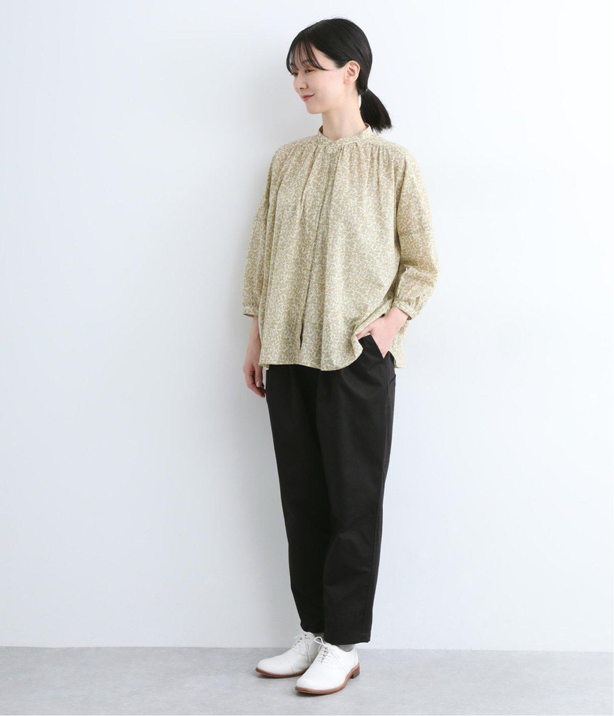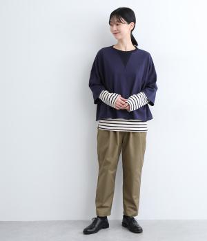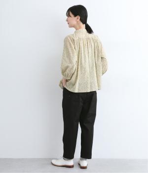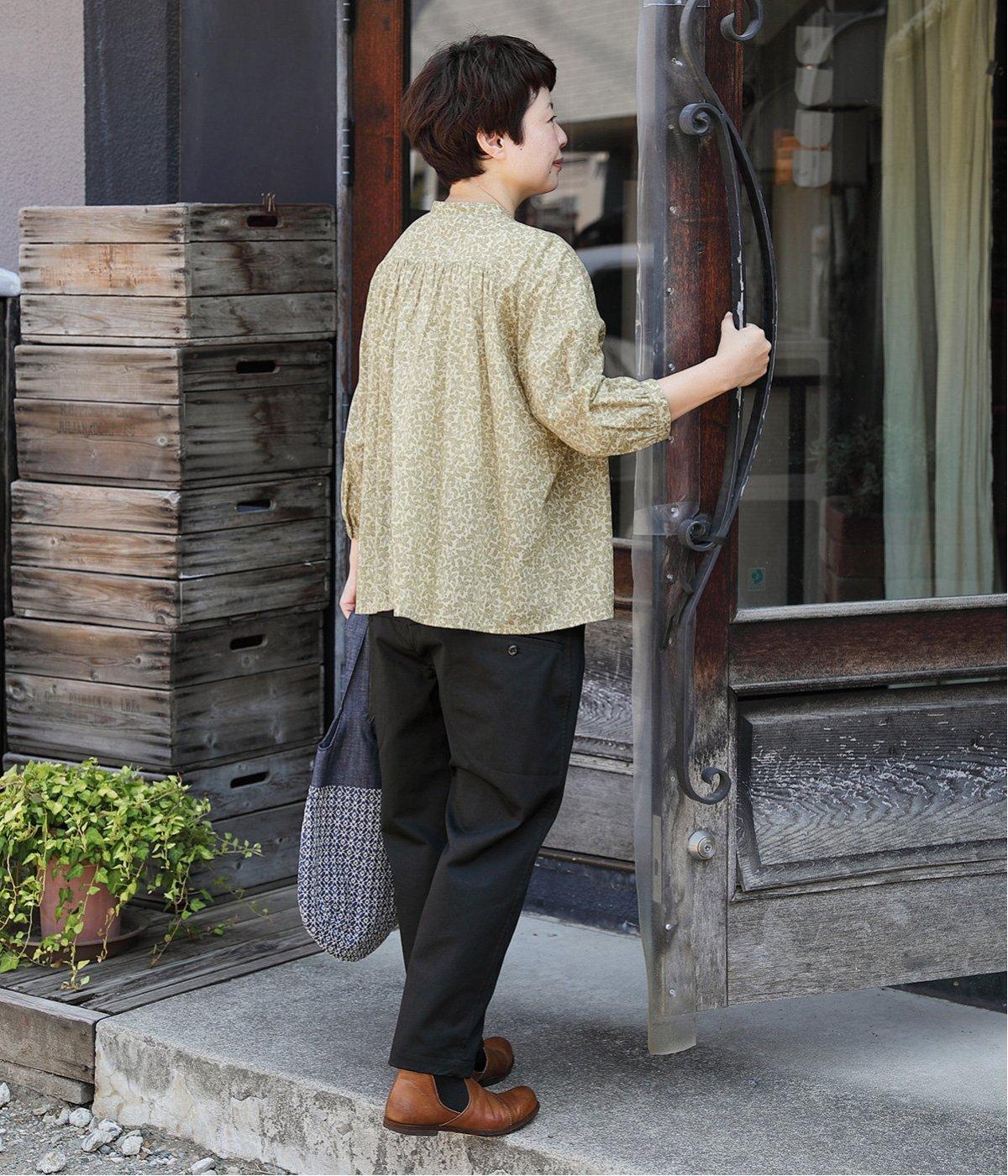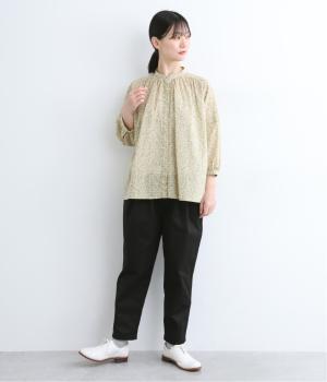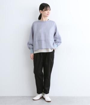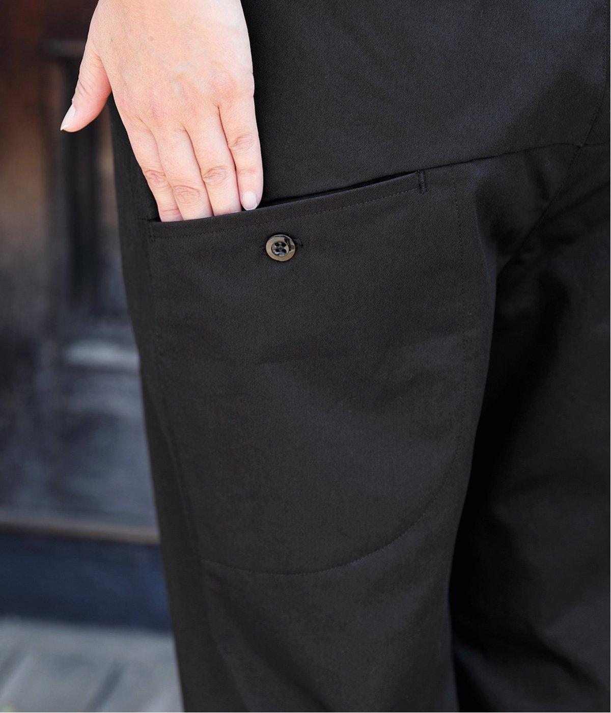 切り替えを利用した後ろポケットが特徴的なデザイン。前はタックを入れて腰まわりはゆったりと、裾はすっきりとしたテーパードシルエットに仕立てました。ウエストは総ゴムでストレスを軽減し、内紐入りでフィット感の微調整も可能です。