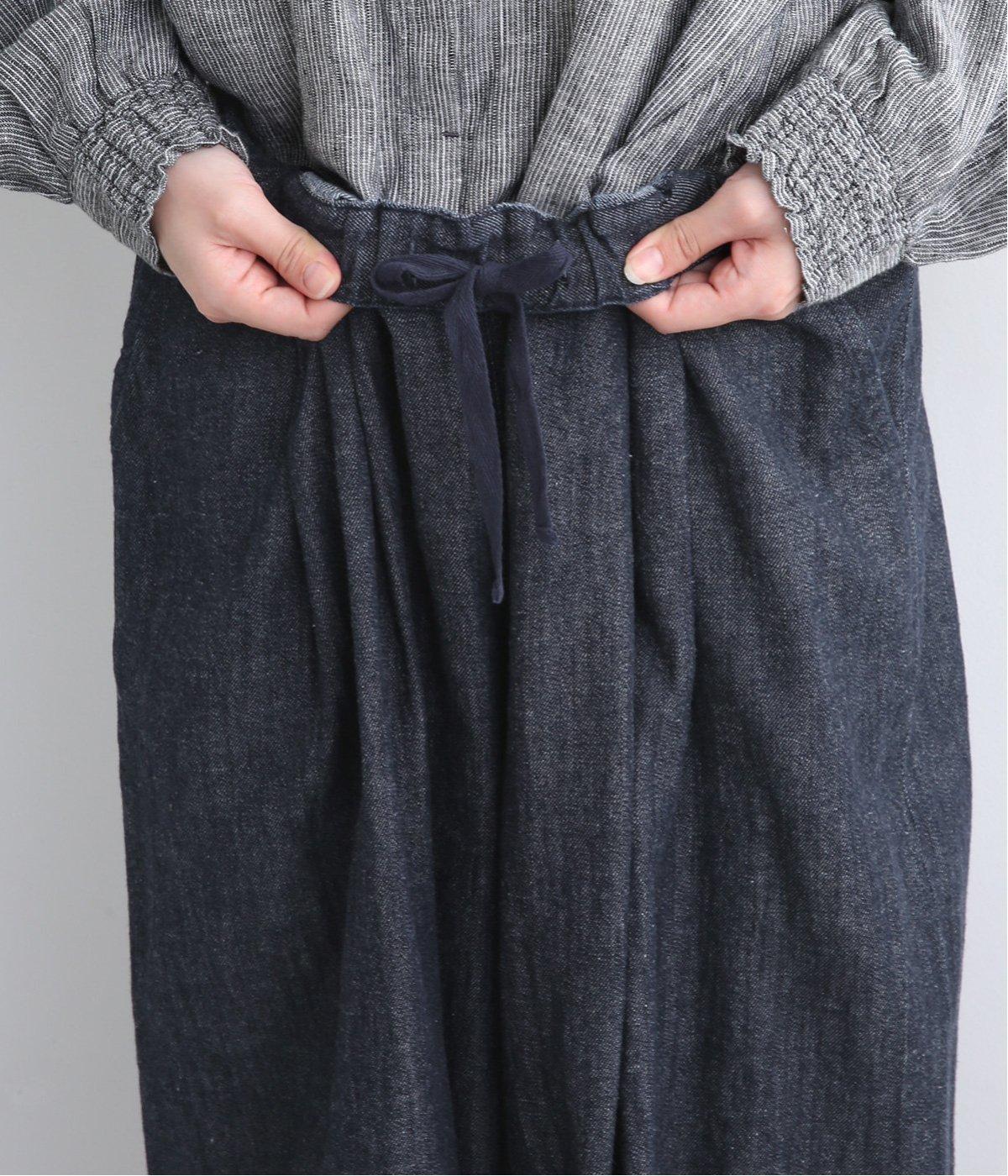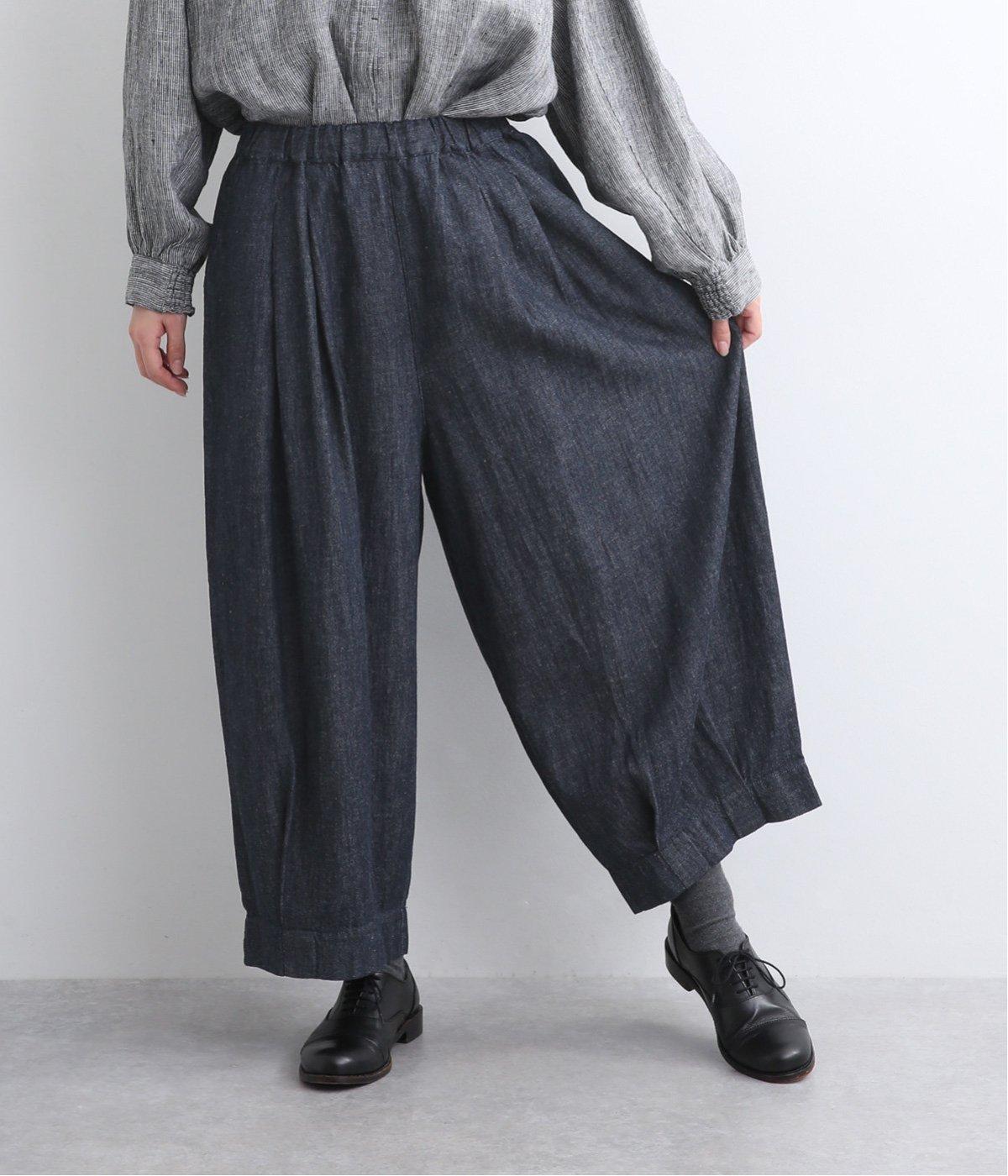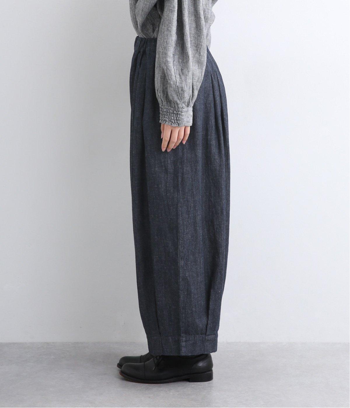 ウエストと裾にタックを入れて立体感を持たせたデニムパンツ。シューズ合わせがたのしめる丈感もこだわりポイントで、すっきりとバランスよく着用できます。ウエストはぐるりとゴムを入れたリラックス仕様。内紐で微調整もできます。