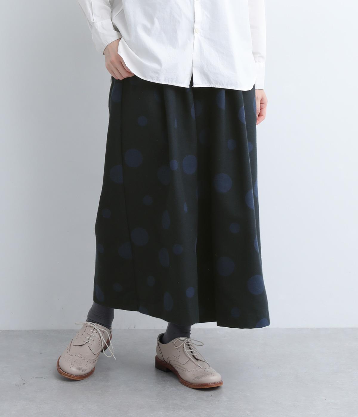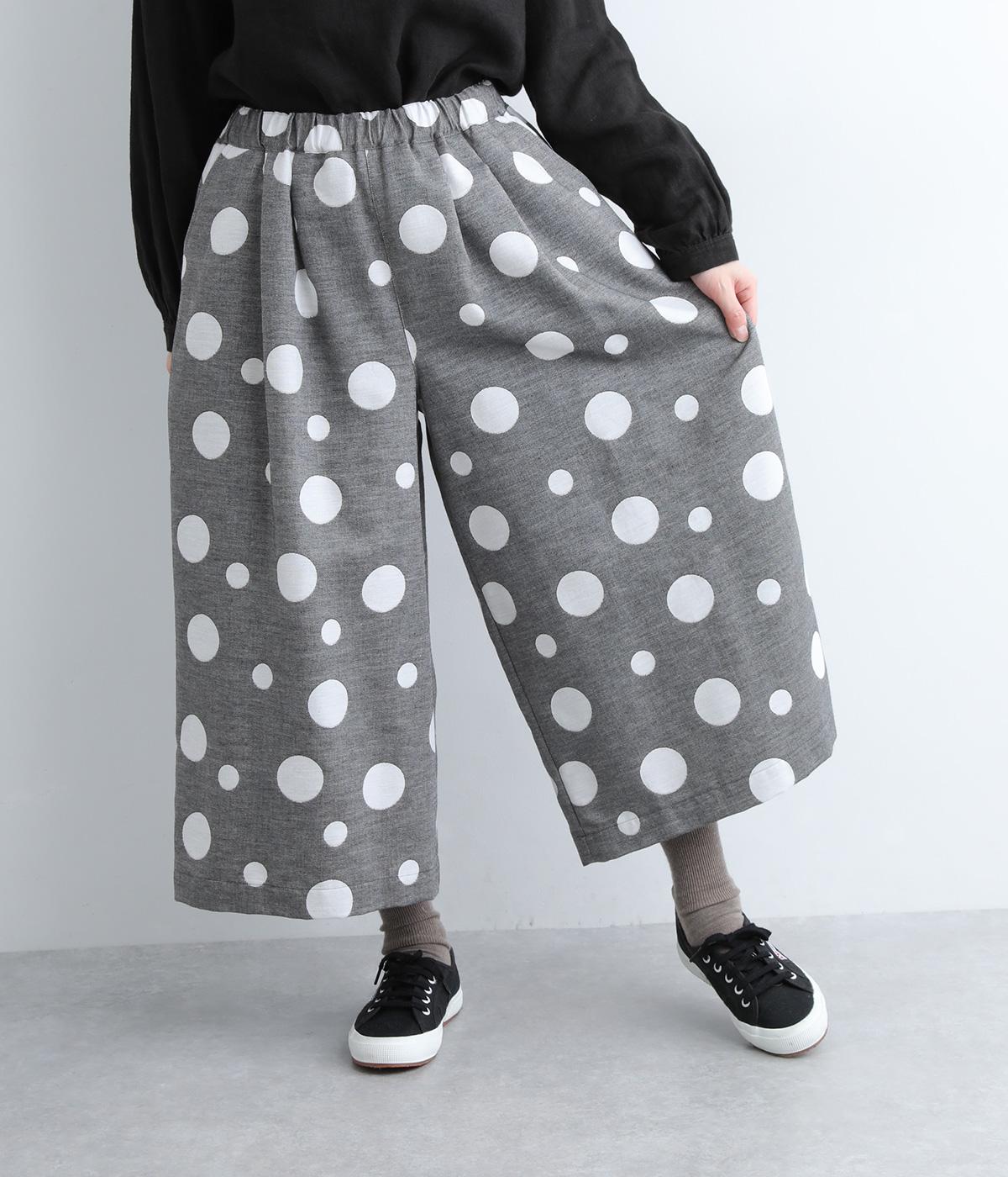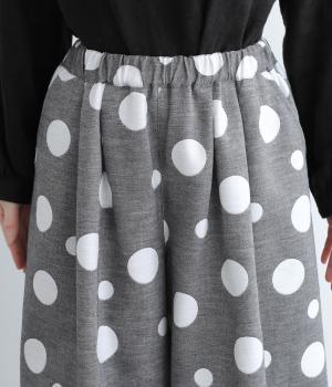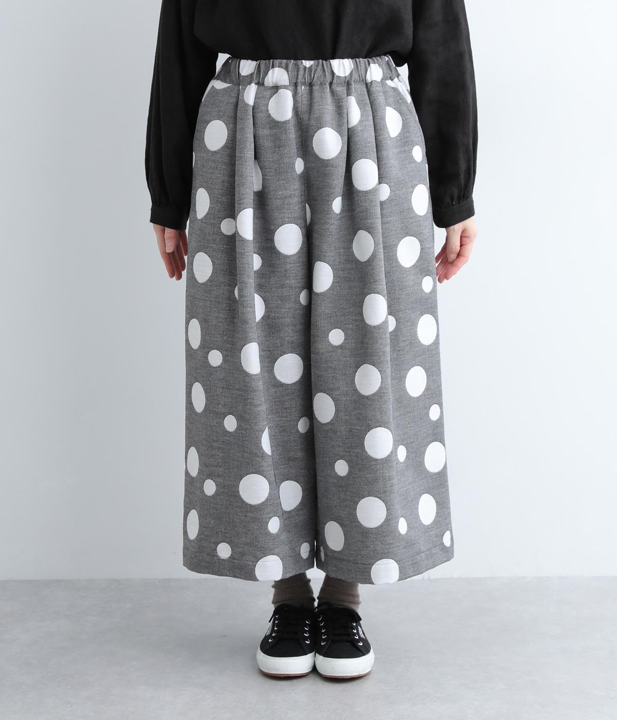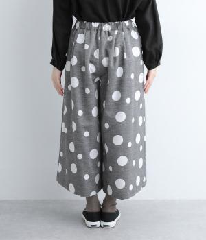 ランダムなドット柄を活かして、シンプルなワイドシルエットに仕立てたキュロットパンツ。足元をすっきり見せたバランスのいい丈感で着こなしやすくまとめました。ウエストは総ゴムのリラックス仕様。内紐でフィット感の微調整も可能です。