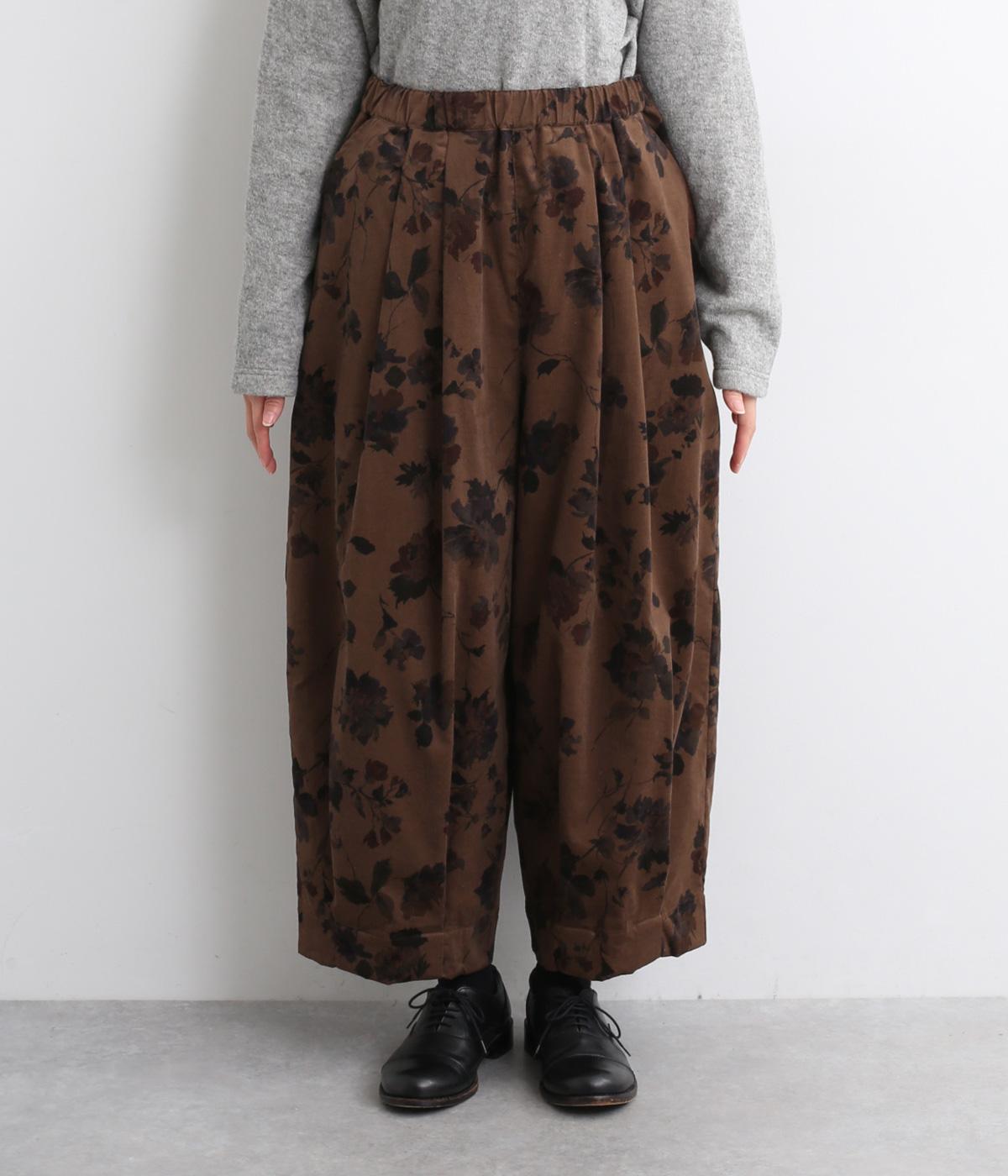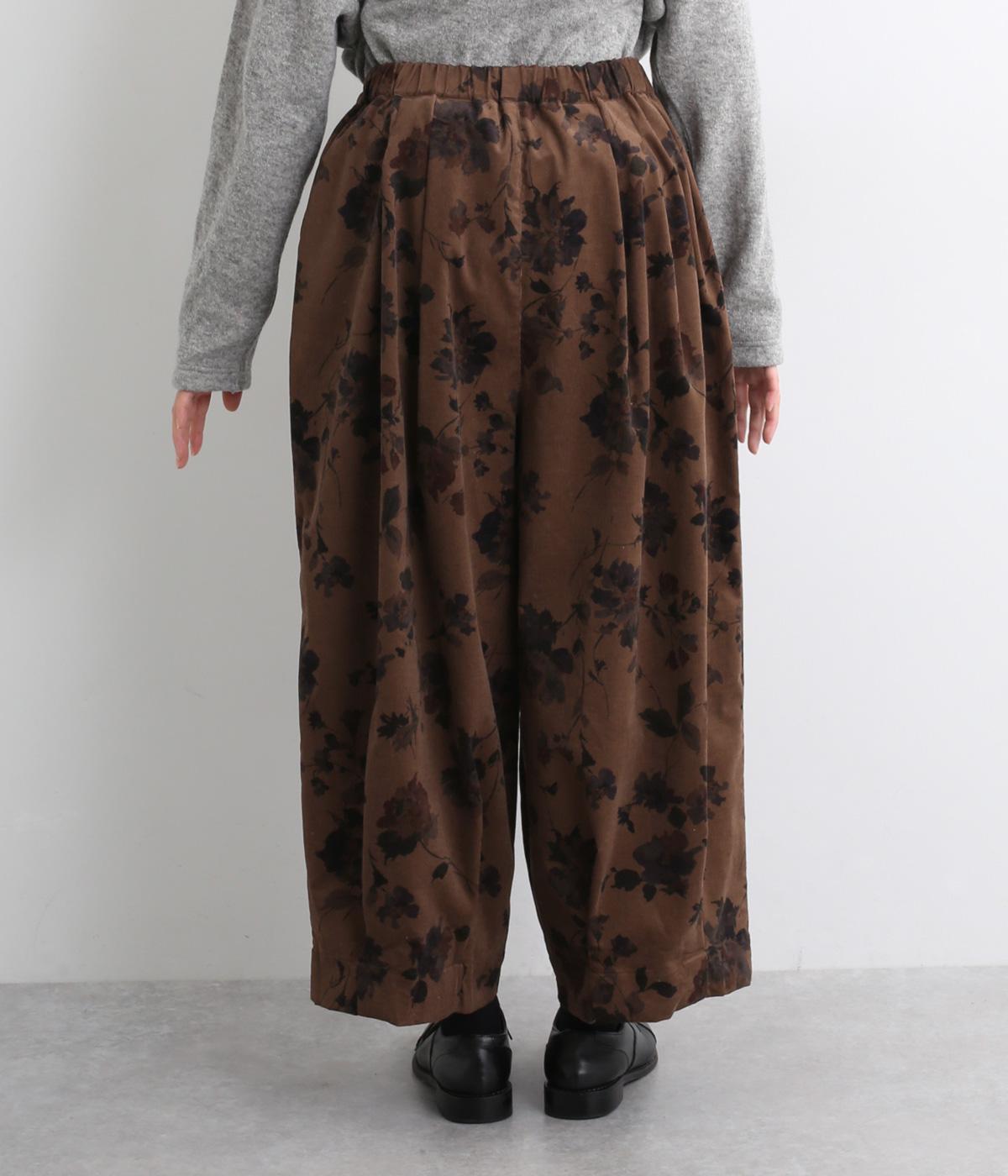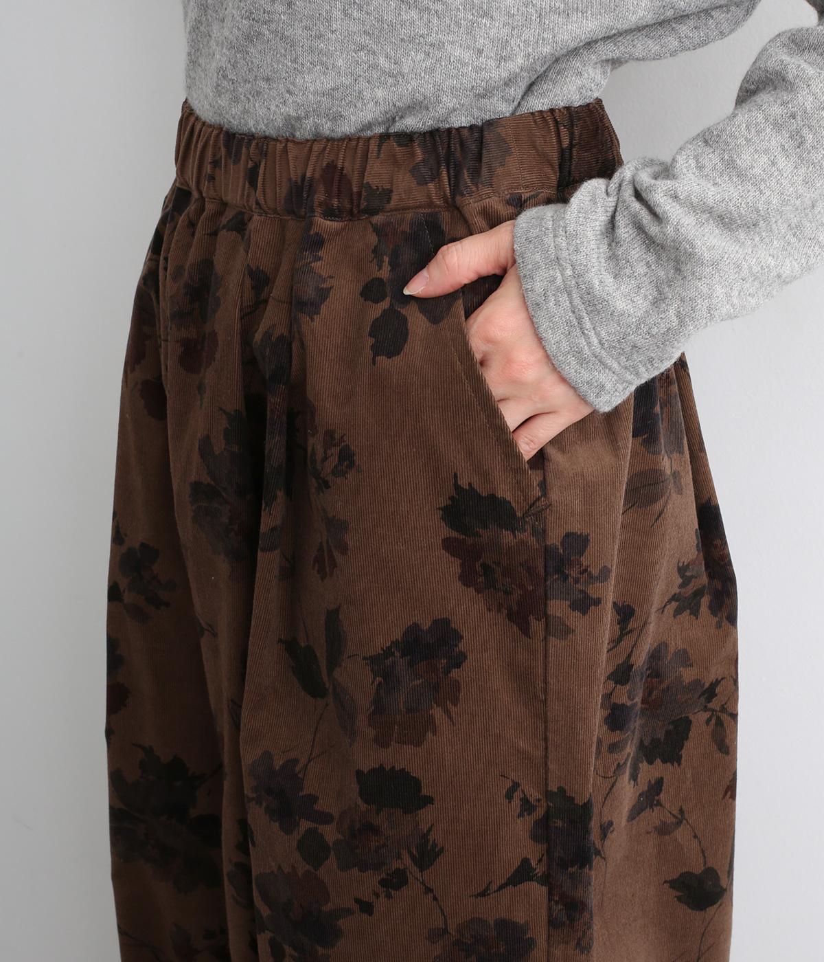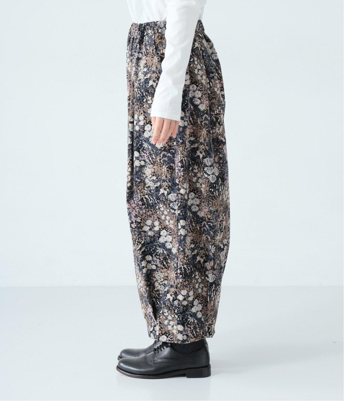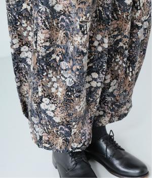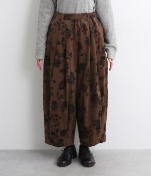 コーデュロイ生地にフラワープリントをあしらった、装いの主役になるパンツです。前後のウエスト下と裾にタックを入れ、体のラインを拾いにくい立体的なシルエットに仕上げました。ウエストは総ゴム仕様で、内紐を通しています。