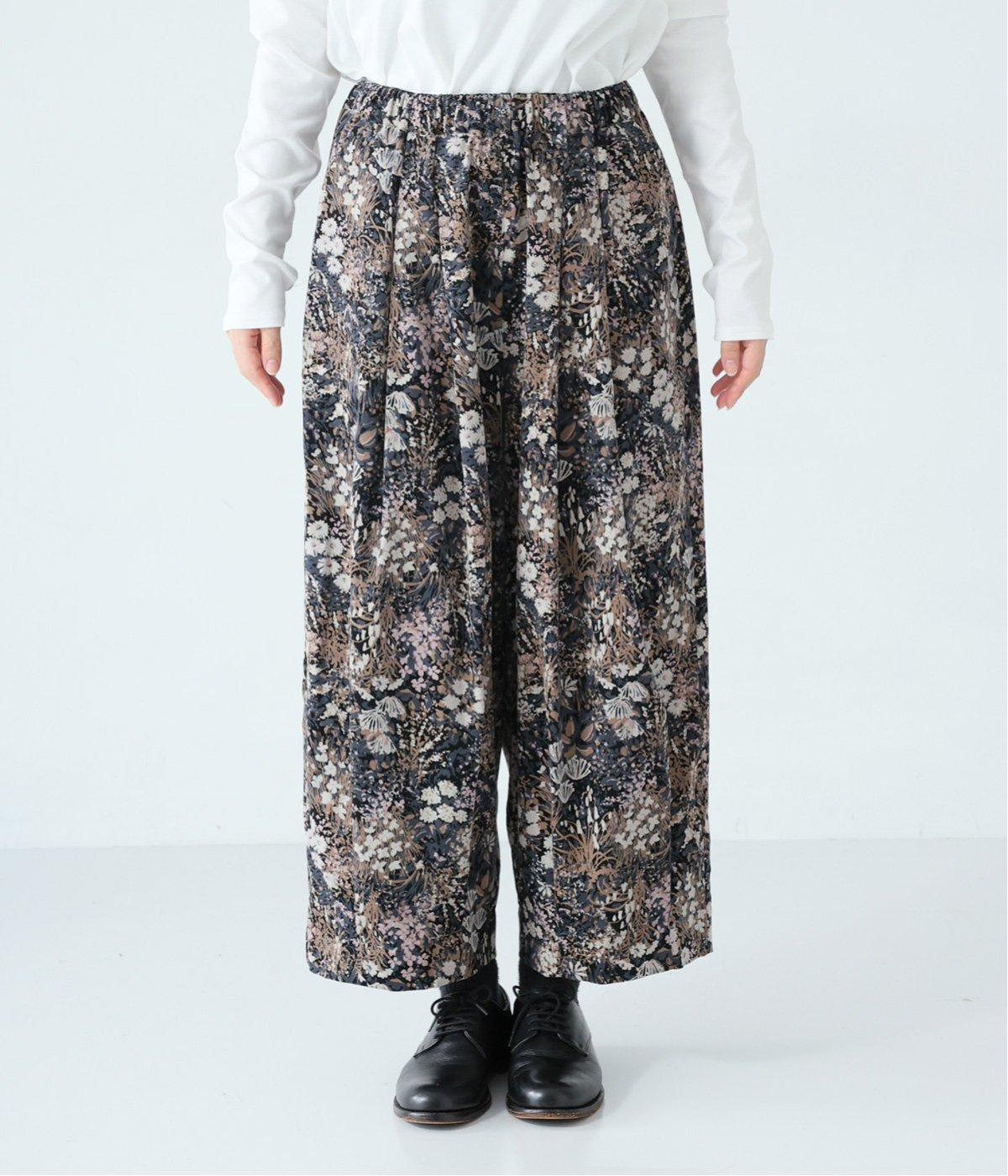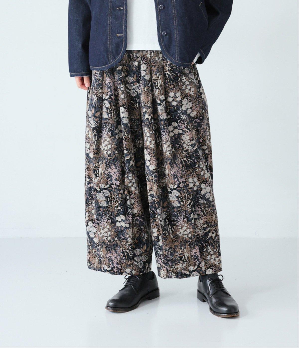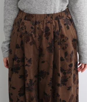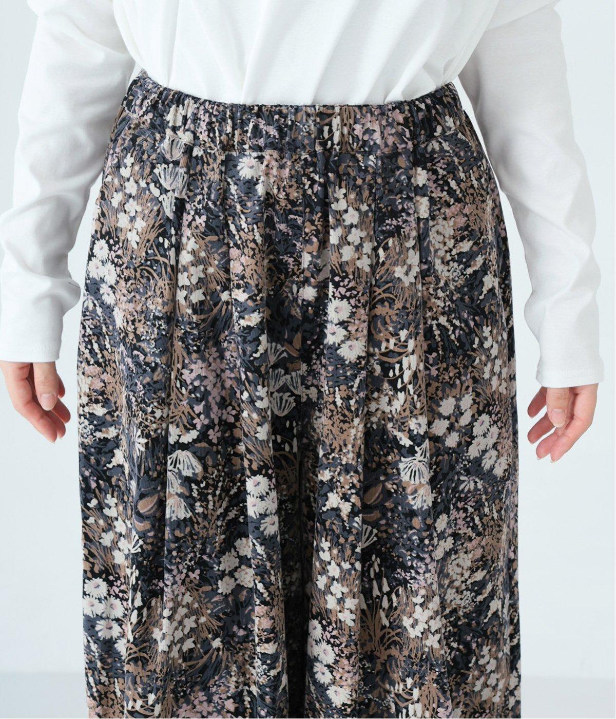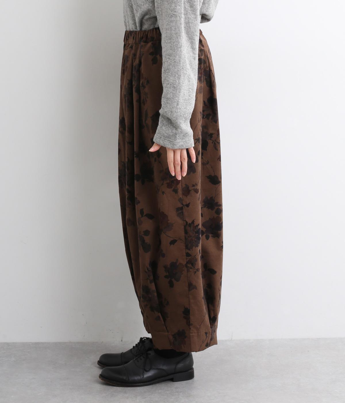 コーデュロイ生地にフラワープリントをあしらった、装いの主役になるパンツです。前後のウエスト下と裾にタックを入れ、体のラインを拾いにくい立体的なシルエットに仕上げました。ウエストは総ゴム仕様で、内紐を通しています。