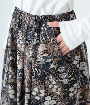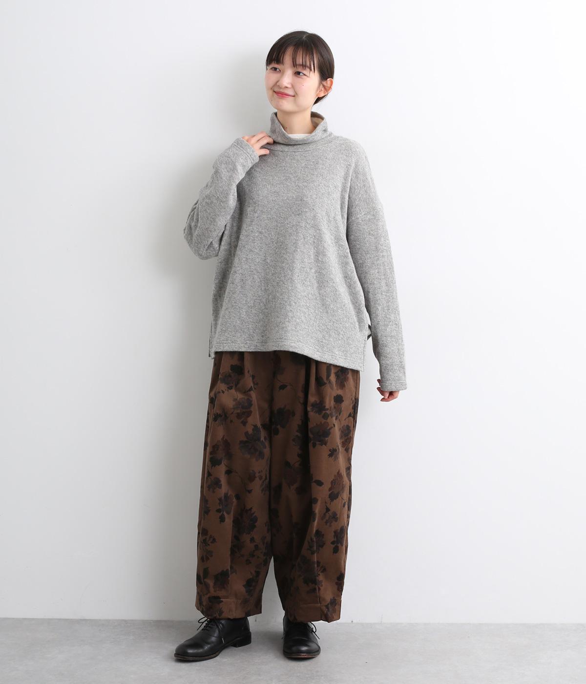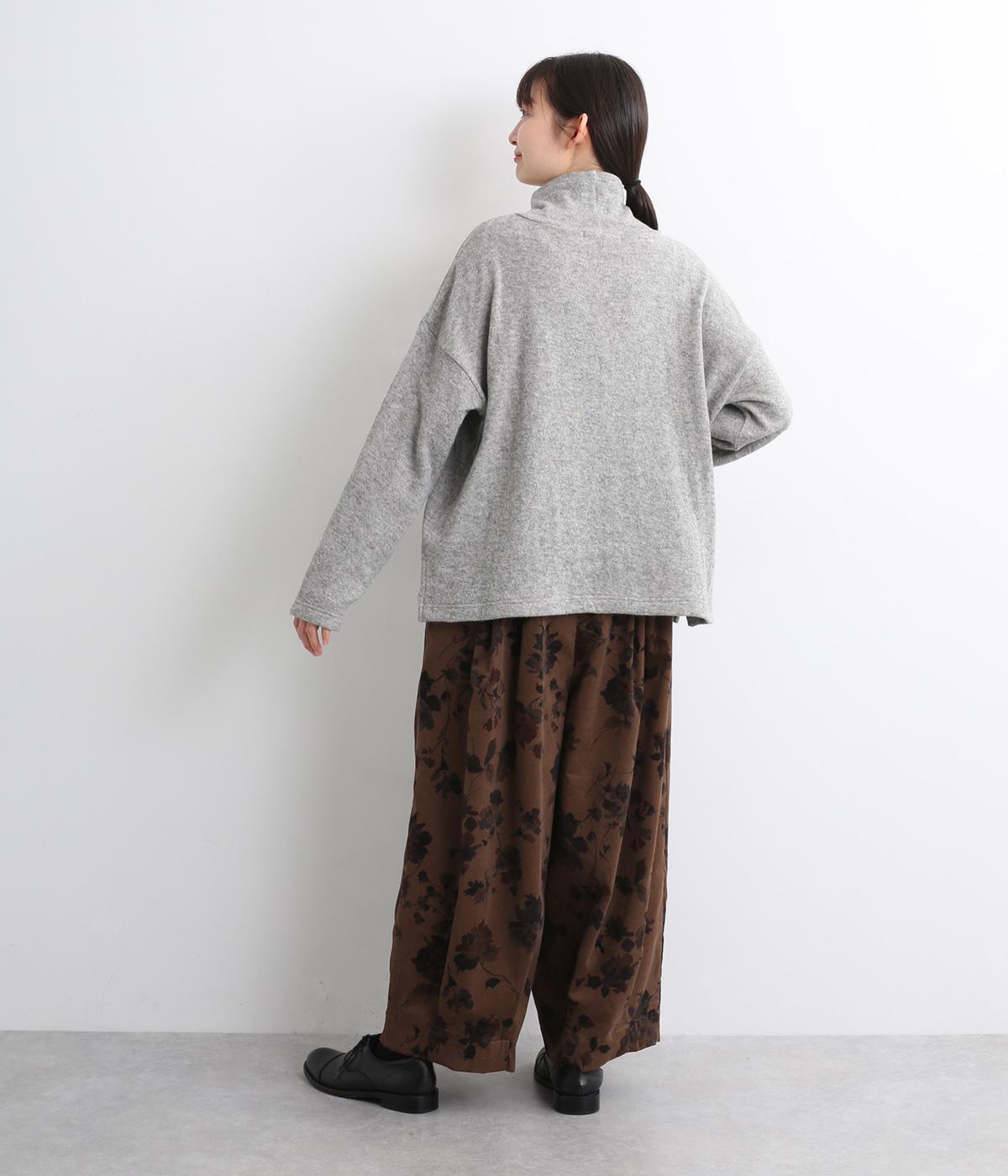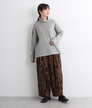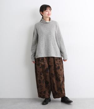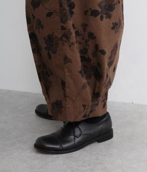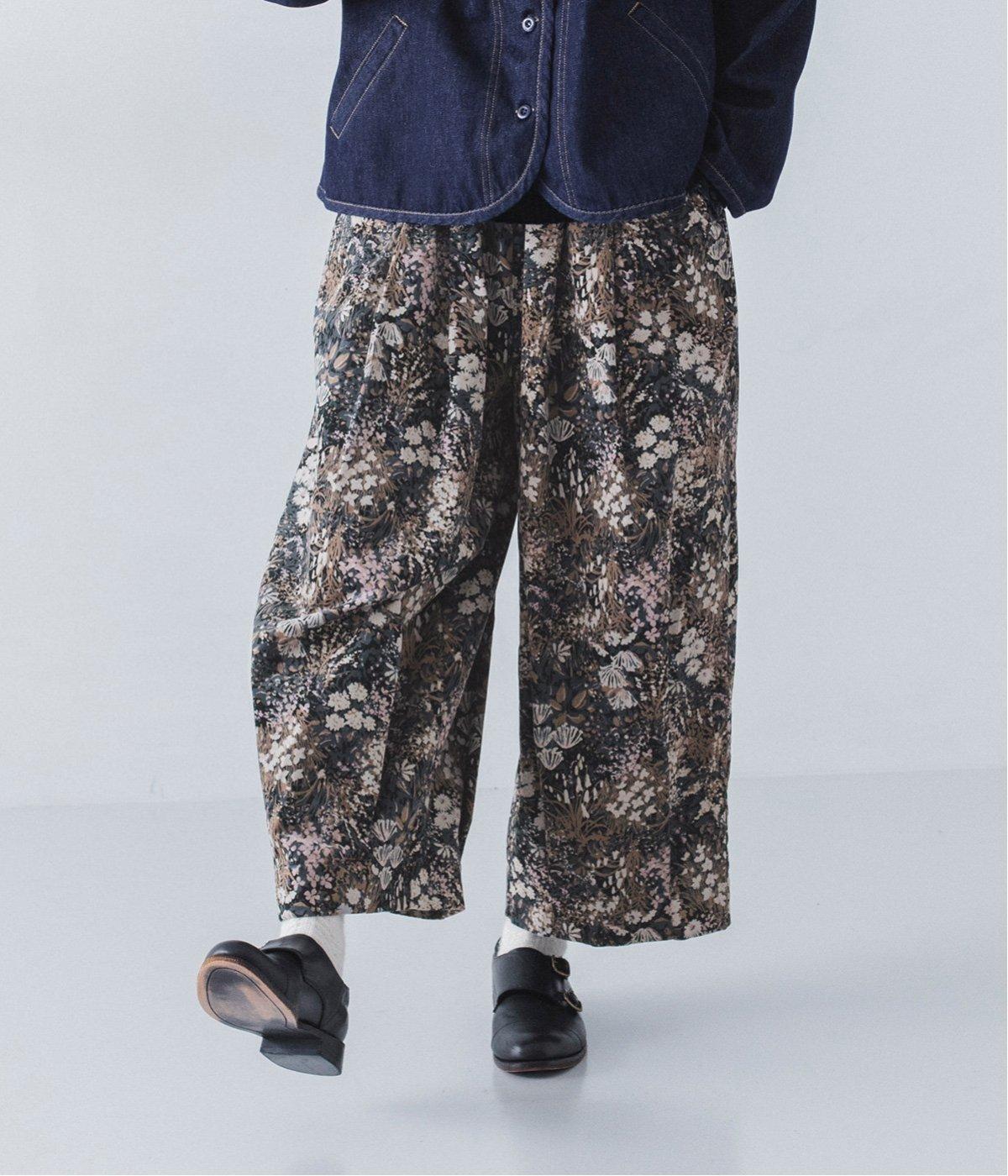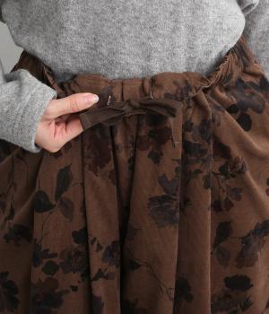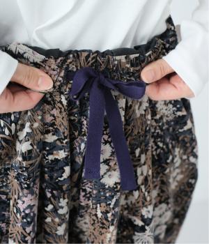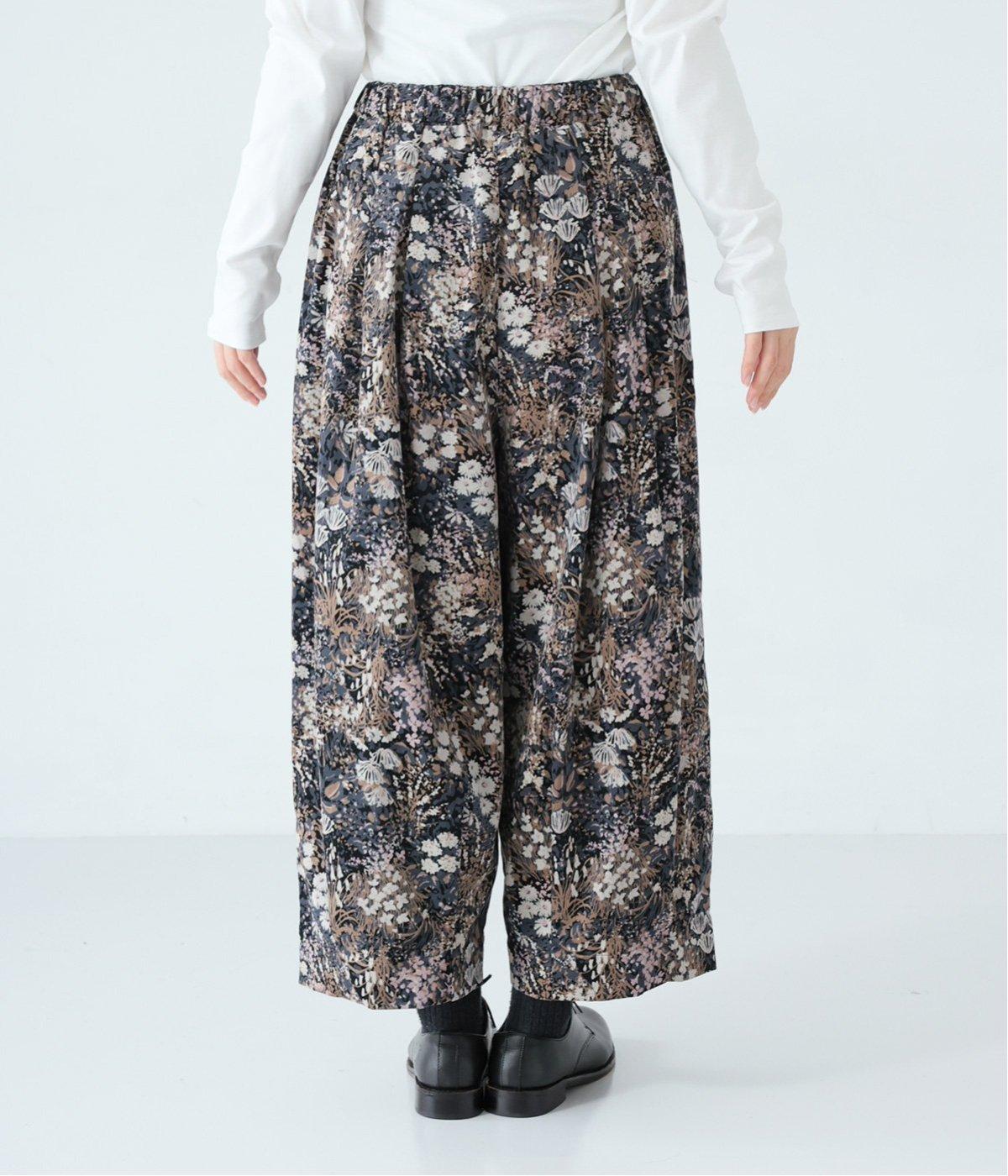 コーデュロイ生地にフラワープリントをあしらった、装いの主役になるパンツです。前後のウエスト下と裾にタックを入れ、体のラインを拾いにくい立体的なシルエットに仕上げました。ウエストは総ゴム仕様で、内紐を通しています。