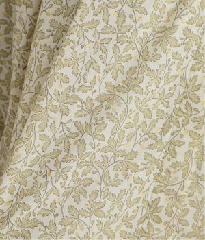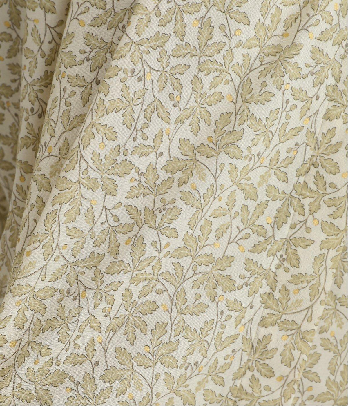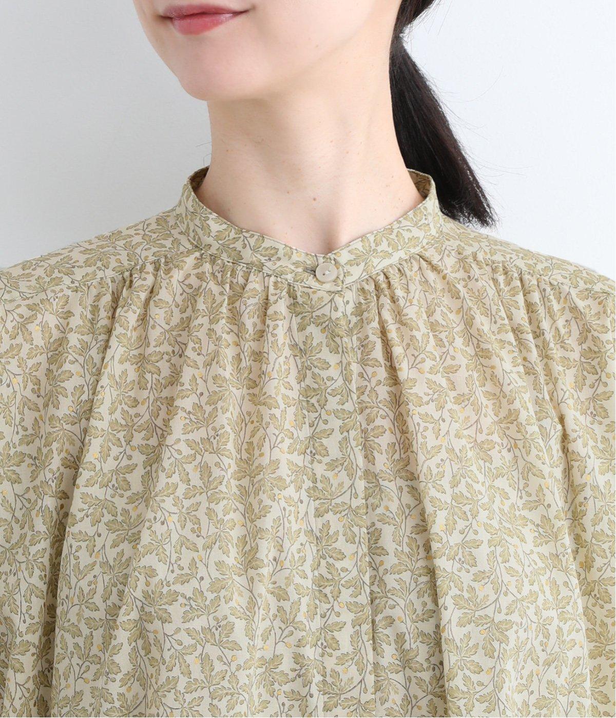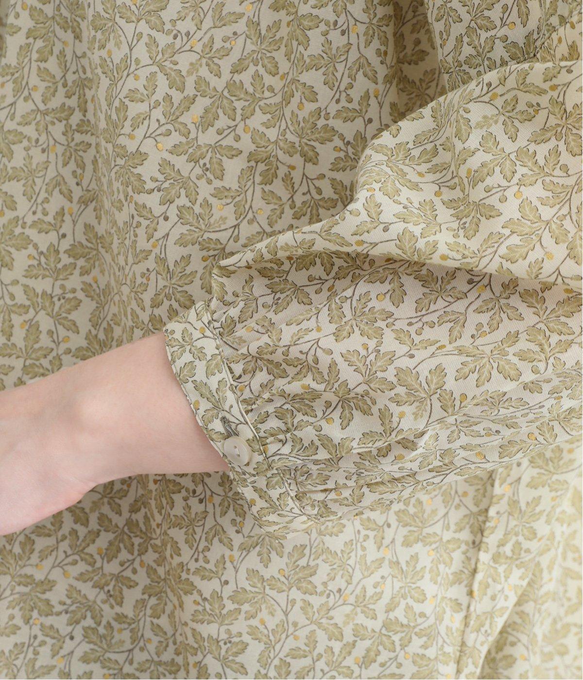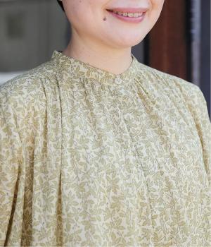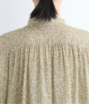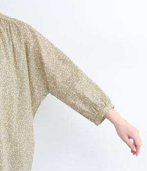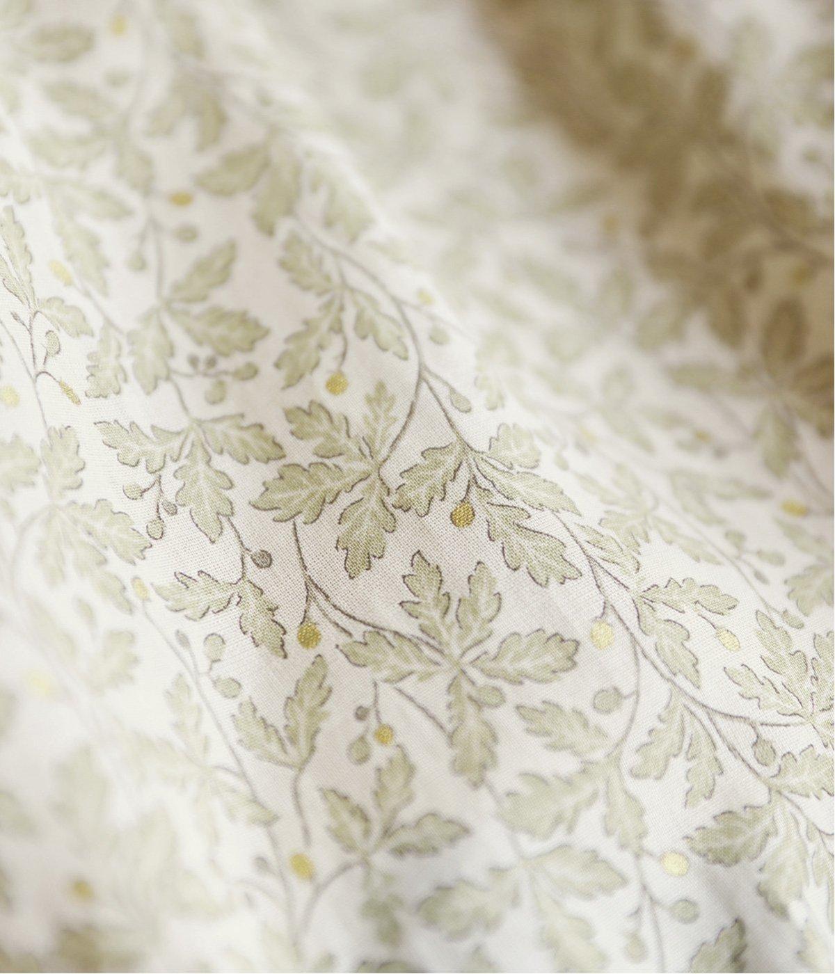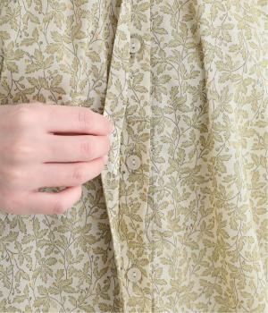控えめなリーフの総柄は、ところどころにラメドットをちりばめてさり気なくポイントを持たせました。ふわりとしたシルエットがやさしい雰囲気を生み、羽織り使いもたのしめる比翼開き仕様です。7分袖がちょうどいい抜け感を加えます。