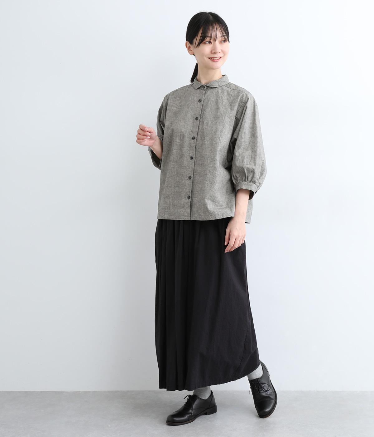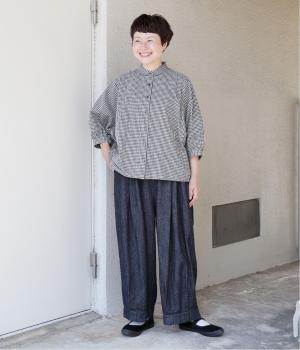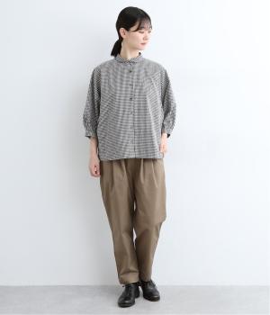 ソフトなコットンにすこしリネンをまぜてドライタッチとハリ感を加えました。適度にふくらみのある生地で着心地も良く、ロングシーズン着まわせます。