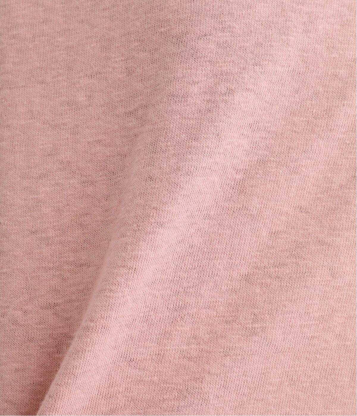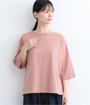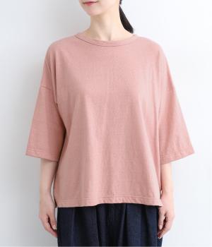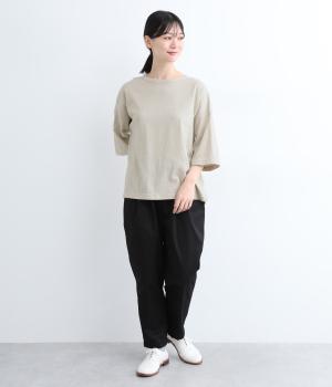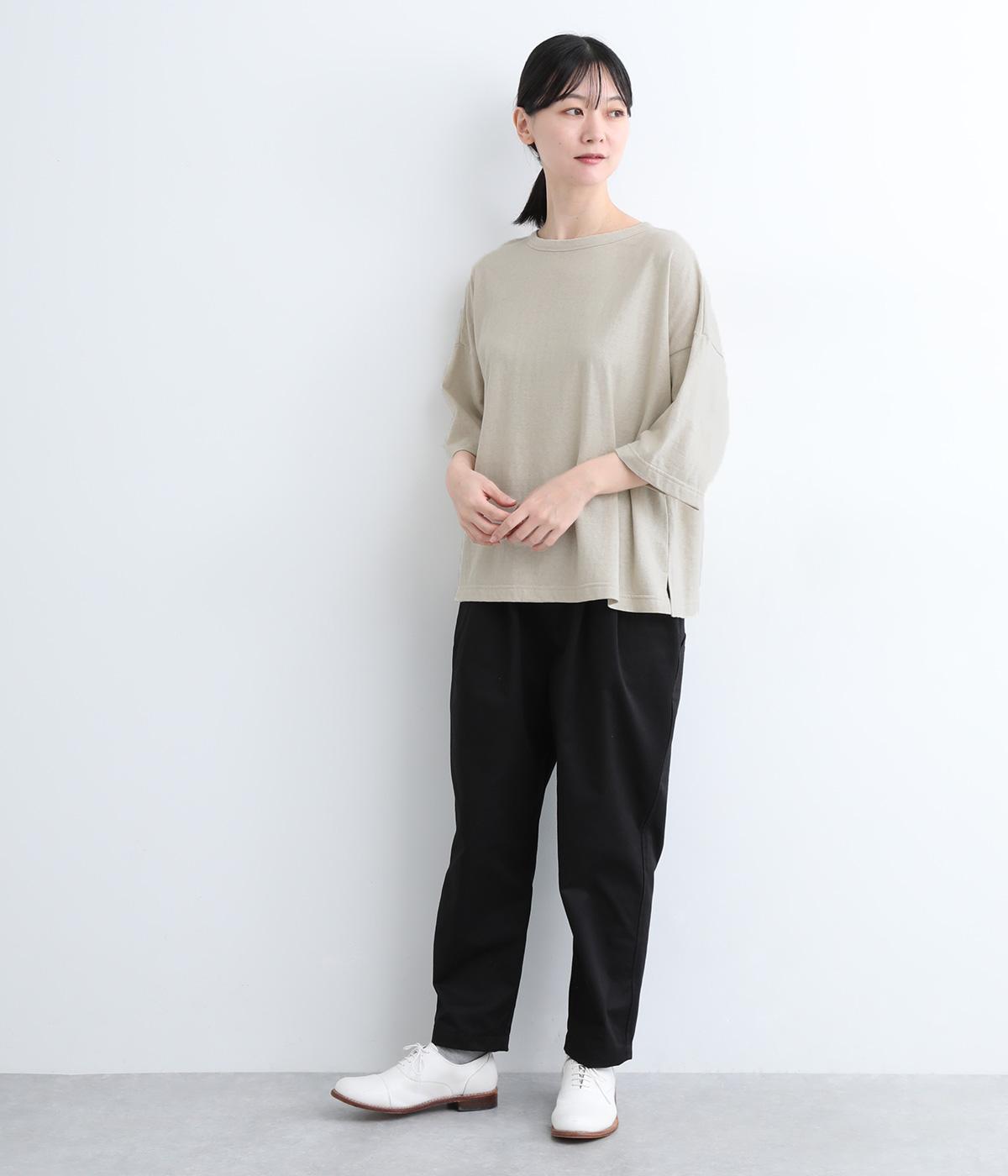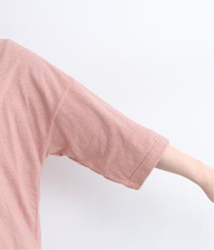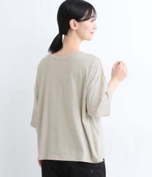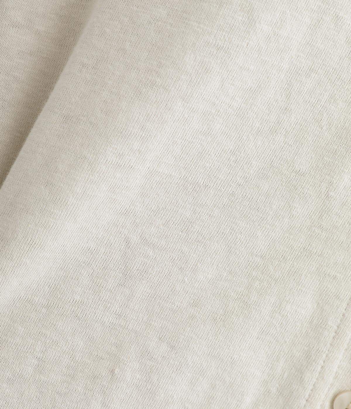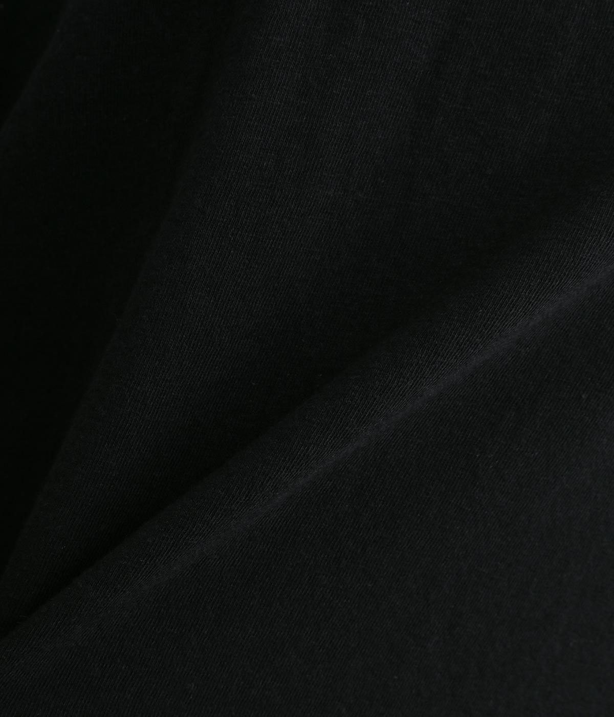 紡績工程で出る落ち綿を原料に混ぜて編まれたラフィ天竺を使用。ネップやムラ感によるユーズド感のある風合いが魅力的で、ソフトな肌触りで着心地も抜群です。
