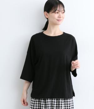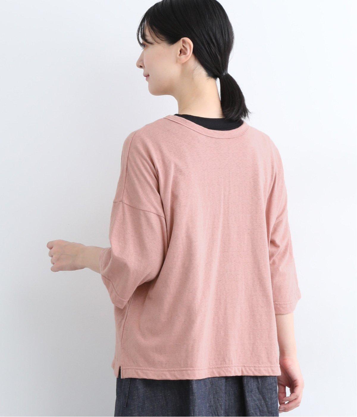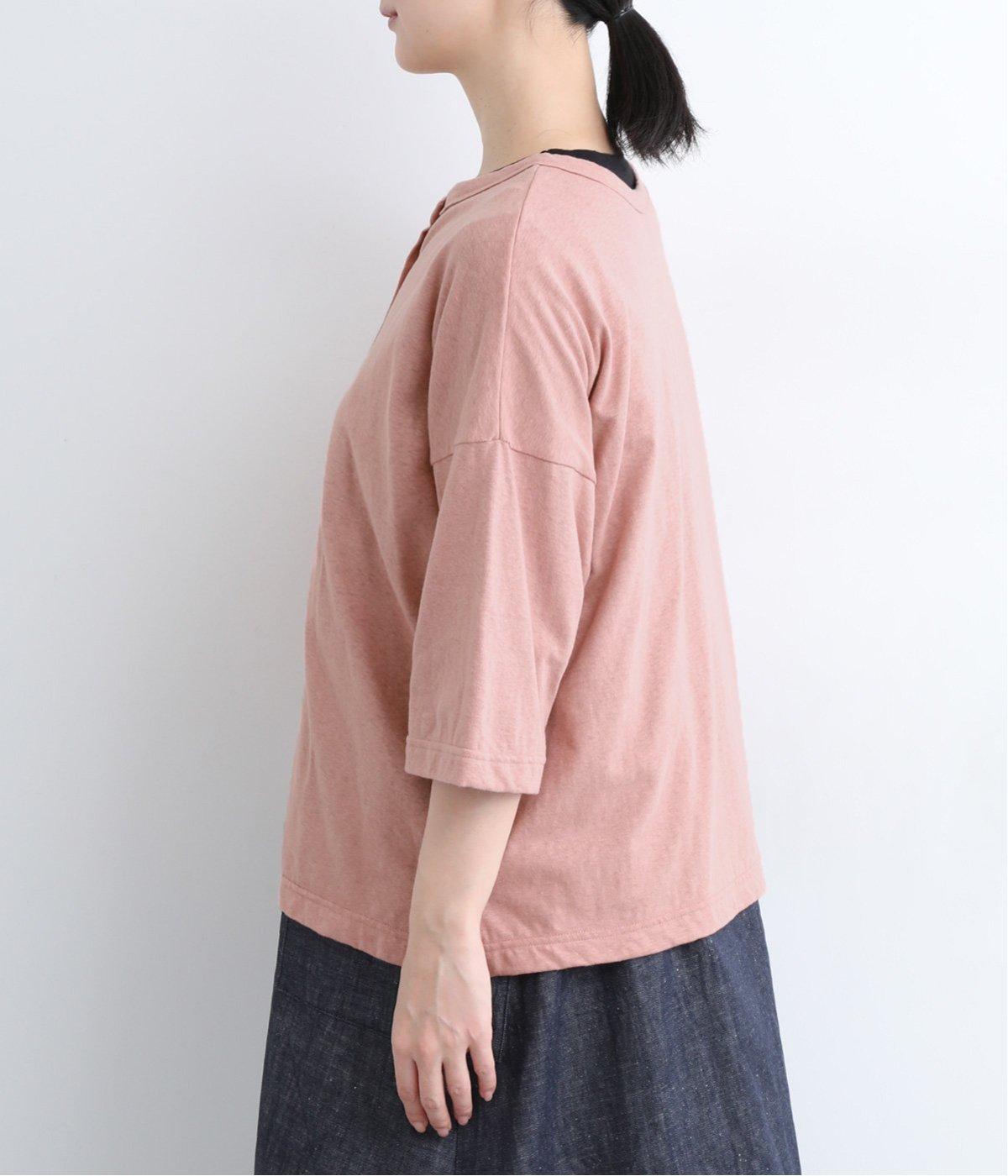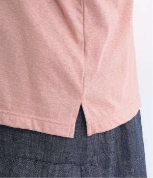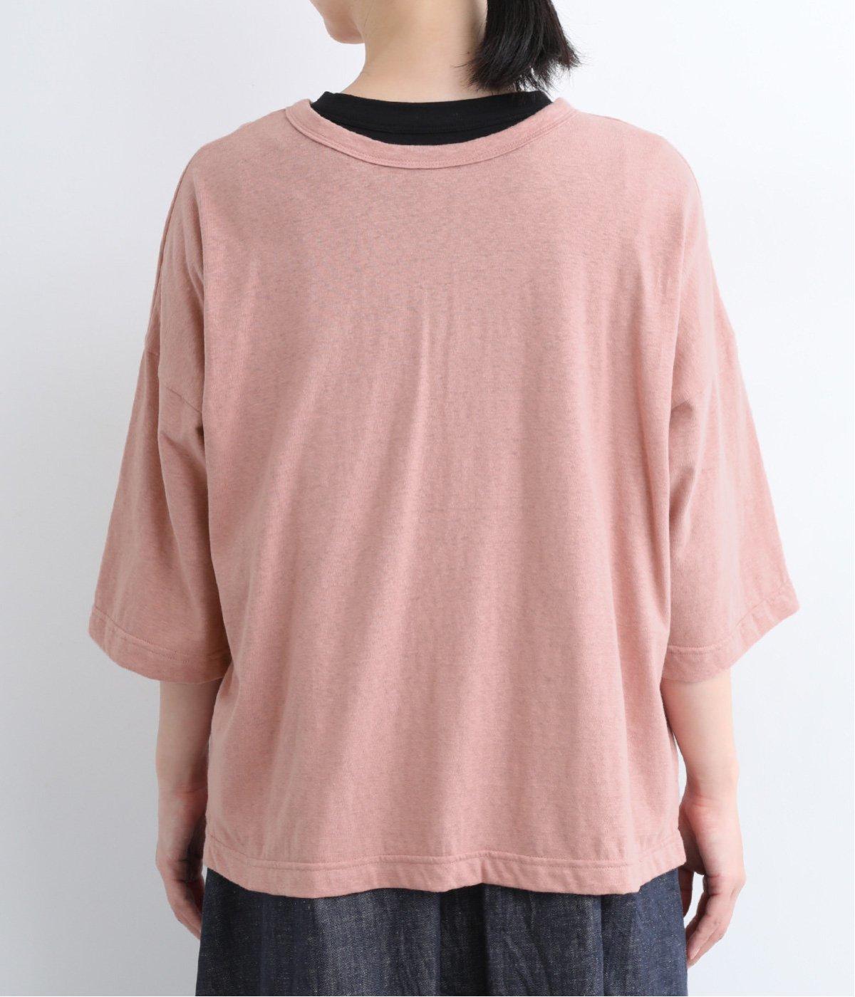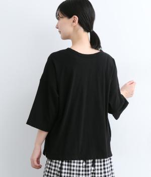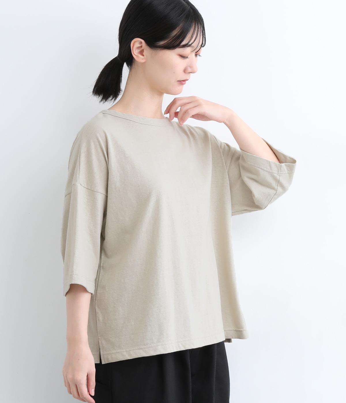 紡績工程で出る落ち綿を原料に混ぜて編まれたラフィ天竺を使用。ネップやムラ感によるユーズド感のある風合いが魅力的で、ソフトな肌触りで着心地も抜群です。