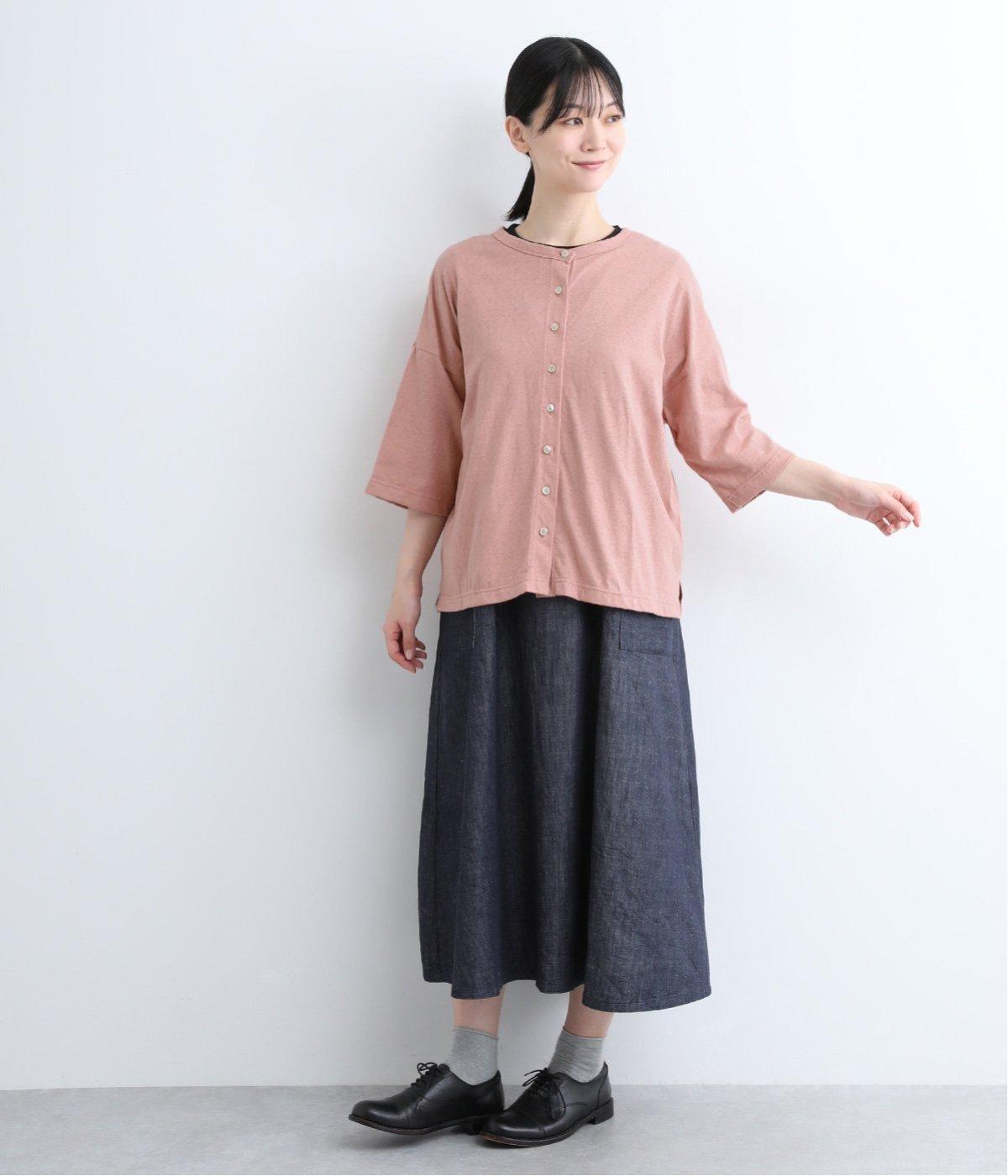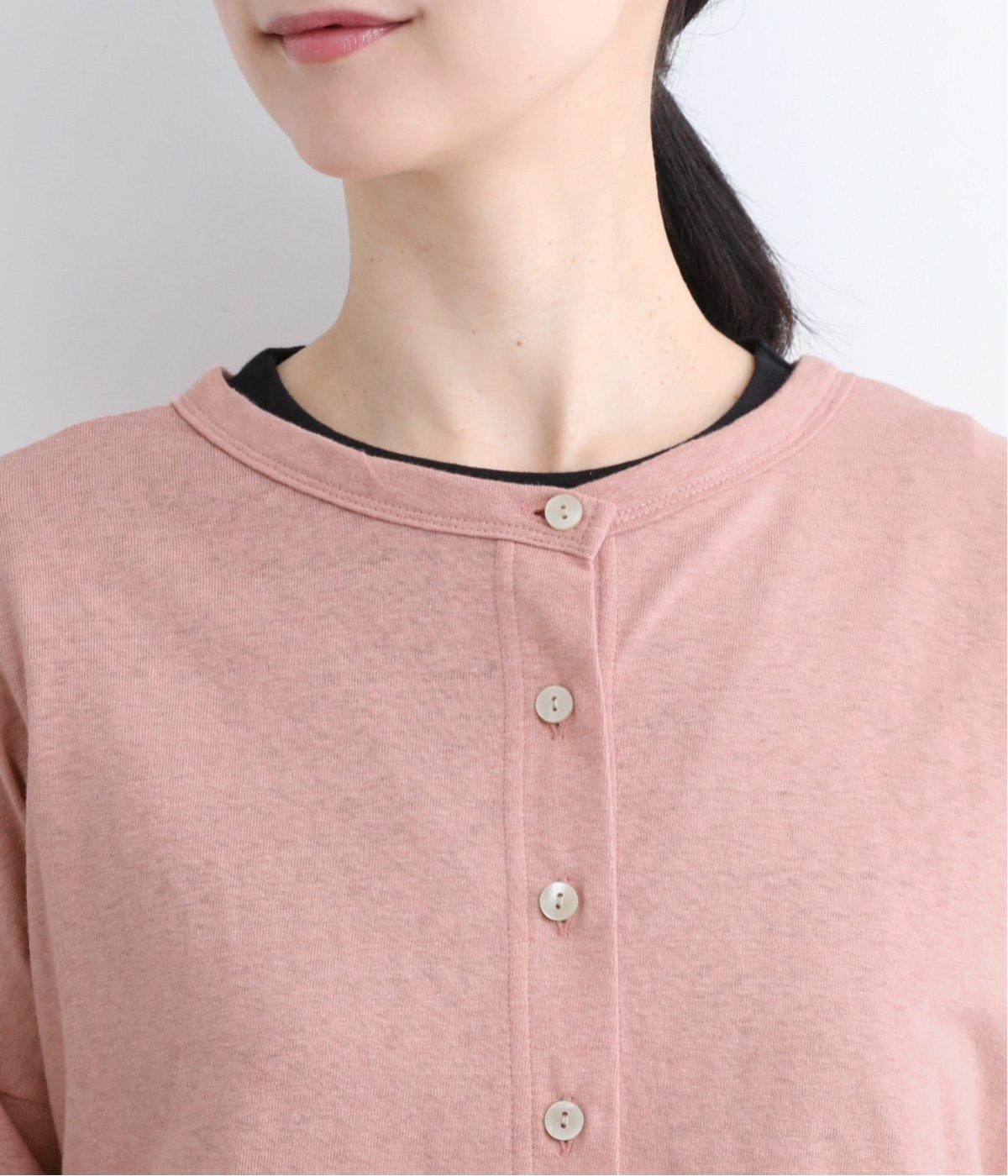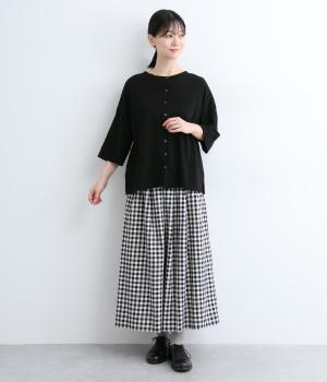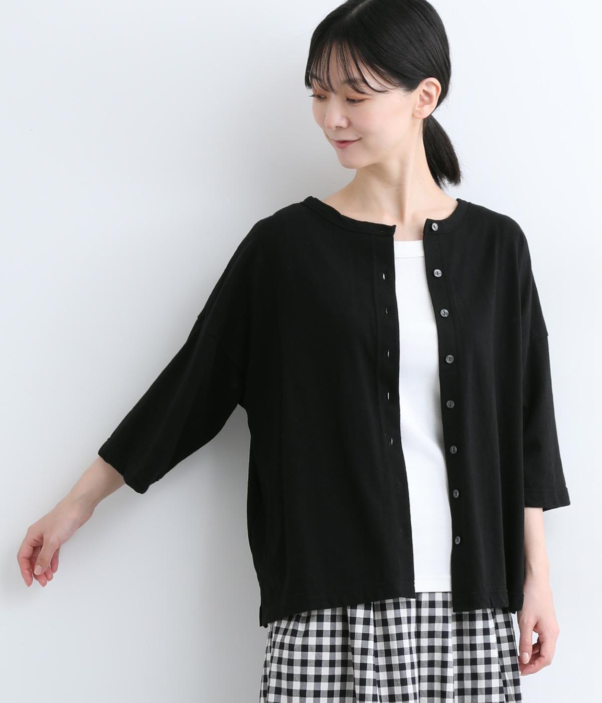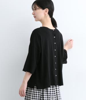 後ろボタンのプルオーバーにも、カーディガン風の羽織りとしても着まわせる前後2way。適度にゆとりのあるボックスシルエットで着まわしやすく、手元をすっきり見せた7分袖も◎。シワも気になりにくく持ち歩き用としても活躍。