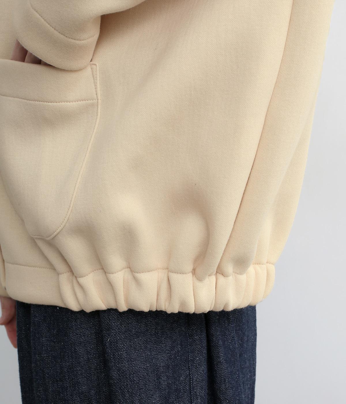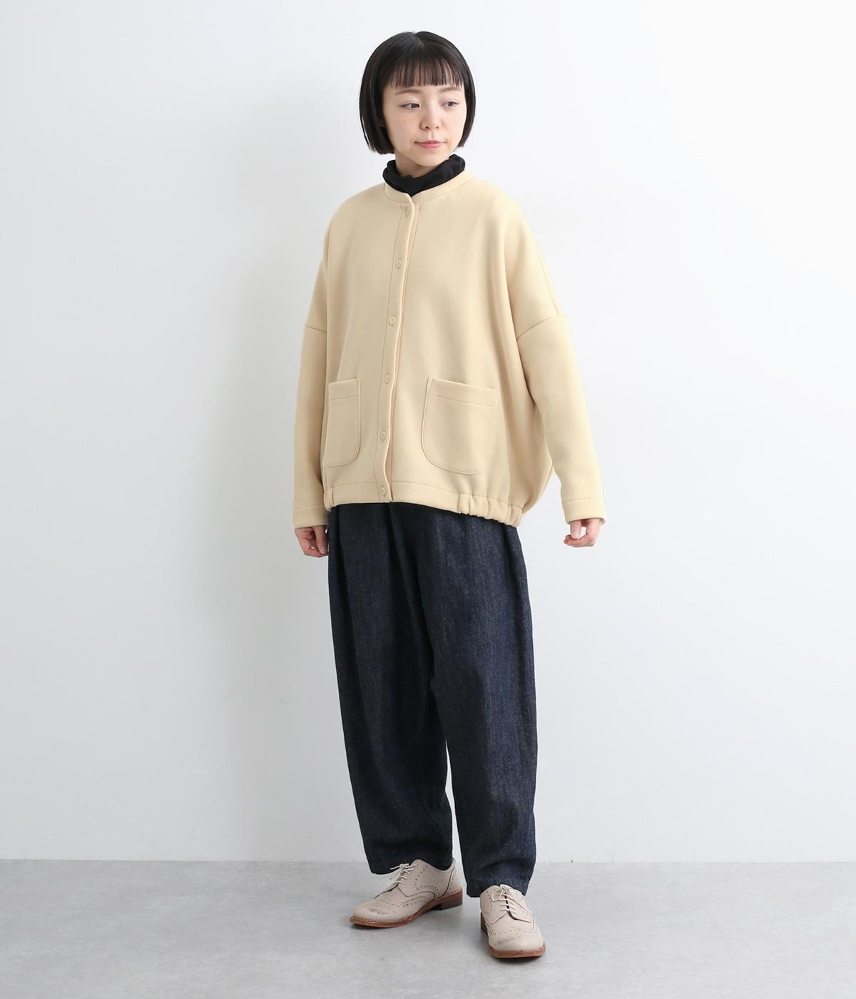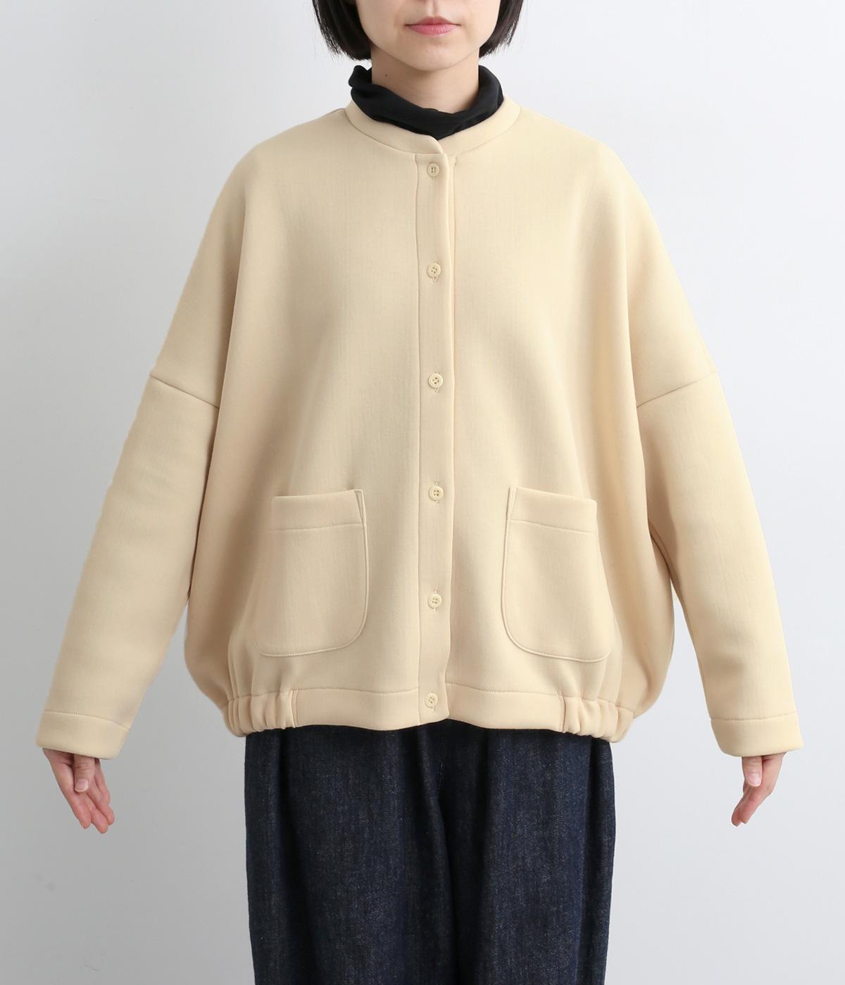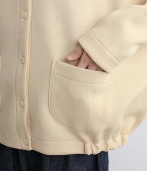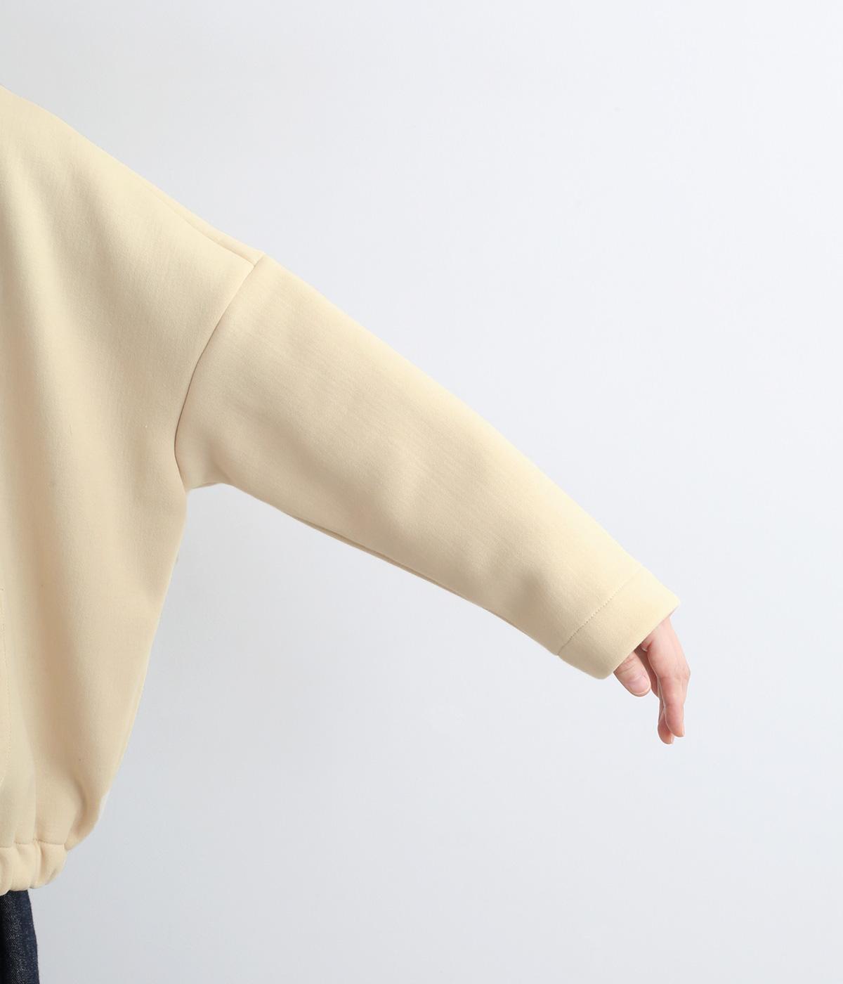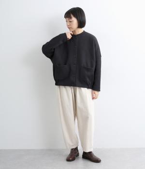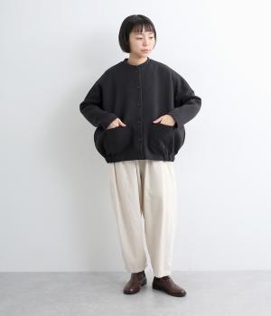 適度な厚みと弾力のあるコットン混ダンボールニット生地で仕立てました。空気を含む構造のため保温性が高く、軽いのにハリがあって型崩れしにくいのが魅力です。