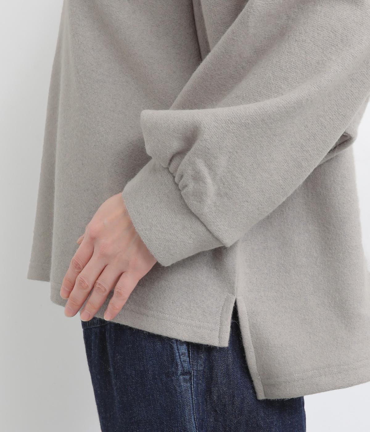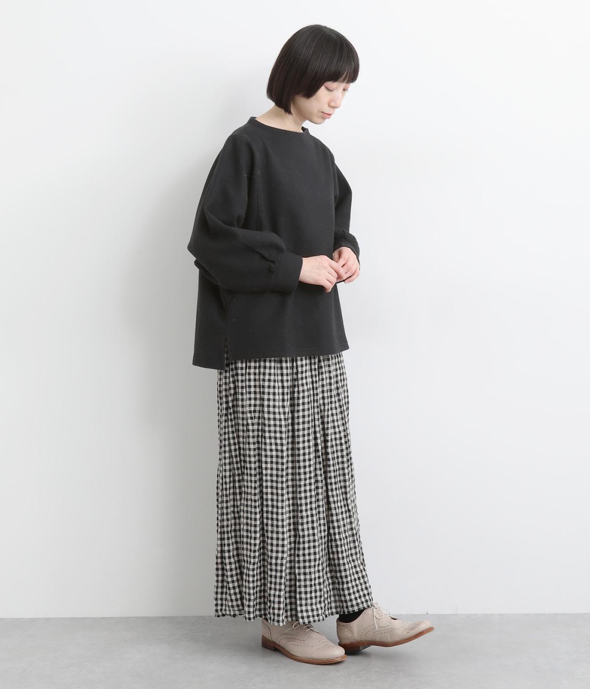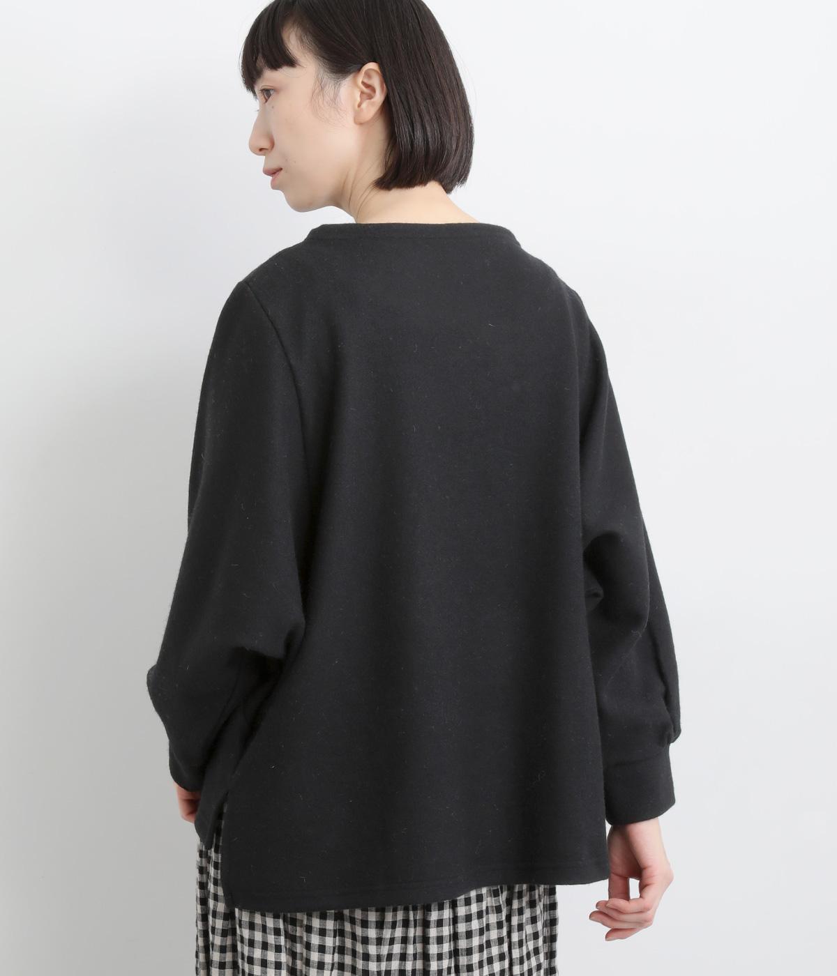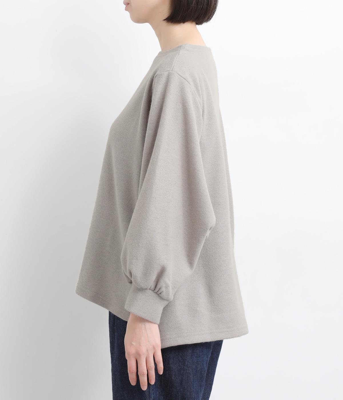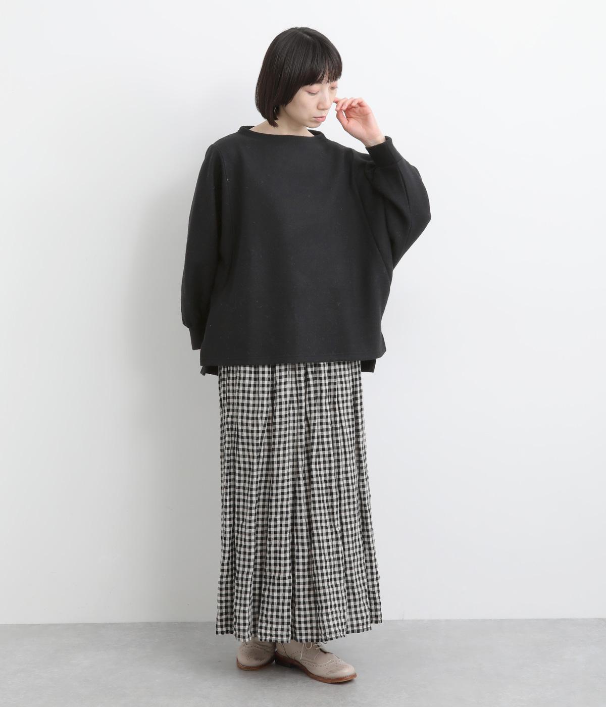 ゆとりを持たせた身幅と、丸みのあるワイドスリーブがやさしい雰囲気を演出。肩まわりがたっぷりとしたラインながら、ボートネックがほどよい上品さを添えています。前後差のある裾が抜け感をあたえ、着こなしに立体感をプラス。毎日のコーディネートに取り入れやすいデザインです。