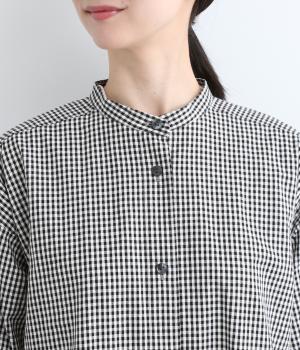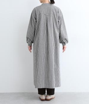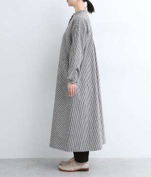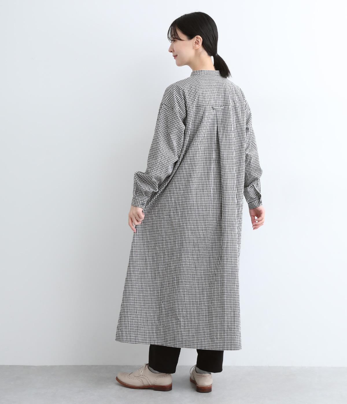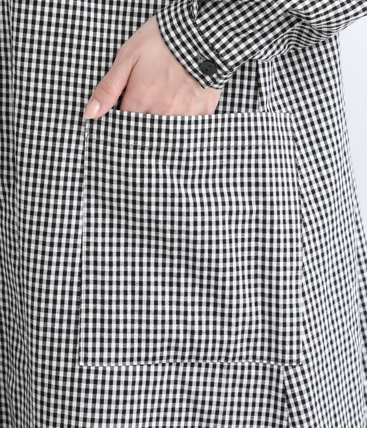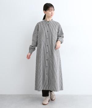 総柄でも着こなしやすい、モノトーンのギンガムチェックワンピースです。すっきりしたバンドカラーに適度なフレアシルエット、サイドポケットつきでデイリー使いしやすいデザインに。ふわりとさせた袖はカフスつきで、ラフに折り返しても◎。