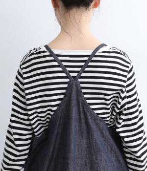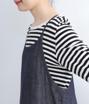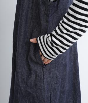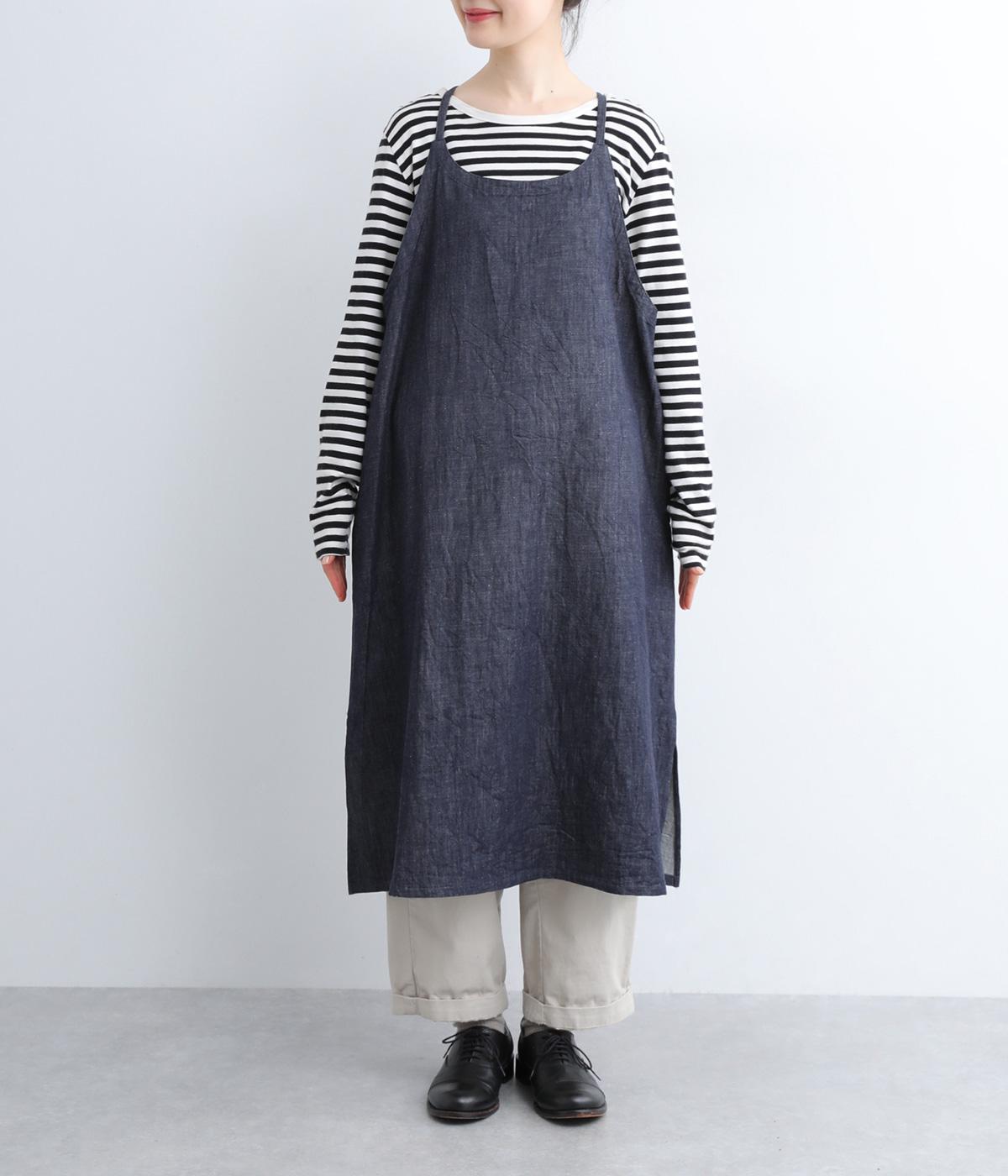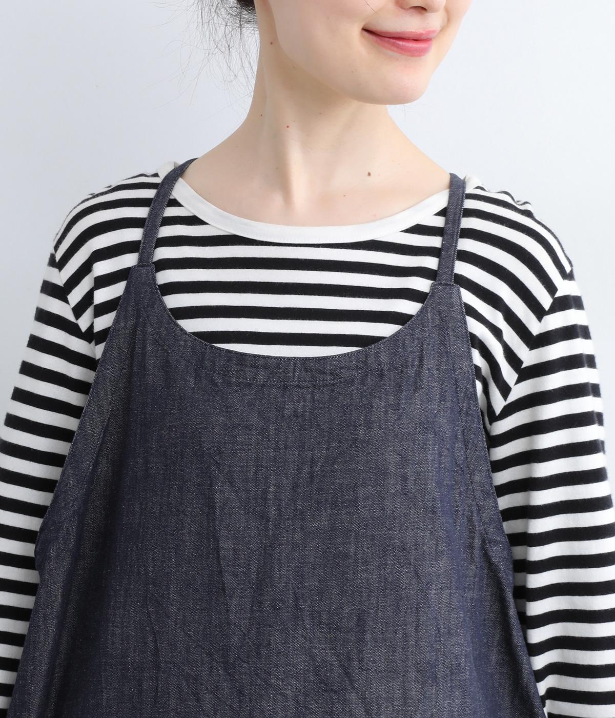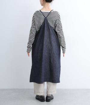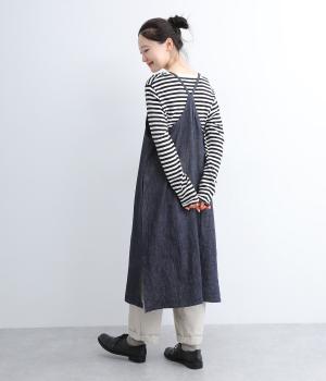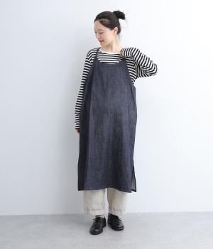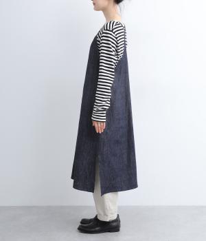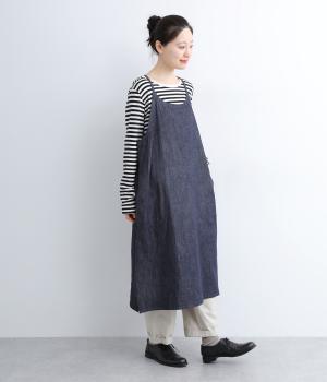 レイヤードスタイルがたのしめるエプロンタイプのデニムワンピースです。細めの肩紐がカジュアル感をおさえるポイント。サイドスリットが入っているので足さばきも良く、さまざまなボトムと相性よく合わせられます。