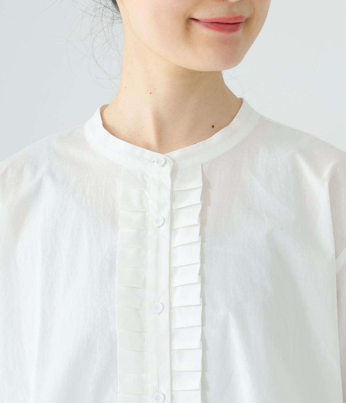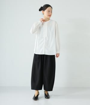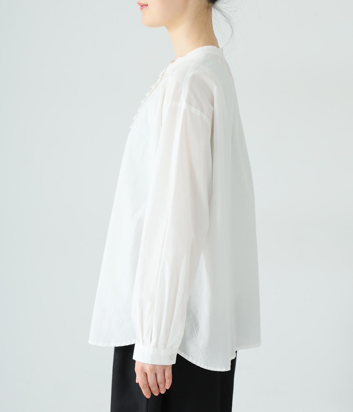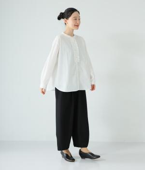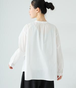 甘さ控えめのタックフリルデザインが目を引くブラウス。バックネックのギャザーで後ろ姿にも華やかさを添えました。やわらかな印象にまとめるラウンドヘムが◎。カジュアルにもきれいめにも合わせやすく、インナーとしても重宝します。