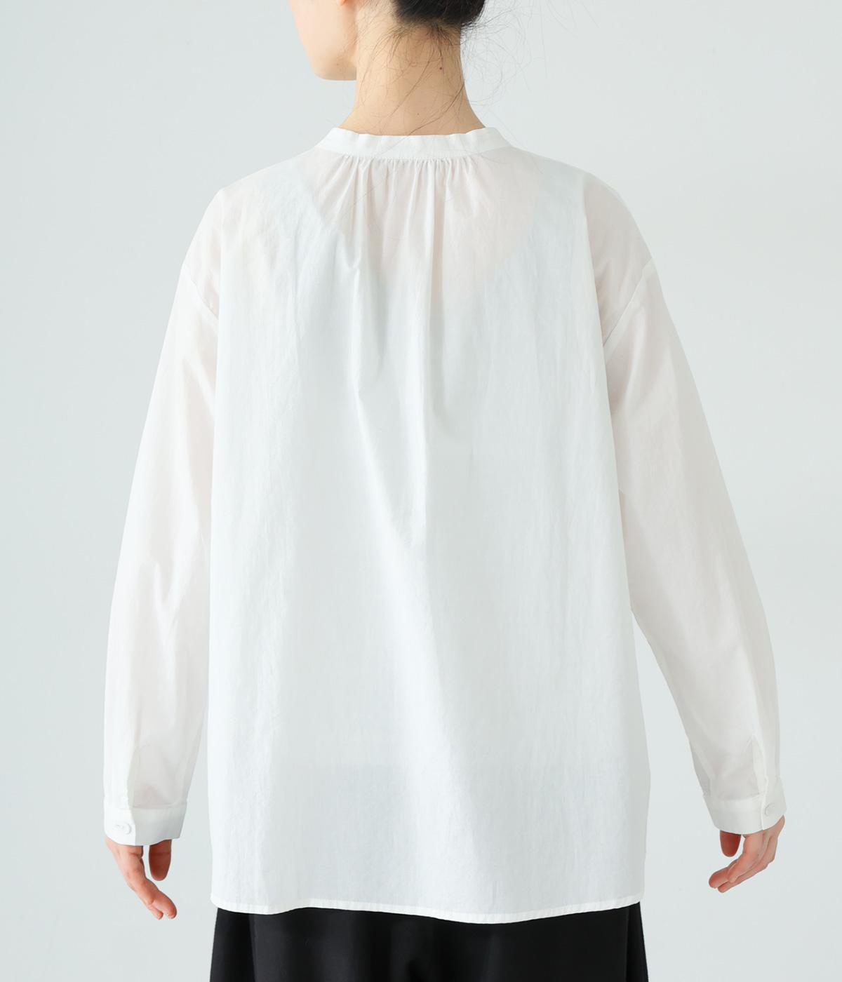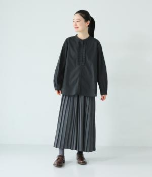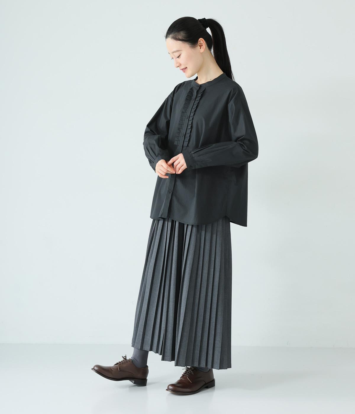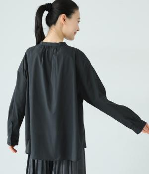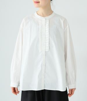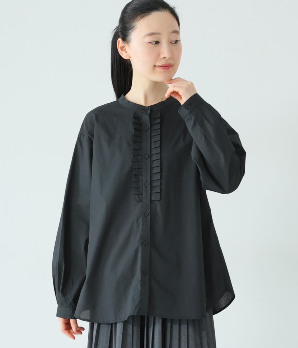 甘さ控えめのタックフリルデザインが目を引くブラウス。バックネックのギャザーで後ろ姿にも華やかさを添えました。やわらかな印象にまとめるラウンドヘムが◎。カジュアルにもきれいめにも合わせやすく、インナーとしても重宝します。