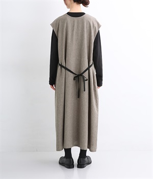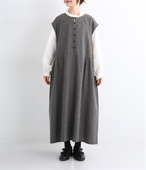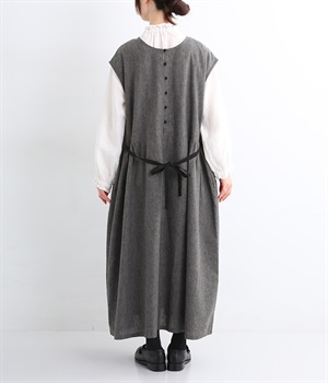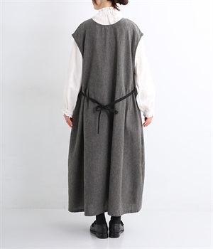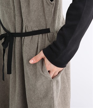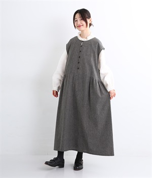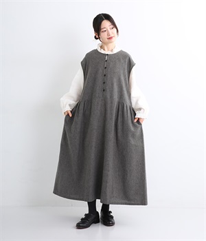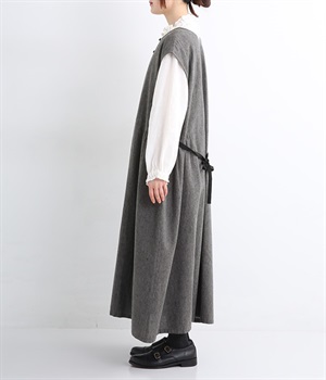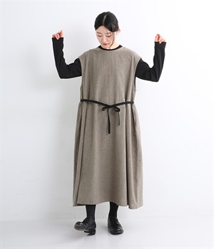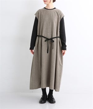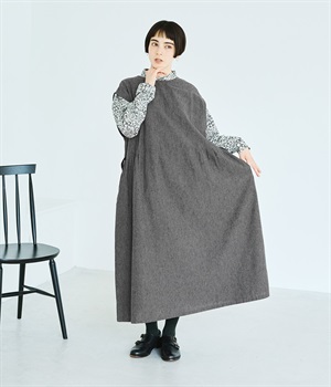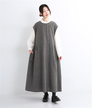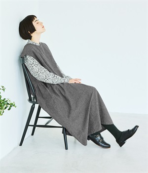 アームホールが広く、厚手のトップスを重ねればロングシーズン重宝します。中に着るアイテム次第で温度調整できるのも、ジャンパースカートならではの魅力。