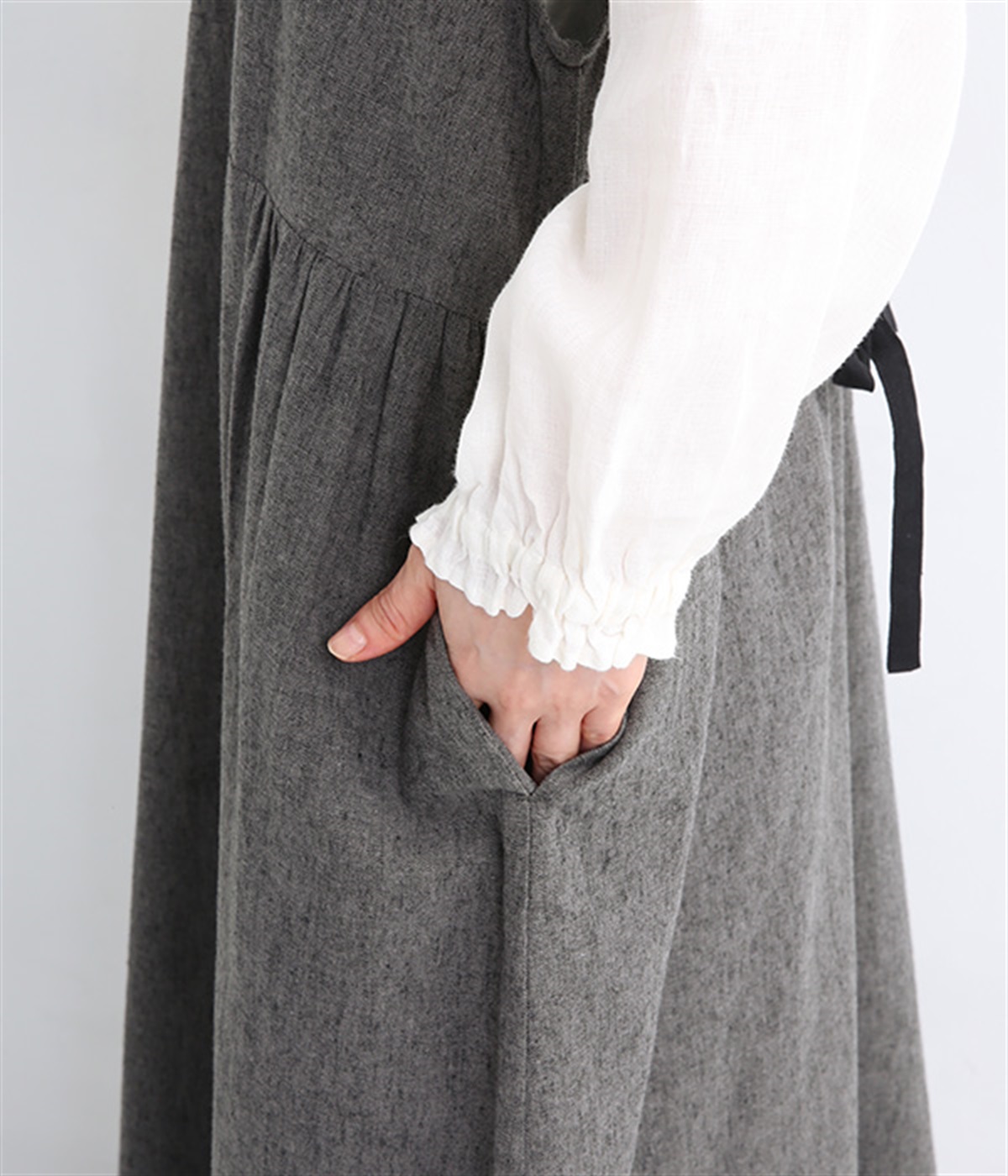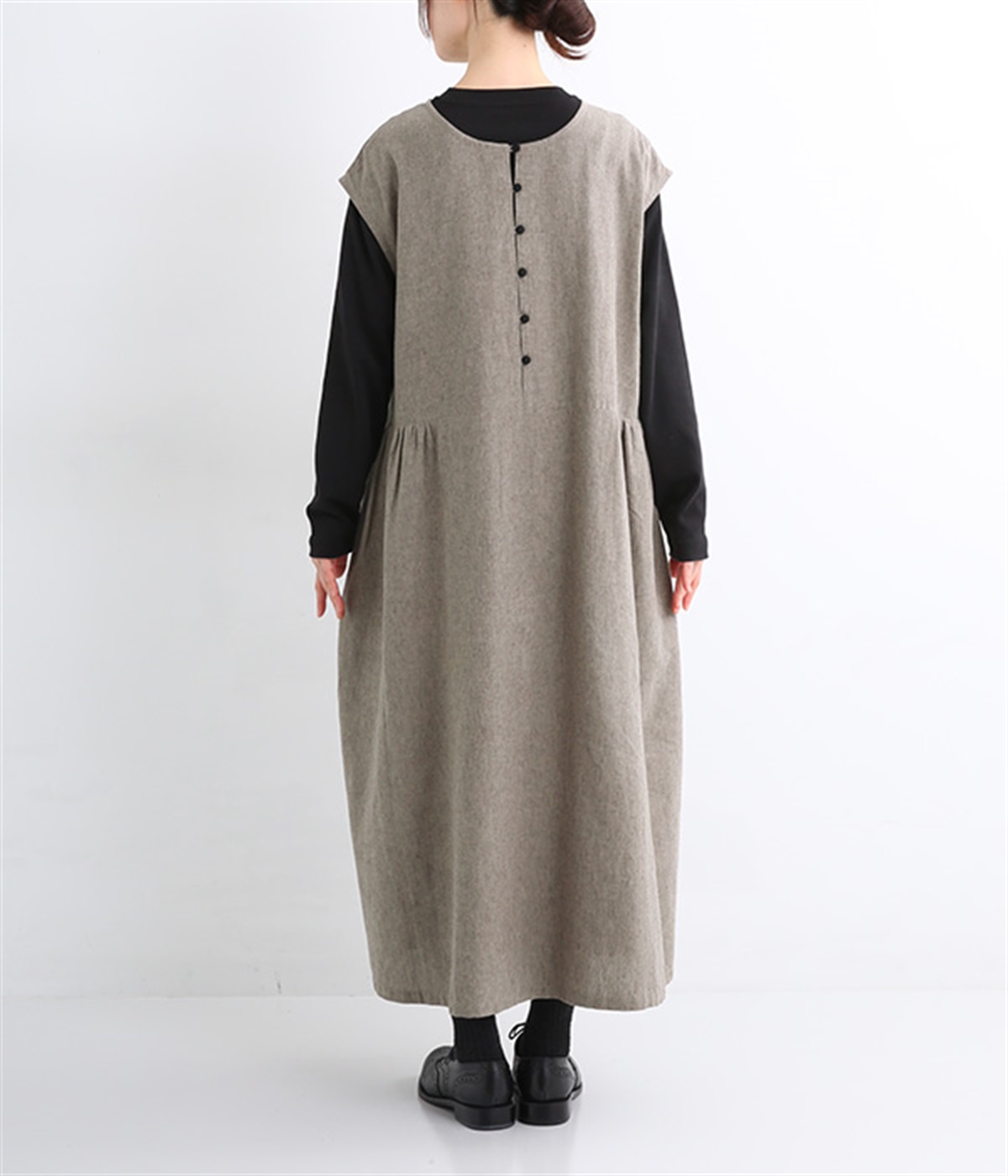 風合い豊かなベージュは、フリルのブラウスで甘さを添えたクラシカルなコーディネートに。ゆったりとしたシルエットながらも上品に着こなせて、さまざまなシーンで活躍するジャンパースカートです。