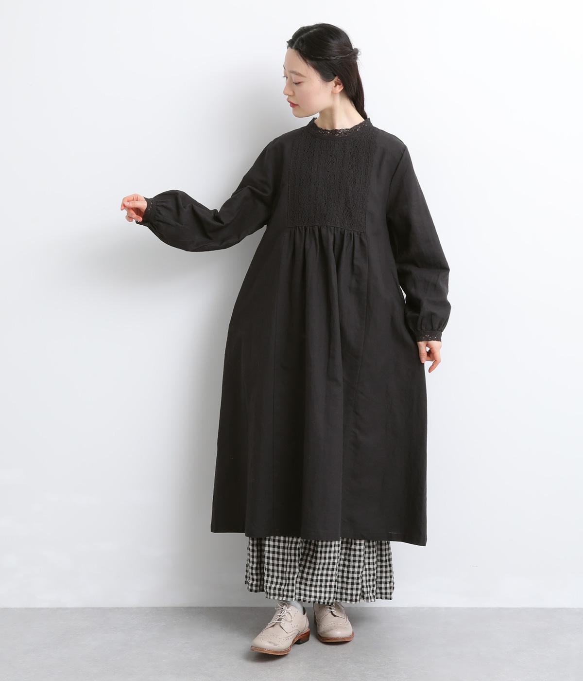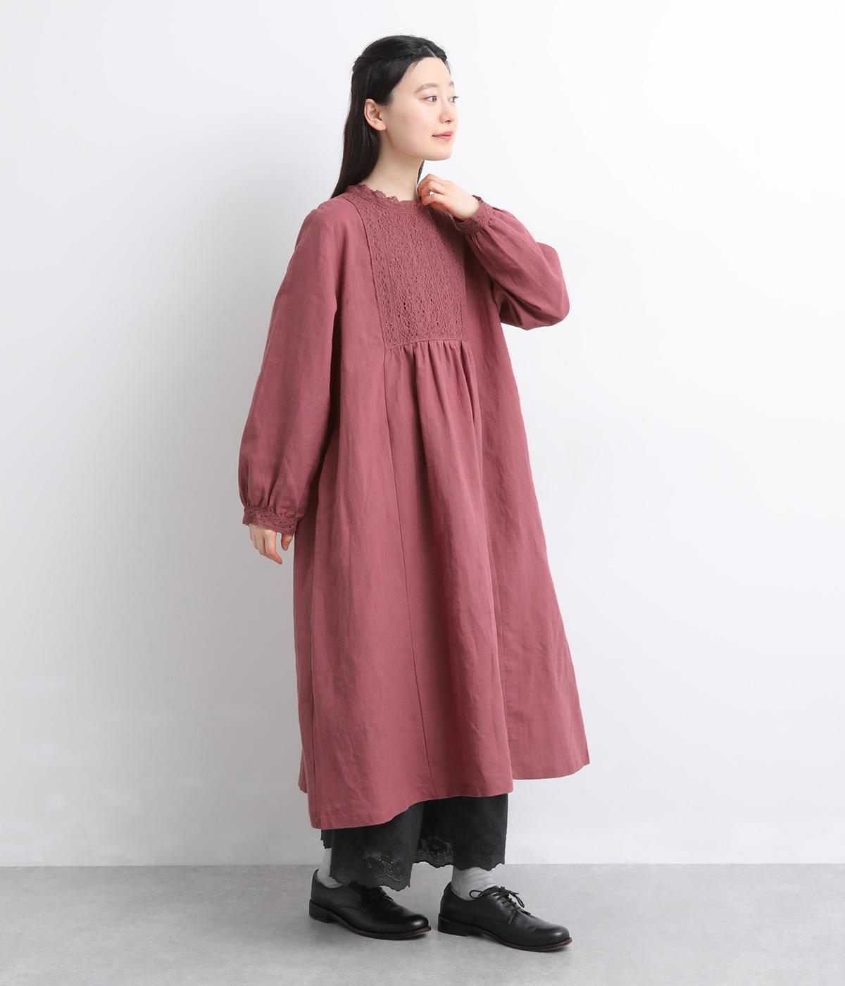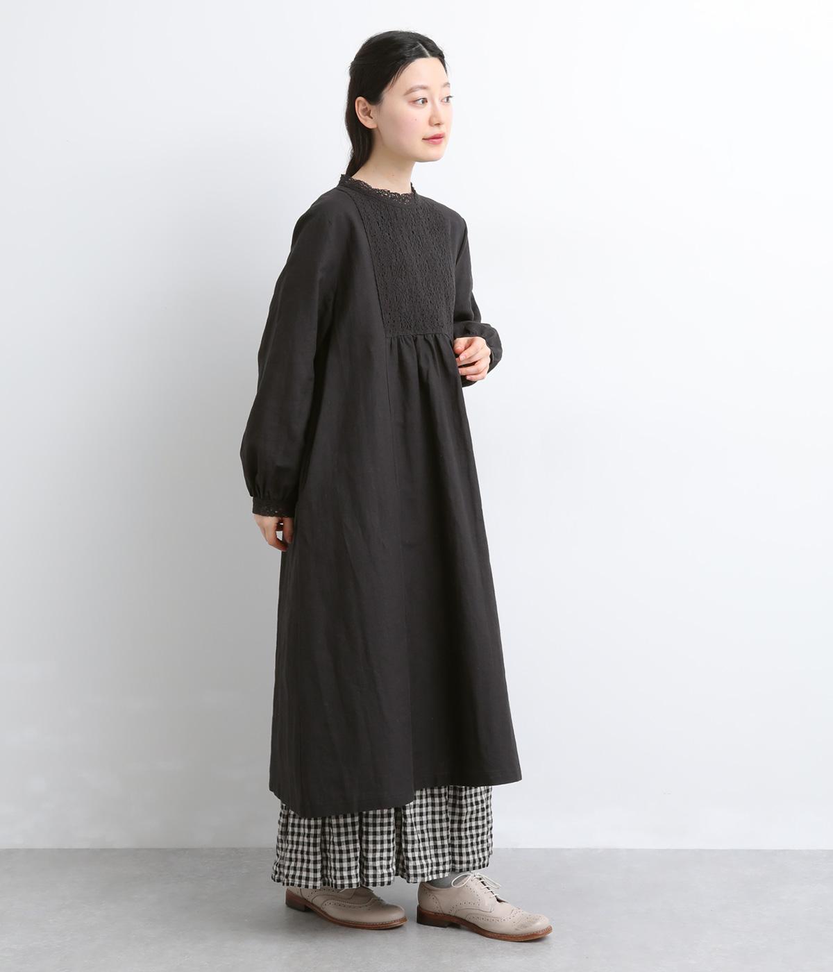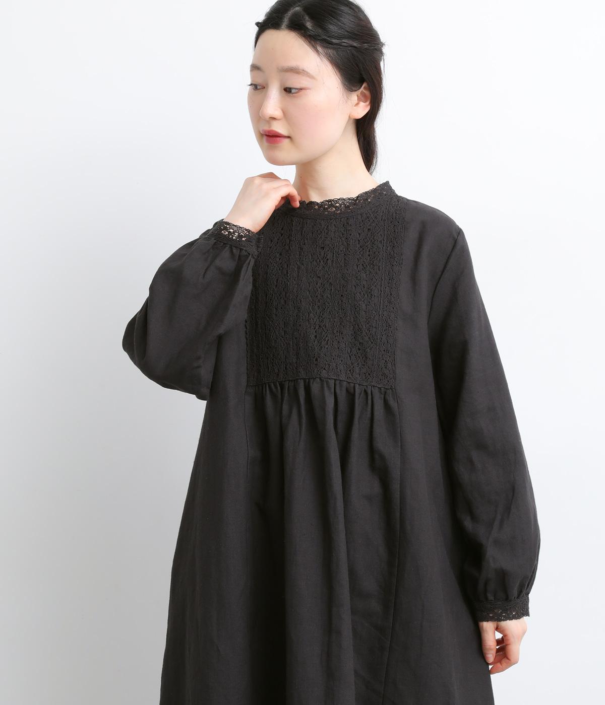 繊細なレースを重ねたフロントデザインが、やさしい華やぎを添えるワンピースです。レースの軽やかな表情が、フェミニンな雰囲気を演出します。胸下の切り替えと袖口にギャザーを寄せ、シルエットにふんわりとした丸みを持たせました。背面はボタン仕様で、着脱のしやすさにも配慮しています。