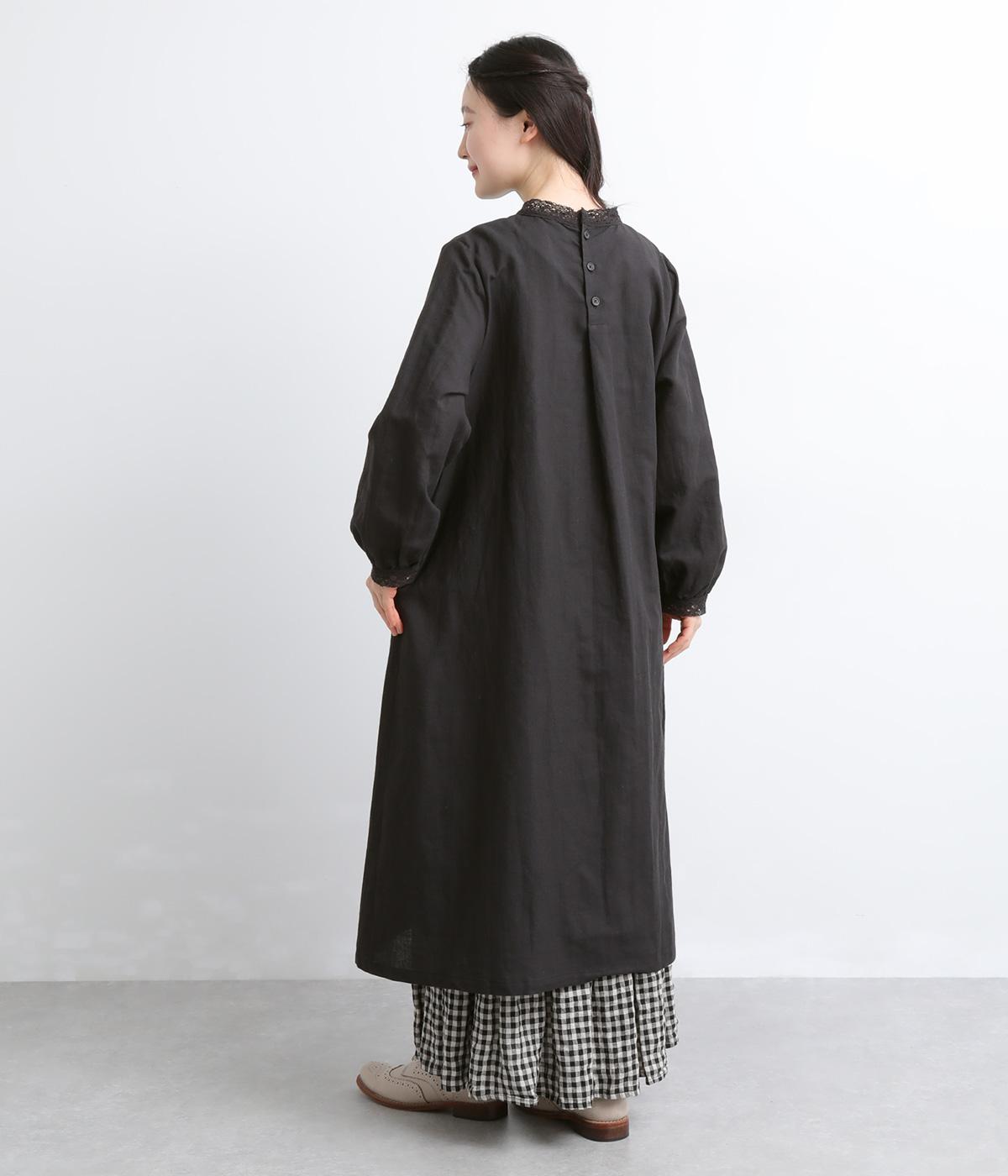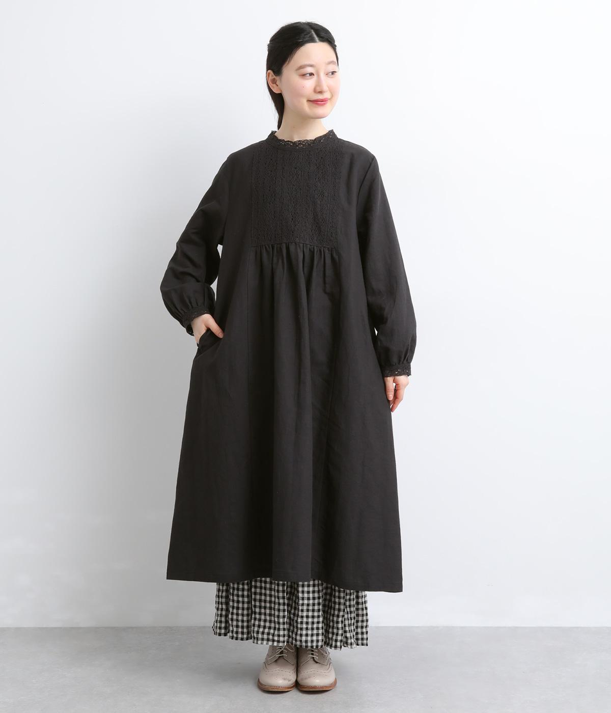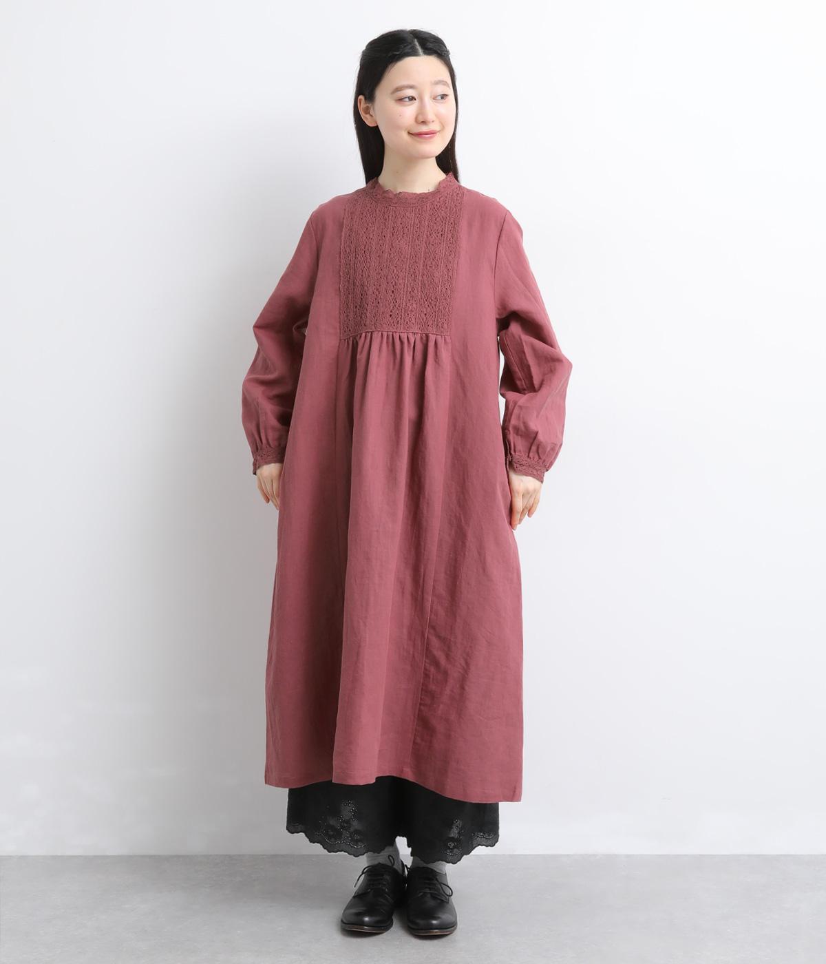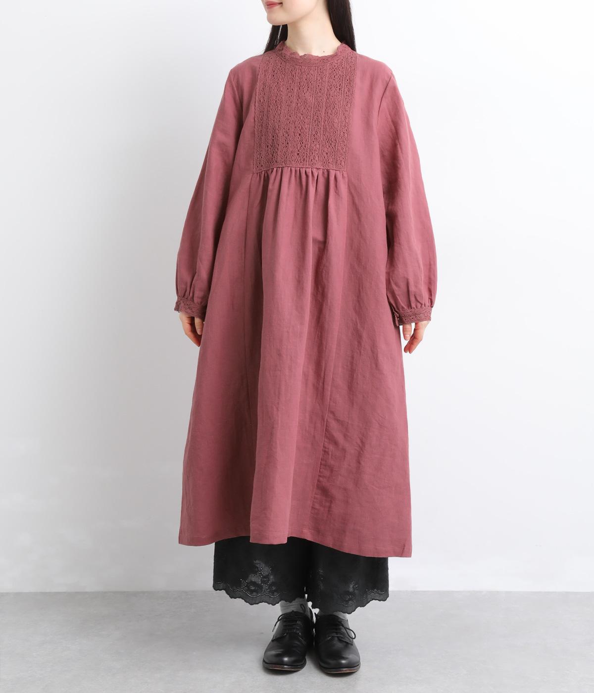 繊細なレースを重ねたフロントデザインが、やさしい華やぎを添えるワンピースです。レースの軽やかな表情が、フェミニンな雰囲気を演出します。胸下の切り替えと袖口にギャザーを寄せ、シルエットにふんわりとした丸みを持たせました。背面はボタン仕様で、着脱のしやすさにも配慮しています。