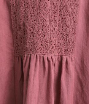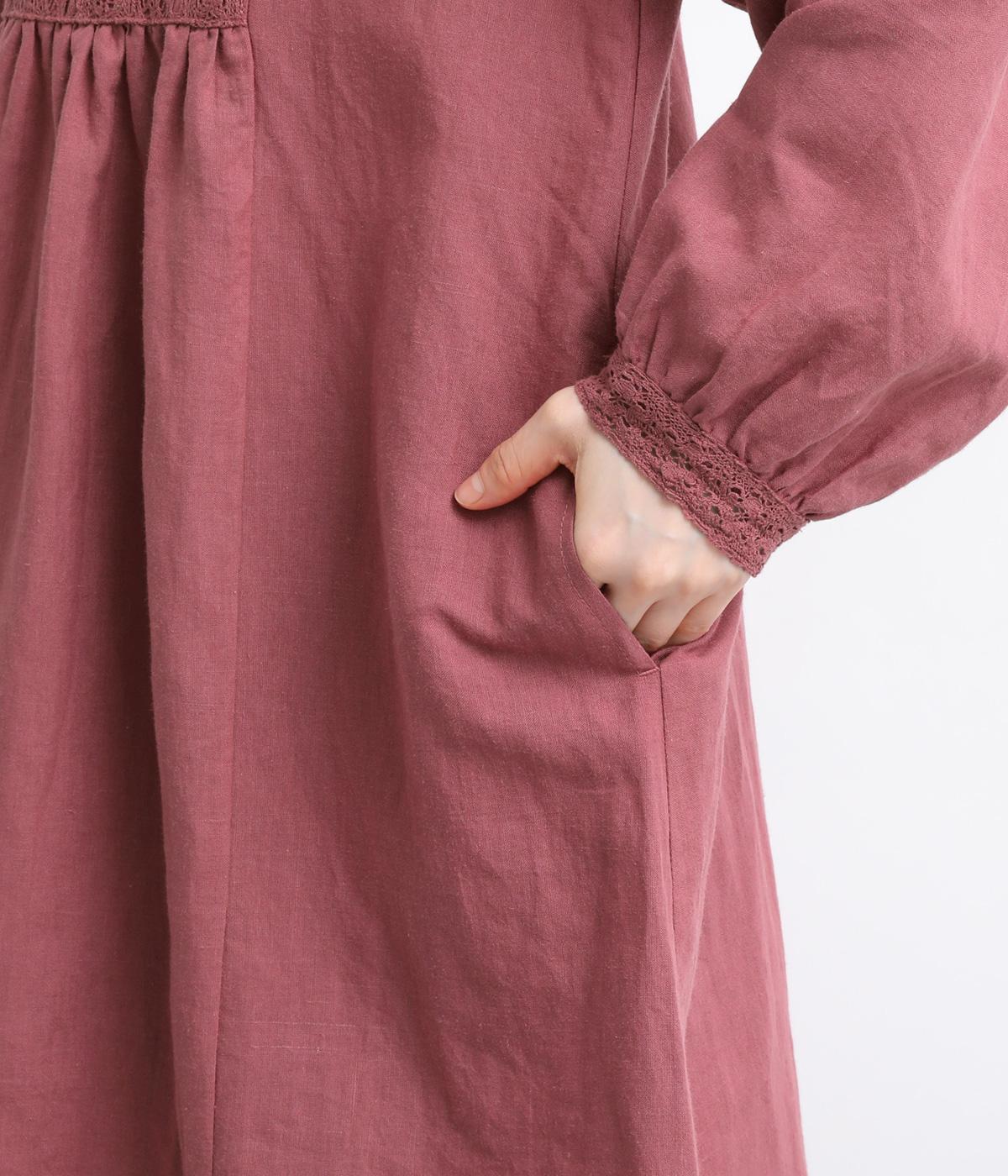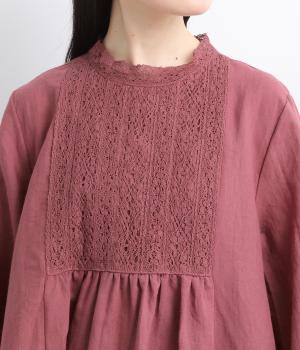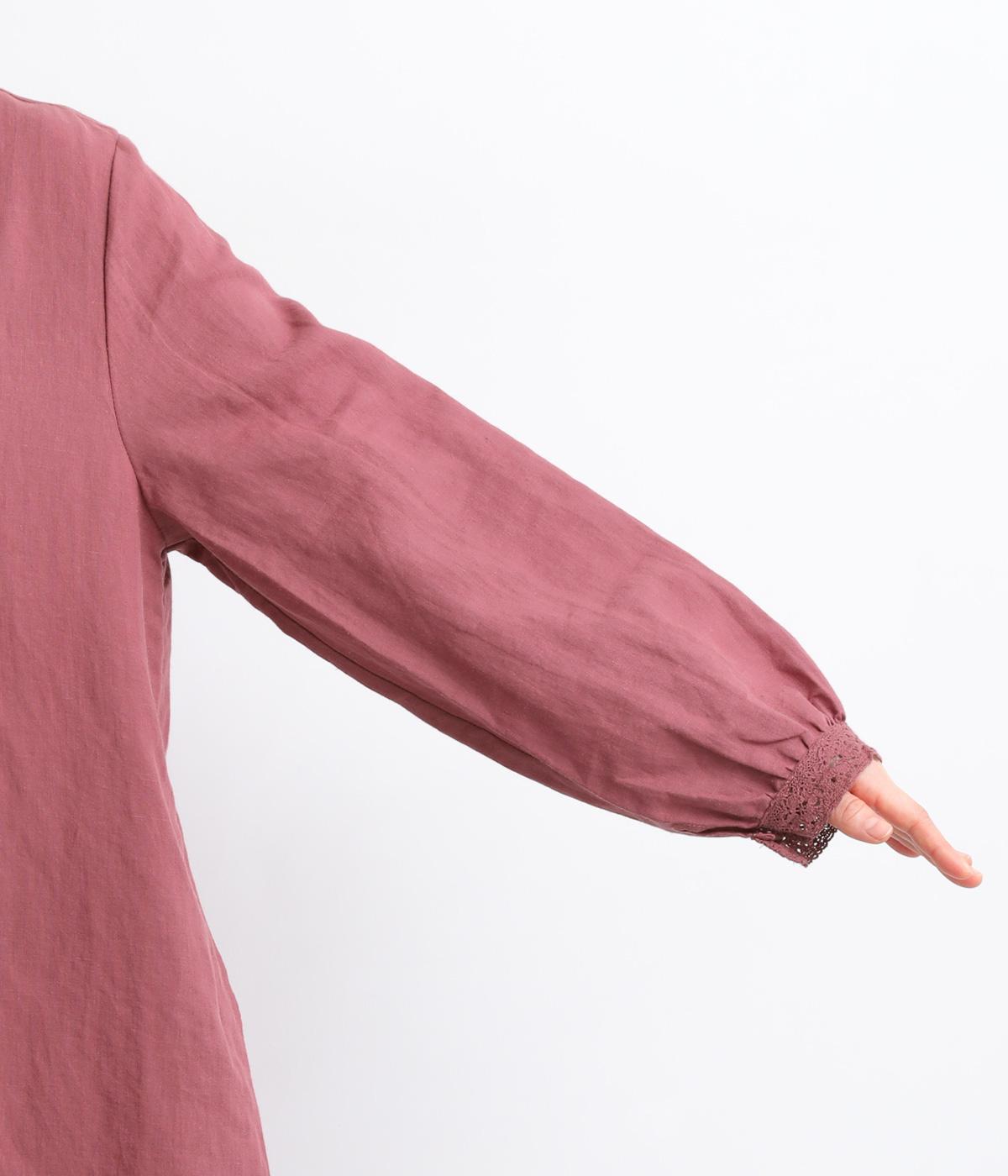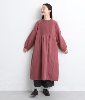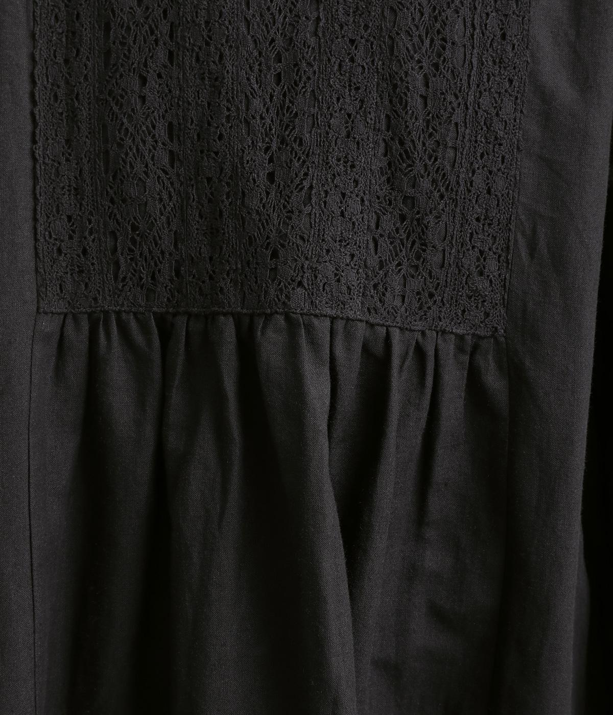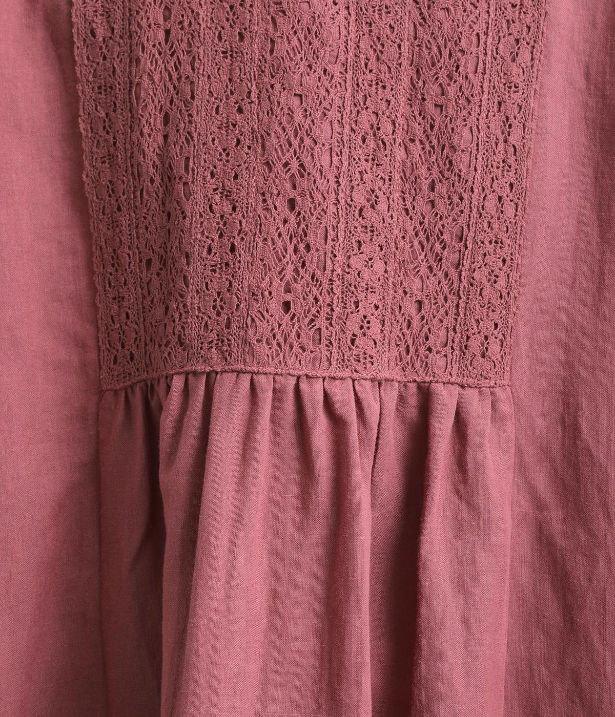 繊細なレースを重ねたフロントデザインが、やさしい華やぎを添えるワンピースです。レースの軽やかな表情が、フェミニンな雰囲気を演出します。胸下の切り替えと袖口にギャザーを寄せ、シルエットにふんわりとした丸みを持たせました。背面はボタン仕様で、着脱のしやすさにも配慮しています。
