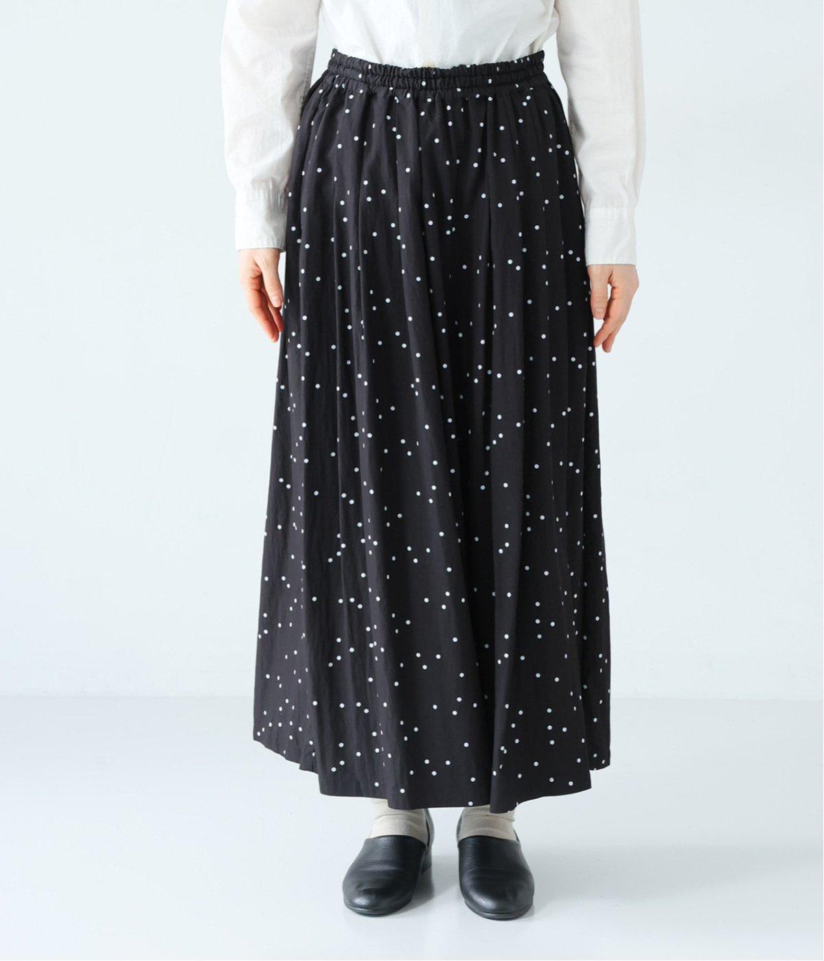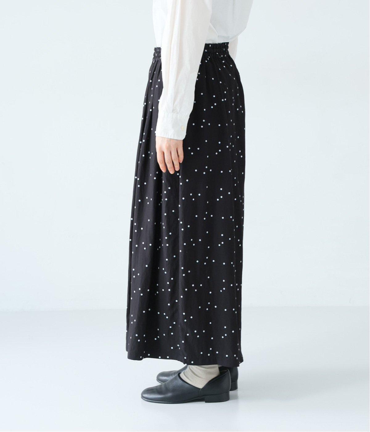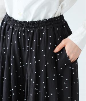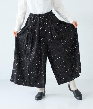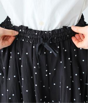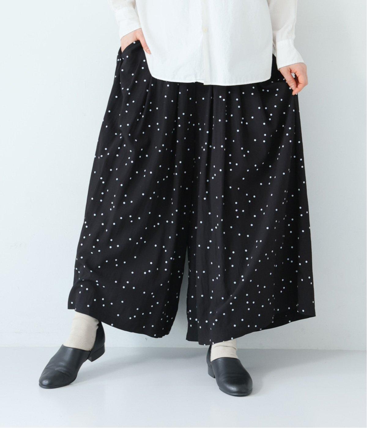 ランダムに散りばめたドット柄が大人かわいいギャザーパンツ。腰まわりのタックが優雅なドレープをうみ、スカート見えしつつも動きやすいデザインに仕上がっています。両サイドには便利なポケットつき。総ゴム仕様のウエストに内紐をプラスしました。