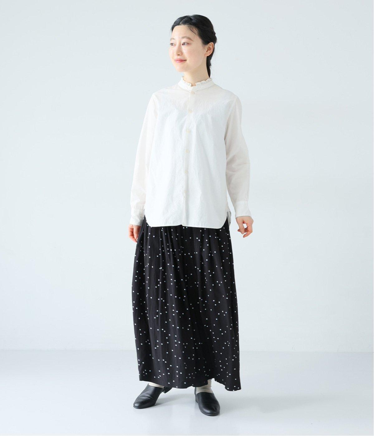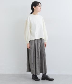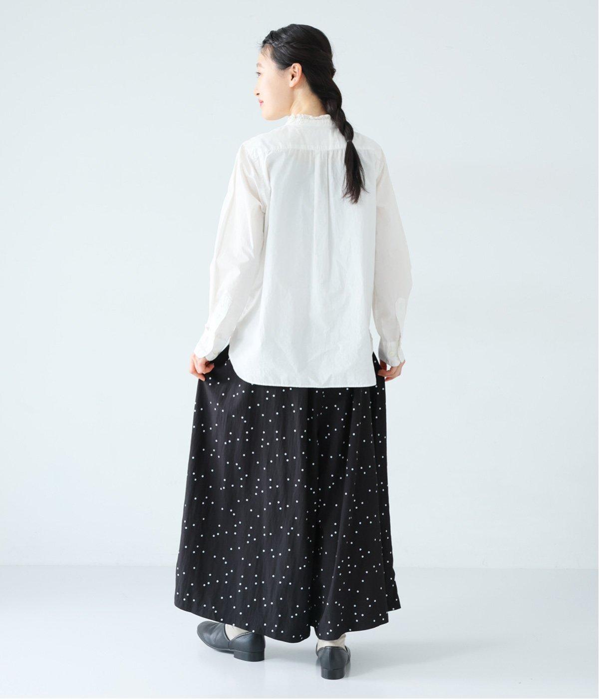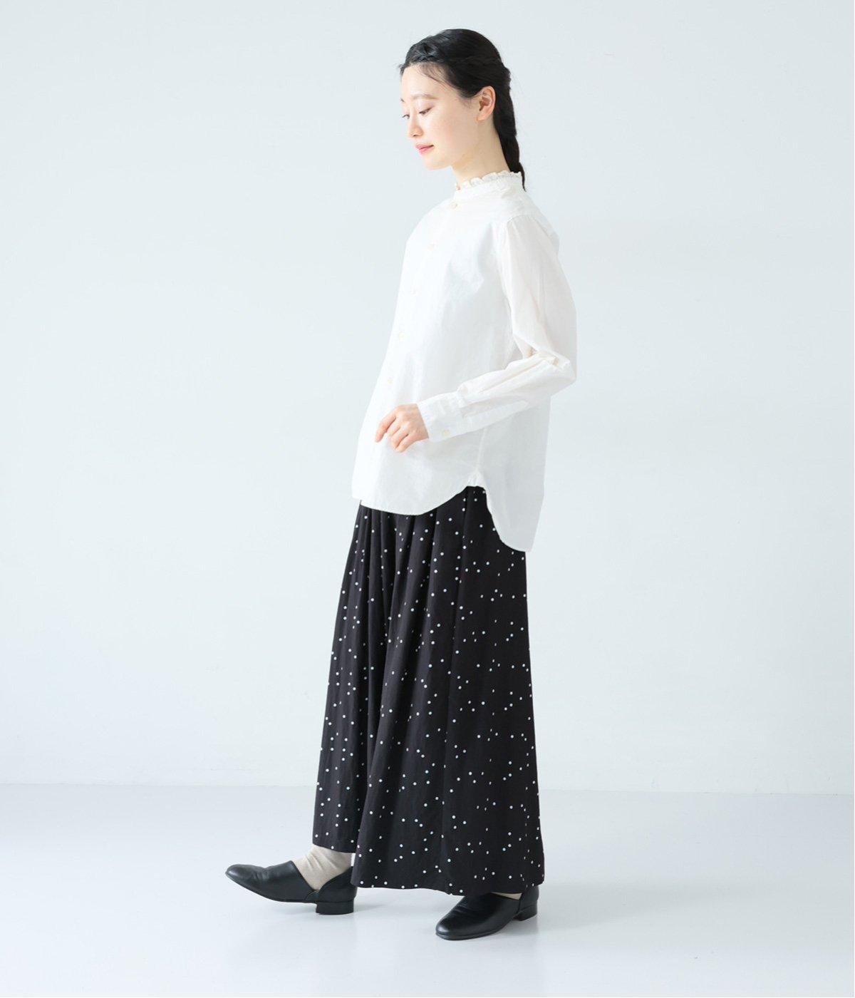 ランダムに散りばめたドット柄が大人かわいいギャザーパンツ。腰まわりのタックが優雅なドレープをうみ、スカート見えしつつも動きやすいデザインに仕上がっています。両サイドには便利なポケットつき。総ゴム仕様のウエストに内紐をプラスしました。
