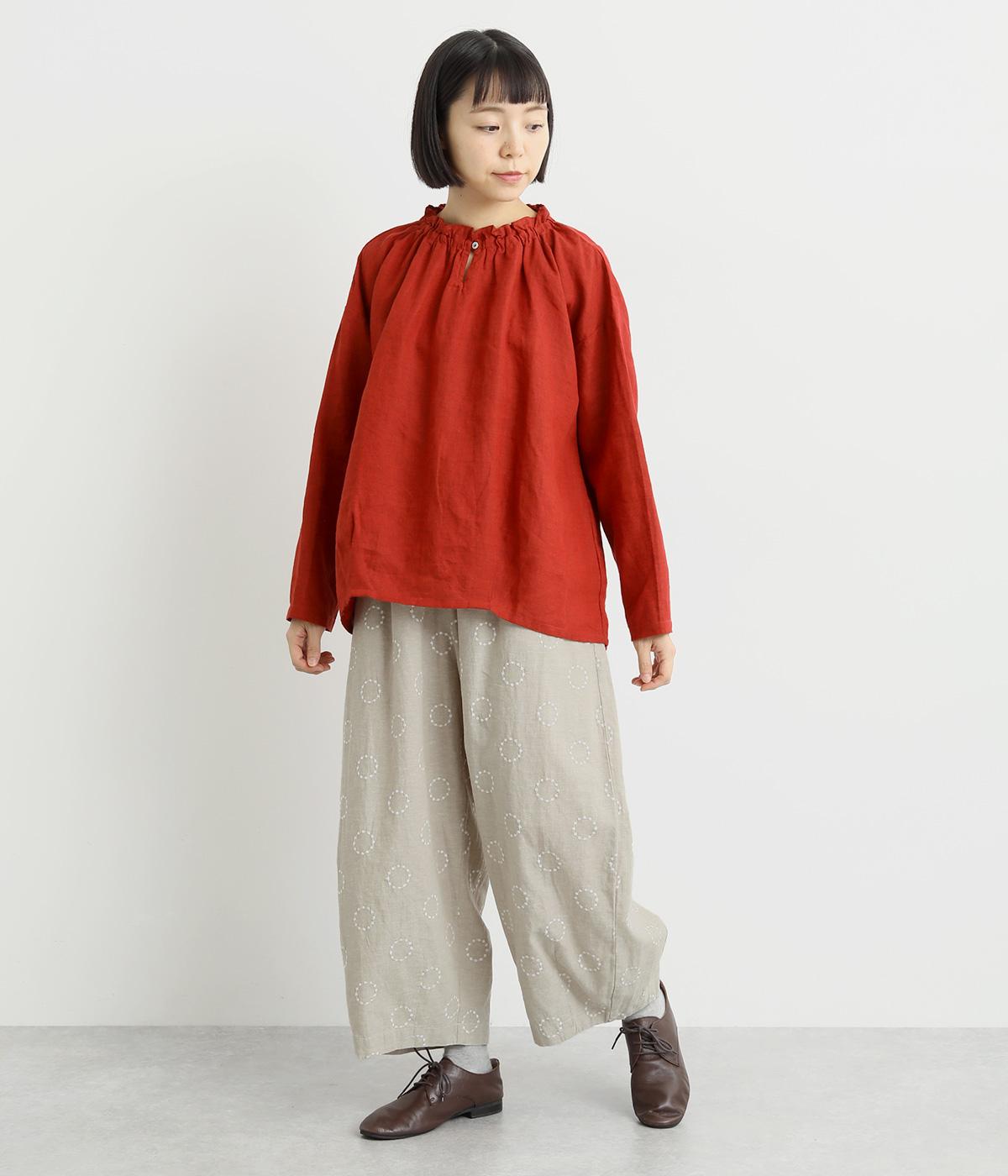 コットン×リネンの先染め素材にサークル刺しゅうをほどこしたこだわりの素材を使用。ナチュラルな風合いにさらりとした軽やかな肌触りが◎。薄めの中厚手生地ではき心地も快適です。