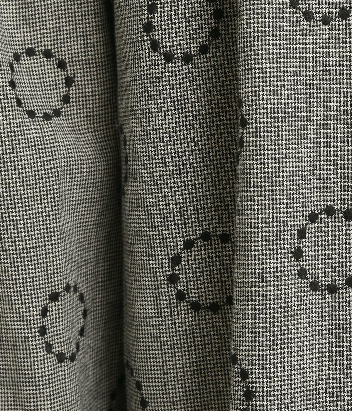 サークル柄の刺しゅうがナチュラルスタイルにほどよくアクセントをきかせてくれます。裾ダーツでコクーンシルエットに仕上げ、ゆとりがありながらもすっきりとスタイリングしやすくまとめました。ウエストは総ゴムに内紐つき。