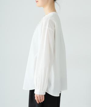 甘さ控えめのタックフリルデザインが目を引くブラウス。バックネックのギャザーで後ろ姿にも華やかさを添えました。やわらかな印象にまとめるラウンドヘムが◎。カジュアルにもきれいめにも合わせやすく、インナーとしても重宝します。