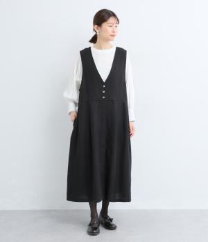 【素材】さらりと清涼感のある肌ざわりが特徴の、リネンとコットンのミックス生地を使用しています。ネップのあるやさしい風合いが魅力です。【デザイン】ほどよいハリできちんと見えする前後着の2wayジャンパースカートです。普段使いからフォーマルまで幅広く着用いただけます。ウエストの切り替えから比翼仕立ての前開き仕様で、前を開けて羽織るスタイリングもおすすめです。