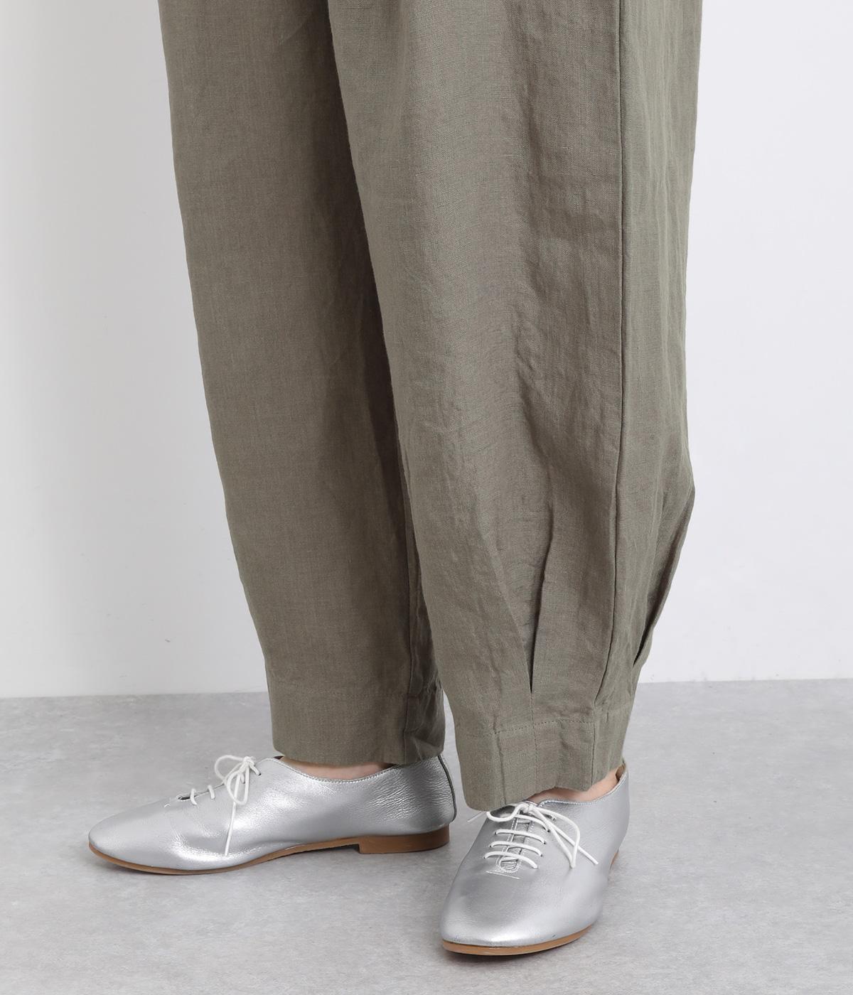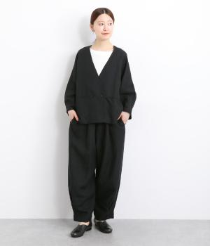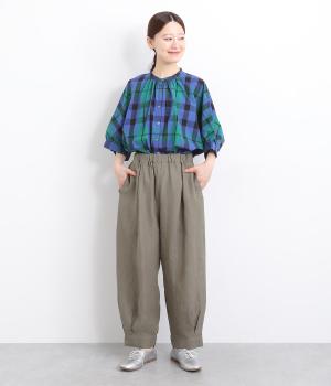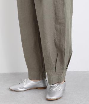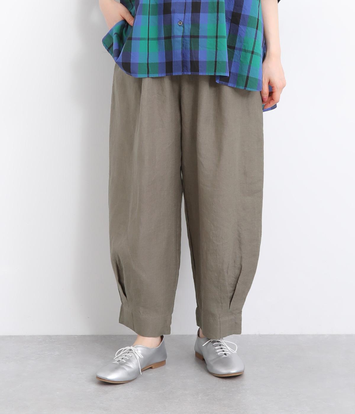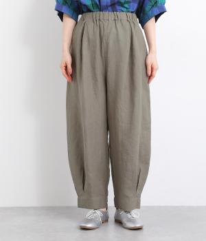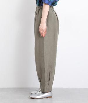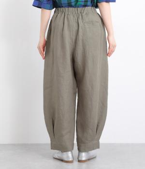 ワタリ幅をゆったりとり。裾タックで立体感をつけたコクーンシルエットパンツです。裾カフスのようにみせてすっきりとシューズ合わせしやすい丈感にこだわりました。ウエストは総ゴムに内紐つきでフィット感も◎。
